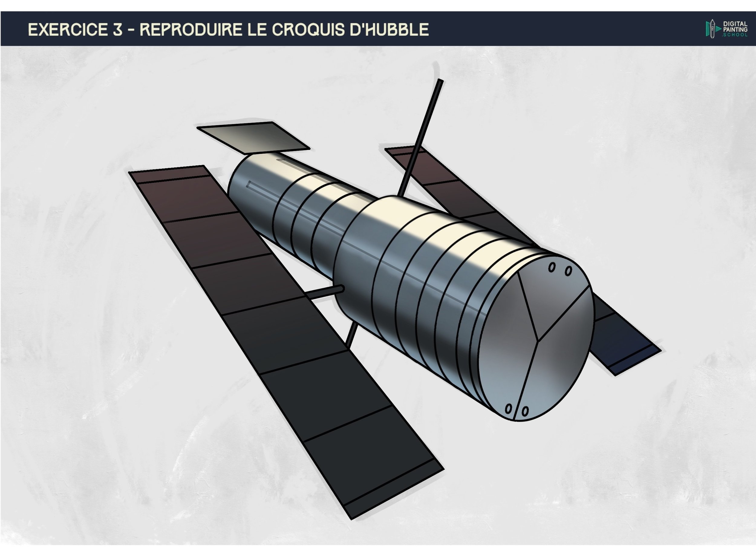 Salut! Pour le premier exo, on voit quelques tremblements encore, n'hésite pas à tourner ton document pour faire les courbes dans le sens qui t'arrange. Et pour le hubble j'ai l'impression que les ellipses sur le cylindre du fond ne sont pas dans la perspective. Bon brush1 point