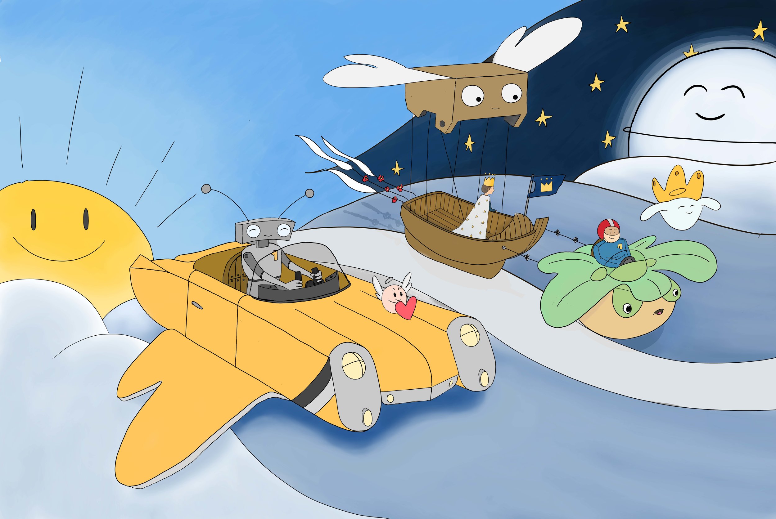 Hello, Me revoilà enfin ! Voici donc la deuxième image, cette fois-ci entièrement tiré de mon imagination. C'est une scène avec plusieurs personnages naviguant dans les nuages. (avec un taxi volant, un jeune roi, une lune, un soleil, un insigne de voiture personnalisée nouvelle génération, un robot, un bateau, une boîte volante avec des ailes, ...) j'aurais pu continuer mais je dus m'arrêter là haha 😄 Je n'ai pas été loin dans les détails, ni dans les textures pour éviter de perdre trop de temps car j'ai ralentit mon avancement à cause de mon boulot , malheureusement, ... 😞 j'ai conscience que j'ai encore un long chemin à parcourir pour atteindre un bon niveau, mais je me décourage pas ! Bonne soirée à tous !1 point