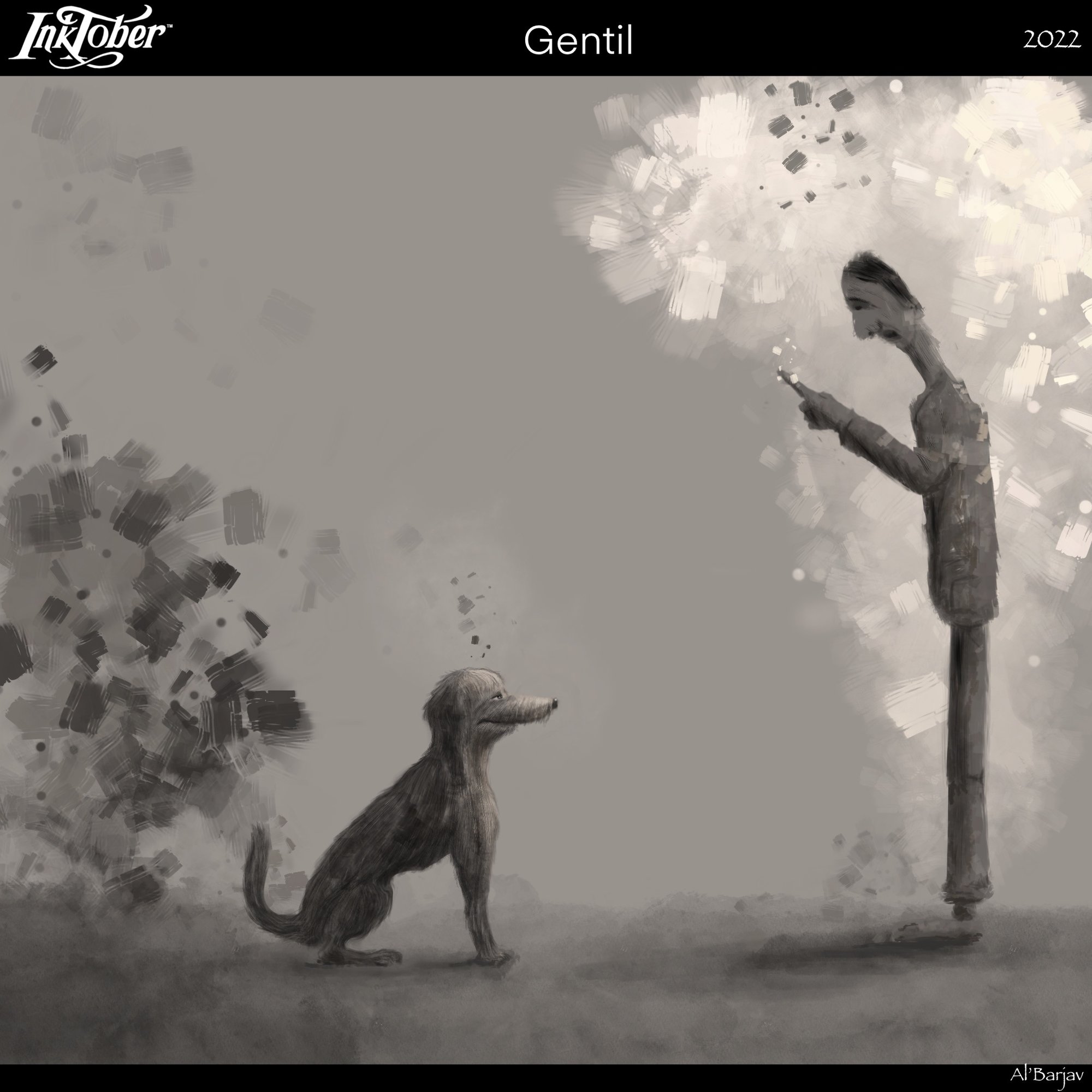 Hello les gentils. Pas simple le thème du jour. Je me suis astreint à faire sans ligne, directement les masses et sans réf, chien d’imagination. Du coup il est un peu racho, mais bon, il apprendra à vivre avec ..et puis, « Gentil le chien ». J’avais pensé à une autre injonction du type « sois Gentil », « il faut être gentil » (ne rien dire ) mais c’était trop compliqué. Je repasse ce soir pour les commentaires.21 points