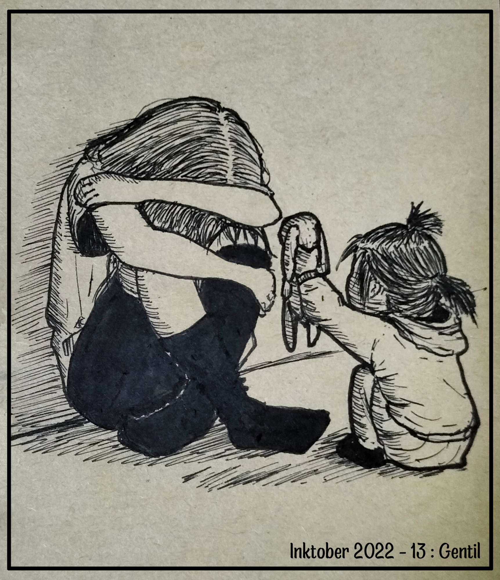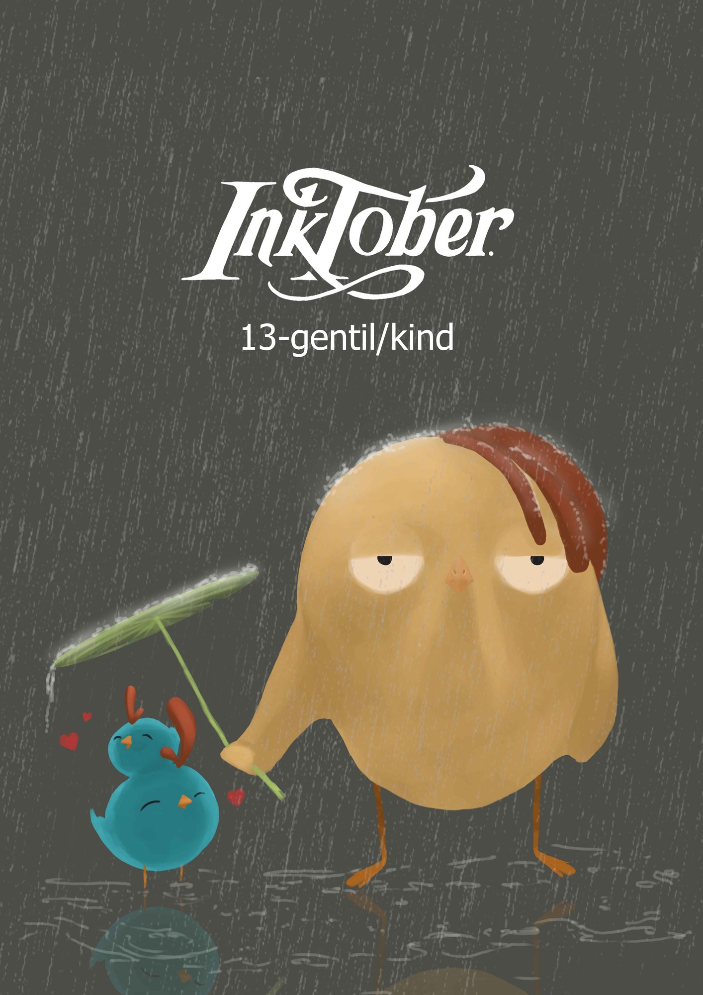Bonsoir les artistes, @oceane13j'aime beaucoup le côté très épuré avec des couleurs très pastel, ça nous ramène en enfance. C'est très choupi. Je dirai que le bleu est un poil trop saturé (mais ça peut-etre une histoire d'écran de pc...) @Quardannault et bien l'étude est réussie, les mains sont bien réalisées. Par contre je vois le verre à moitié vide de mon côté 😅 lorsque je regarde l'image je vois davantage des mains en train de supplier qu'on les aide, mais bien trop de mains pour être aidées 😞 @ApostroKe très choux 😍 @gohlgrinmBon j'ai déjà commenté du facebook, mais j'aime beaucoup comment tu a réalisé les gouttes d'eau qui "sautent" sur la tête et le parapluie @jolypunk Well ... c'est glauque, mais marrant. Je trouve tes jeux de textures toujours ultra interessants @Ayaneth le bichromique toujours aussi réussi on distingue bien les formes. Et c'est très mignon @stefou tu as le don de provoquer des émotions, en tout cas avec moi ça marche 😅. et en plus c'est hyper bien réalisé à chaque fois avec un bel équilibre des couleurs. @SKARRJoli décalage, ne jamais se fier aux apparences 🙂 @Sylvus Très mignon, j'aurais peut-être éclaircit davantage l'arrière plan pour mieux faire ressortir cette petit tête @Saule C'est fort. Bon courage aux générations futures @lykoska très jolie étude Gros revirement de style dans mon inktober, je sentais la démotivation arriver donc je me suis dis qu'un petit revirement me reboosterait. Et ca marche !9 points