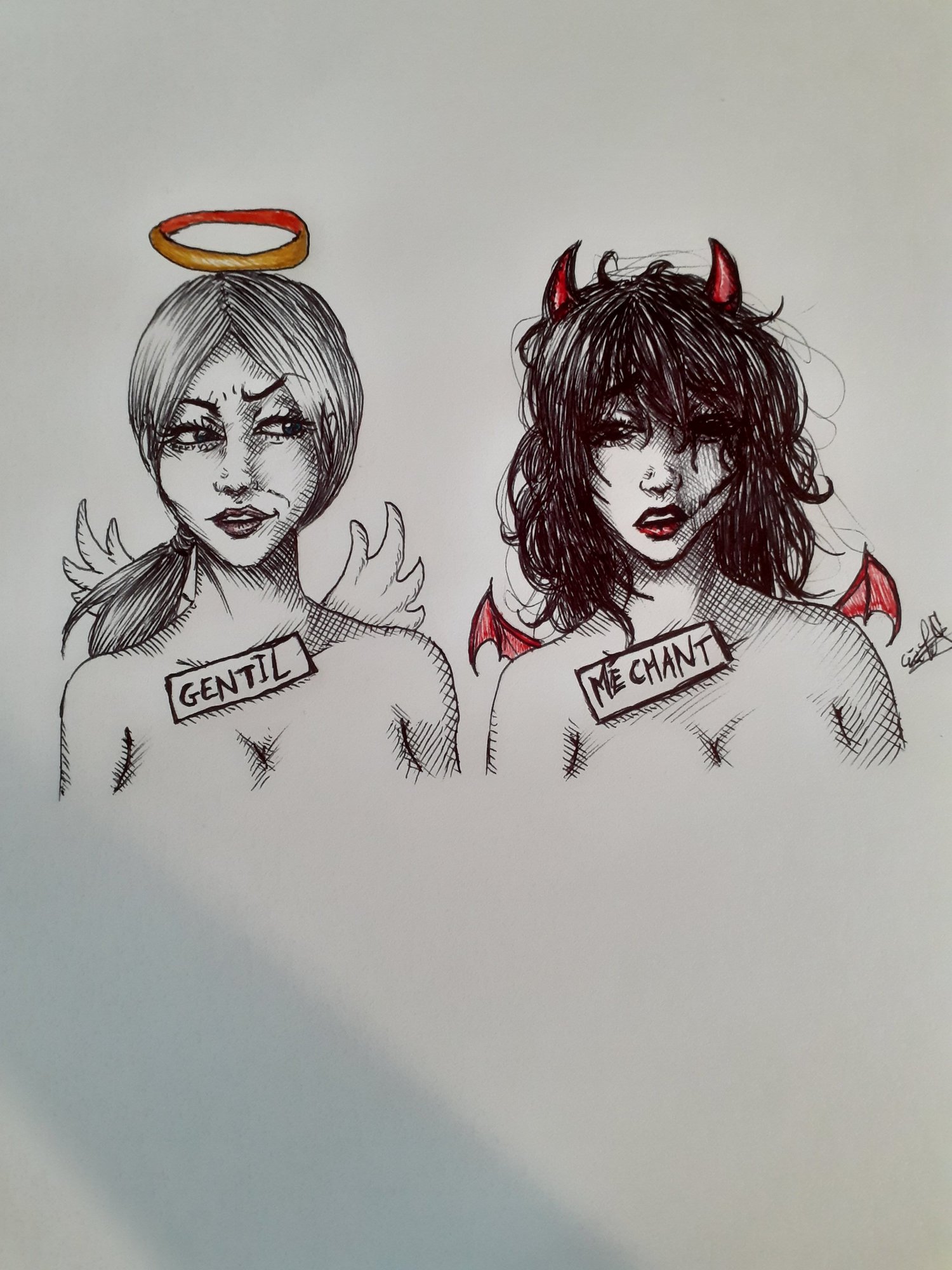 Bonjour à tous! Je repasserai plus tard pour les retours...^^ En attendant je voulais parler de ce dessin, je ne veux offenser personne avec cette représentation d'ange et demon. Je voulais juste exprimer le mot gentil en précisant que les apparences peuvent etre trompeuse. C'est un gros résumé mais voila^^ Bon courage à tous pour ce challenge^^14 points