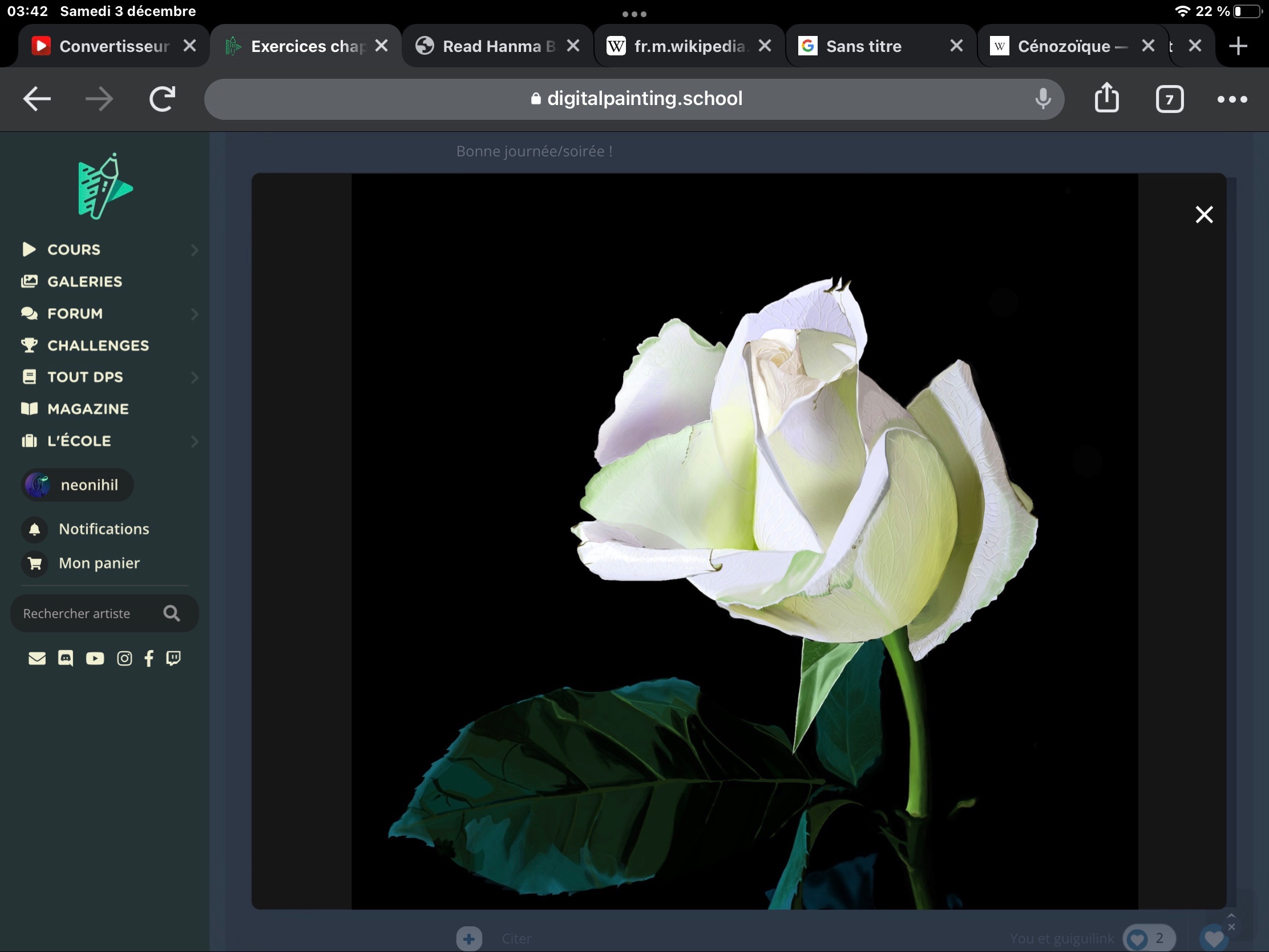 Avec plaisir, c’est chouette de voir des membres aussi impliqués !! Alors j’ai fais quelques essais de mon côté, et le meilleur moyen d’assombrir subtilement que j’ai trouvé est très simple : Sélectionner une zone à assombrir au lasso, prendre un brush soft, et sur un nouveau calque (en dessus de tout les autres), appliquer la nouvelle nuance recherchée :3 Si tu regardes bien, tu verras que certaines zones manquent de violet, d’autres de vert ou de jeune, et ce sont ces couleurs qui vont assombrir le tout ! Mais tu dois bien sélectionner ces zones individuellement :3 Assombris bien le tout, et ensuite, sur un nouveau calque, ajoute des zones de blanc :3 Parceque c’est aussi le blanc qui crée le contraste, et le tiens n’est pas toujours bien placé :3 Astuce qui a son importance : Pour ne pas perdre le détail de ta rose, mets ce calque en mode de fusion Multiplier ; ainsi il n’effacera pas les détails en dessous, et prendra en compte ce que tu as déjà peint :3 Mais c’est pour ça que tu dois créer un calque pour le blanc à part, parceque le blanc sur un calque « Multiplier », par dessus une couleur claire est trop affaibli :3 Cette astuce te permettra aussi de retravailler un coup ton lasso, parceque pour être efficace tu dois utiliser un brush soft très grand, on ne doit pas voir tes coups de pinceau, donc en réglant l’opacité et en sélectionnant bien les zones, tu seras très efficace ! Edit : Je ne l’ai pas précisé, mais si cette technique fonctionne ici, ce ne sera pas le cas partout, le mode multiplier fonctionne bien pour ajouter des couleurs sombres sur un environnement clair et peu saturé, mais dès lors qu’il s’agit d’ajouter des couleurs saturées sur d’autres, il aura tendance à créer une masse noire car il va superposer les nuances si je ne me trompe pas. Alors, il faudra se tourner sur d’autres modes de fusion, comme le mode Nuance qui permet de changer la « couleur » en gardant les mêmes valeurs, ou d’autres en fonction de la situation, mais tu auras tout le temps de découvrir ça, je pense, dans les chapitres dédiés à la couleur et la colorisation 😉 Je me suis permis d’utiliser grossièrement cette technique sur ta rose pour la tester (je savais qu’elle fonctionnait en théorie, mais je n’avais jamais utilisé le calque Multiplier comme ça, d’habitude il me sert à garder mon croquis net), et en 5/6 minutes j’ai eu ce résultat (Ne regarde pas si tu veux d’abord tester de ton côté !!) :3 Courage, continues !! :31 point