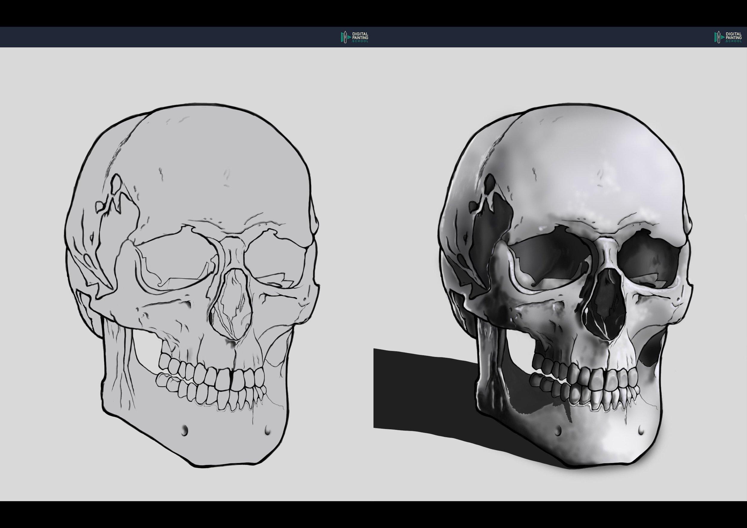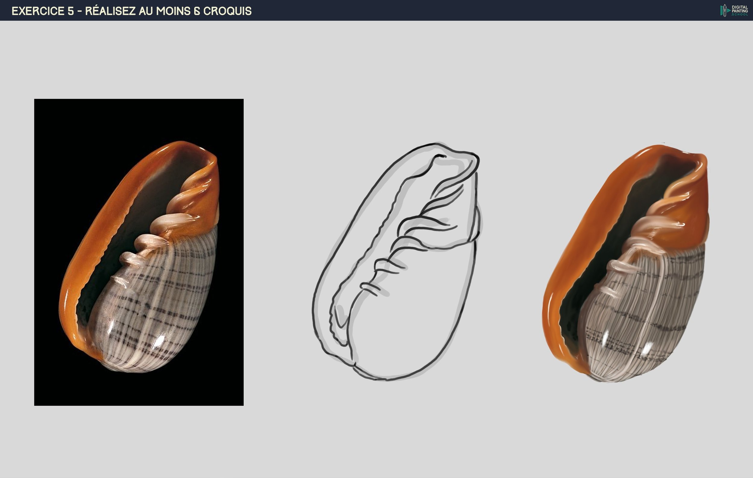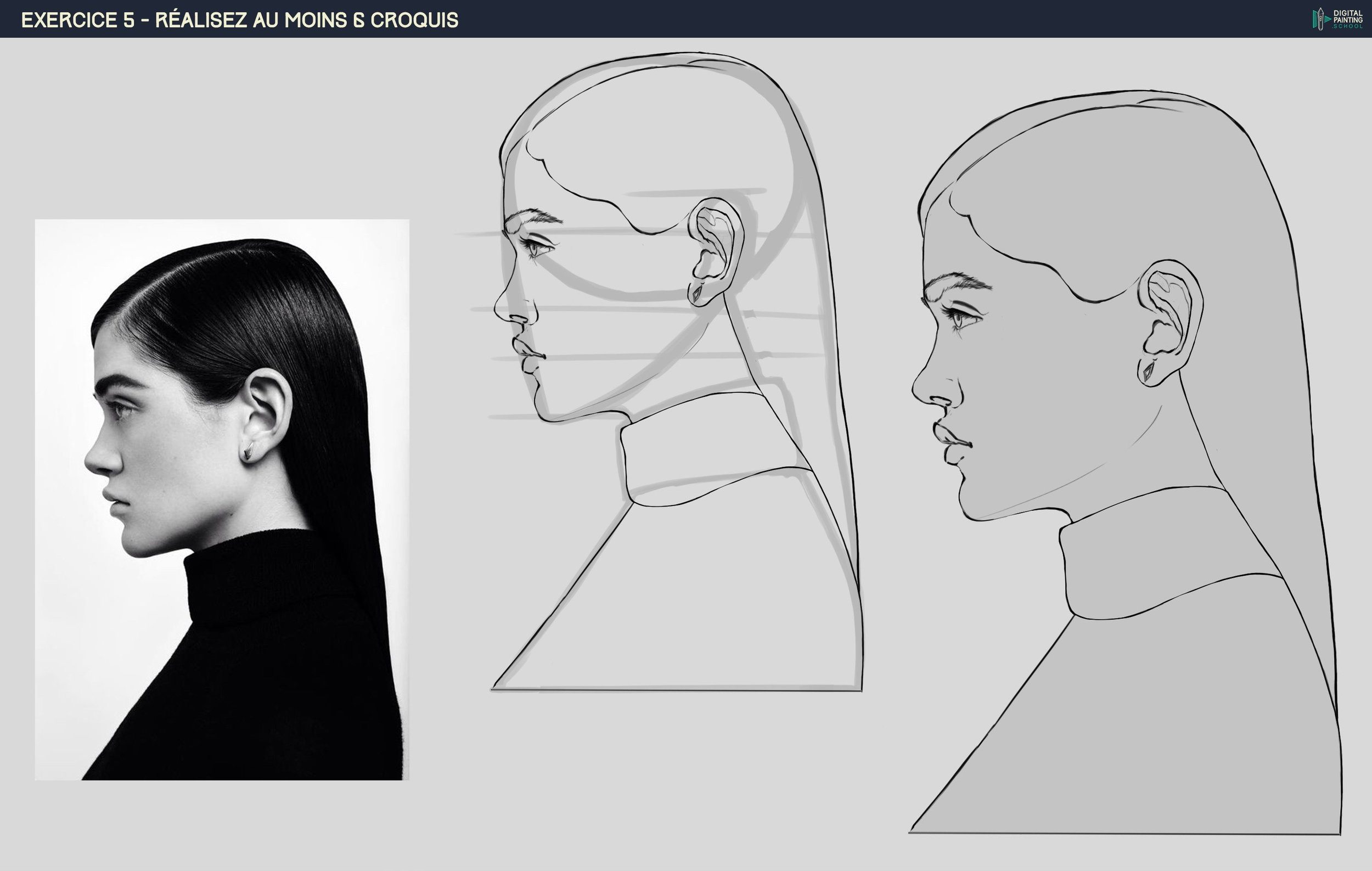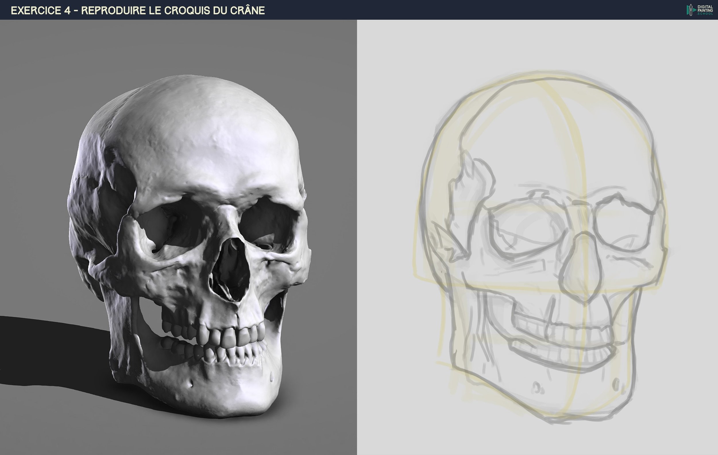 Bonsoir à tous. Je poste enfin quelques exo de ce chapitre. Pour le crane je n'ai pas fait de trames, car je ne maitrise pas du tout cette technique, je trouvais que ça gâchait tout, ( alors que ça peut faire des merveilles, par exemple le travail de l'artiste Villarrte, je suis à chaque foi en admiration devant ses Sketches ) j'ai donc préféré mettre un peu de valeur avec le brush smooth. Pour l'exercice des croquis je me suis permise de choisir d'autres références. Je trouve vraiment difficile de donner du "charme" a un croquis en digital, au tant c'est plus facile pour gérer les proportions, perspective etc vu qu'on peut modifier à l'infinie Tandis que la spontanéité sur du papier et la sensation avec le crayon, est plus agréable je trouve. Bon je m'égare mais je pense qu'avec le temps et surtout de l'entrainement je serais plus satisfaite. La plus grande difficulté a été les mains de la femme, la position est vraiment complexe, finalement j'ai vu que en faisant directement un aplat de la forme de la main cela m'aidait à être un peu plus juste, que de faire directement le tracé. Mais bon c'est toujours pas ça... Pour les deux dernières références j'ai préféré pousser sur le painting.2 points