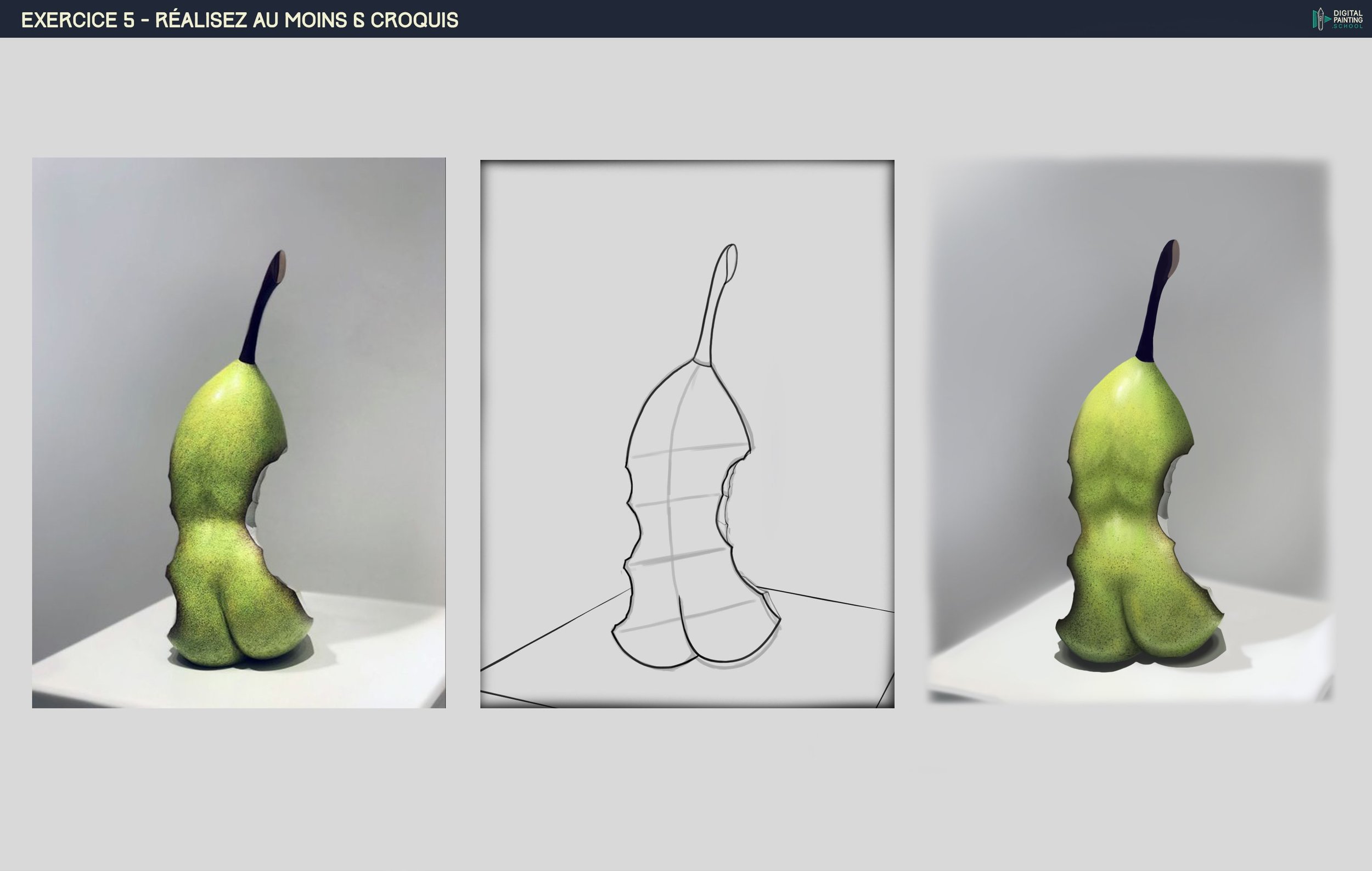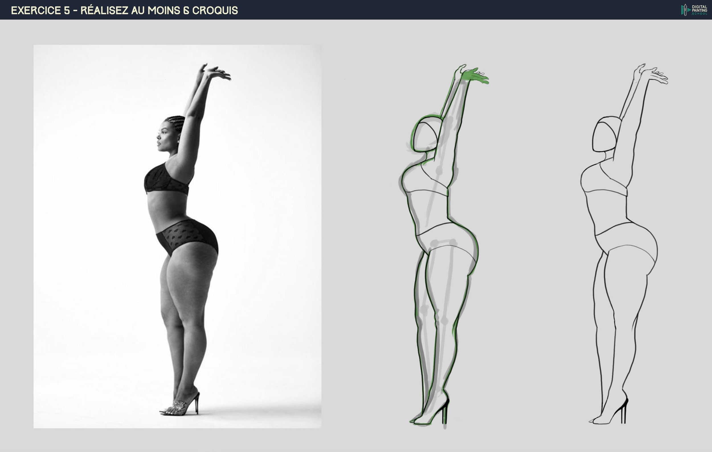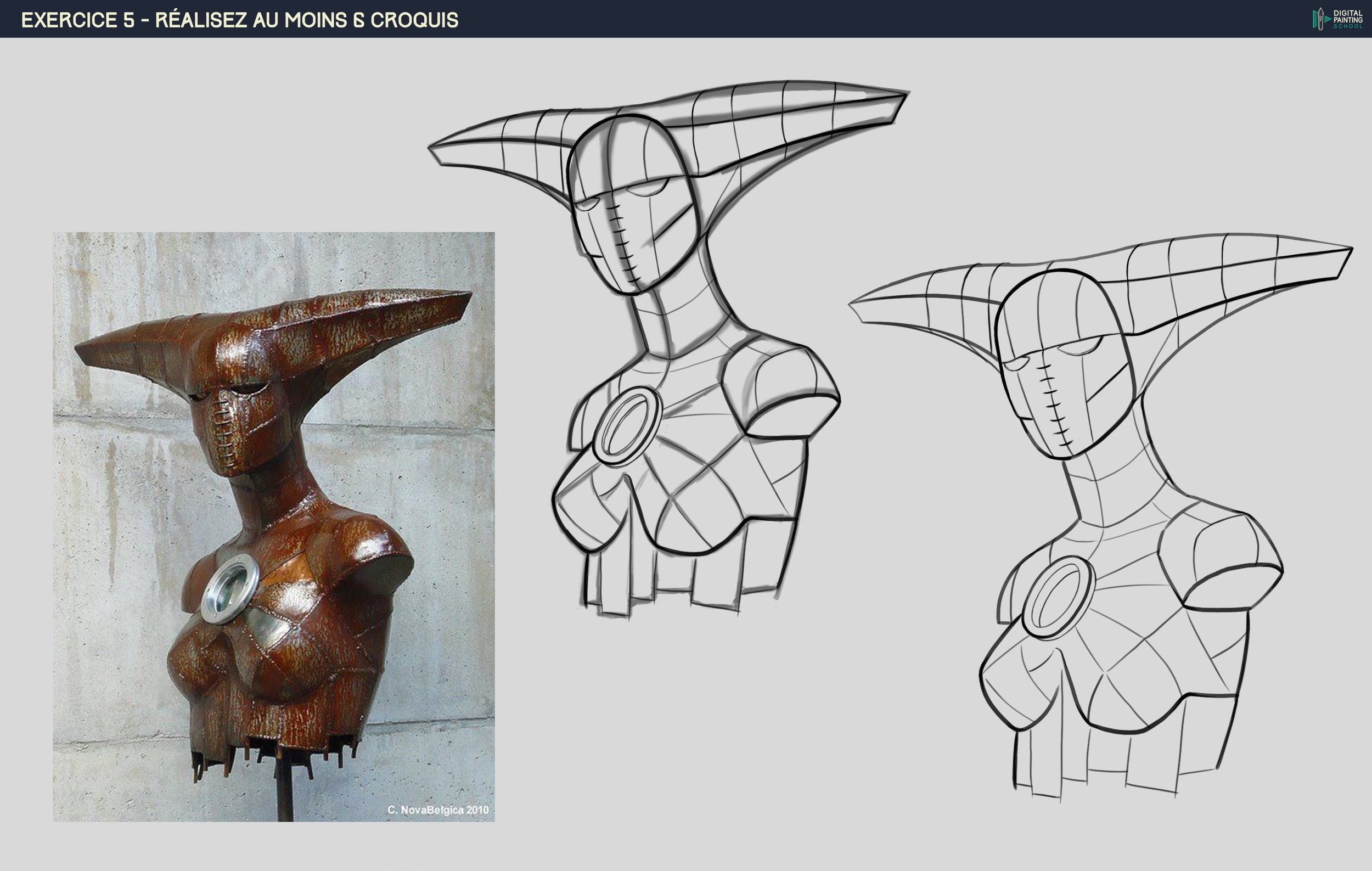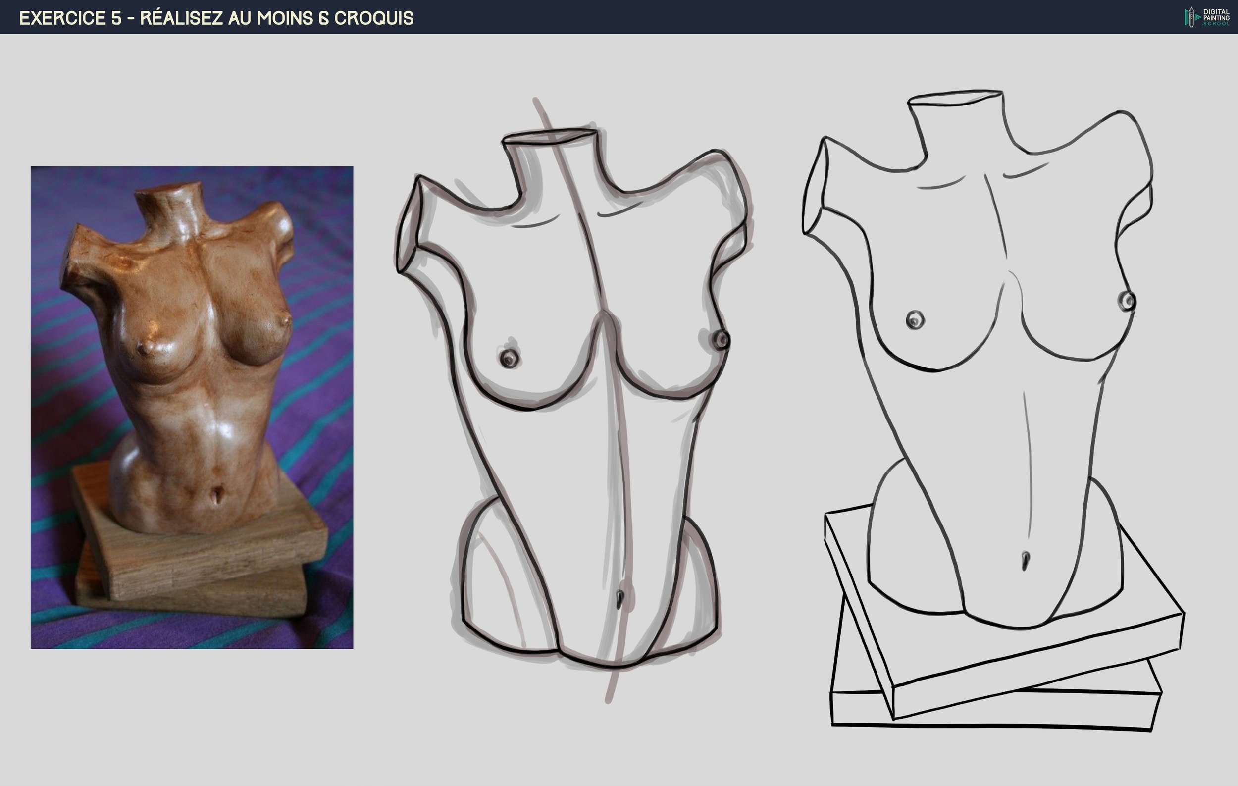 Bonsoir à tous. Je poste enfin quelques exo de ce chapitre. Pour le crane je n'ai pas fait de trames, car je ne maitrise pas du tout cette technique, je trouvais que ça gâchait tout, ( alors que ça peut faire des merveilles, par exemple le travail de l'artiste Villarrte, je suis à chaque foi en admiration devant ses Sketches ) j'ai donc préféré mettre un peu de valeur avec le brush smooth. Pour l'exercice des croquis je me suis permise de choisir d'autres références. Je trouve vraiment difficile de donner du "charme" a un croquis en digital, au tant c'est plus facile pour gérer les proportions, perspective etc vu qu'on peut modifier à l'infinie Tandis que la spontanéité sur du papier et la sensation avec le crayon, est plus agréable je trouve. Bon je m'égare mais je pense qu'avec le temps et surtout de l'entrainement je serais plus satisfaite. La plus grande difficulté a été les mains de la femme, la position est vraiment complexe, finalement j'ai vu que en faisant directement un aplat de la forme de la main cela m'aidait à être un peu plus juste, que de faire directement le tracé. Mais bon c'est toujours pas ça... Pour les deux dernières références j'ai préféré pousser sur le painting.2 points