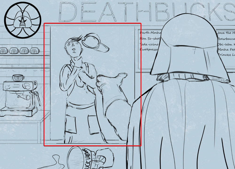 Ça comment à être vraiment cool ton croquis perso ! J'adore les noms que tu as rajoutés, un Obi-wan kenoffee pour moi stp 😄 Il manque un peu de volume et/ou d'habillage derrière le personnage, on devrait avoir une épaisseur de mur par exemple, apercevoir soit l'arrière-cuisine par exemple Ça me semble bien mieux! Tu peux continuer sur la suite 😄1 point