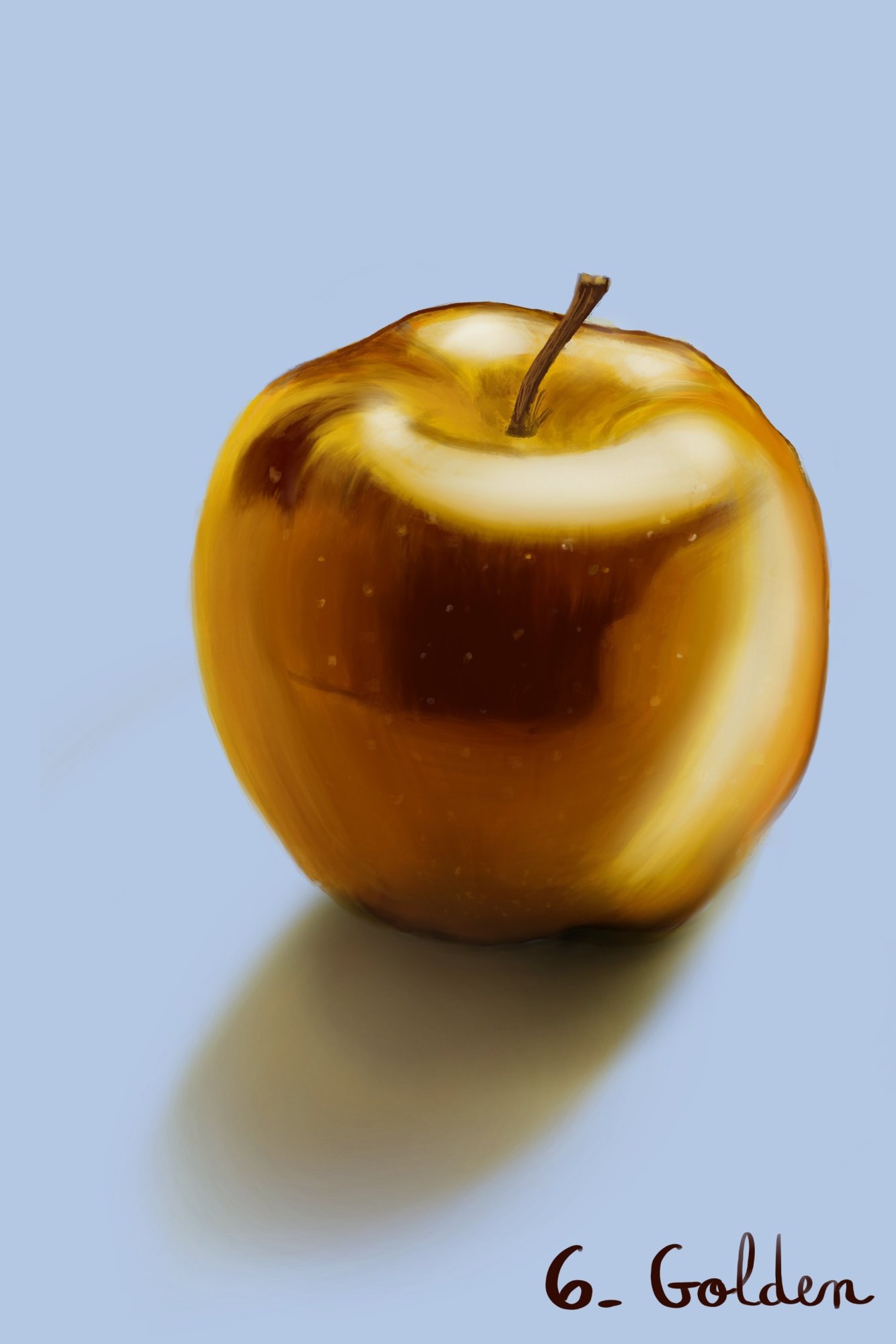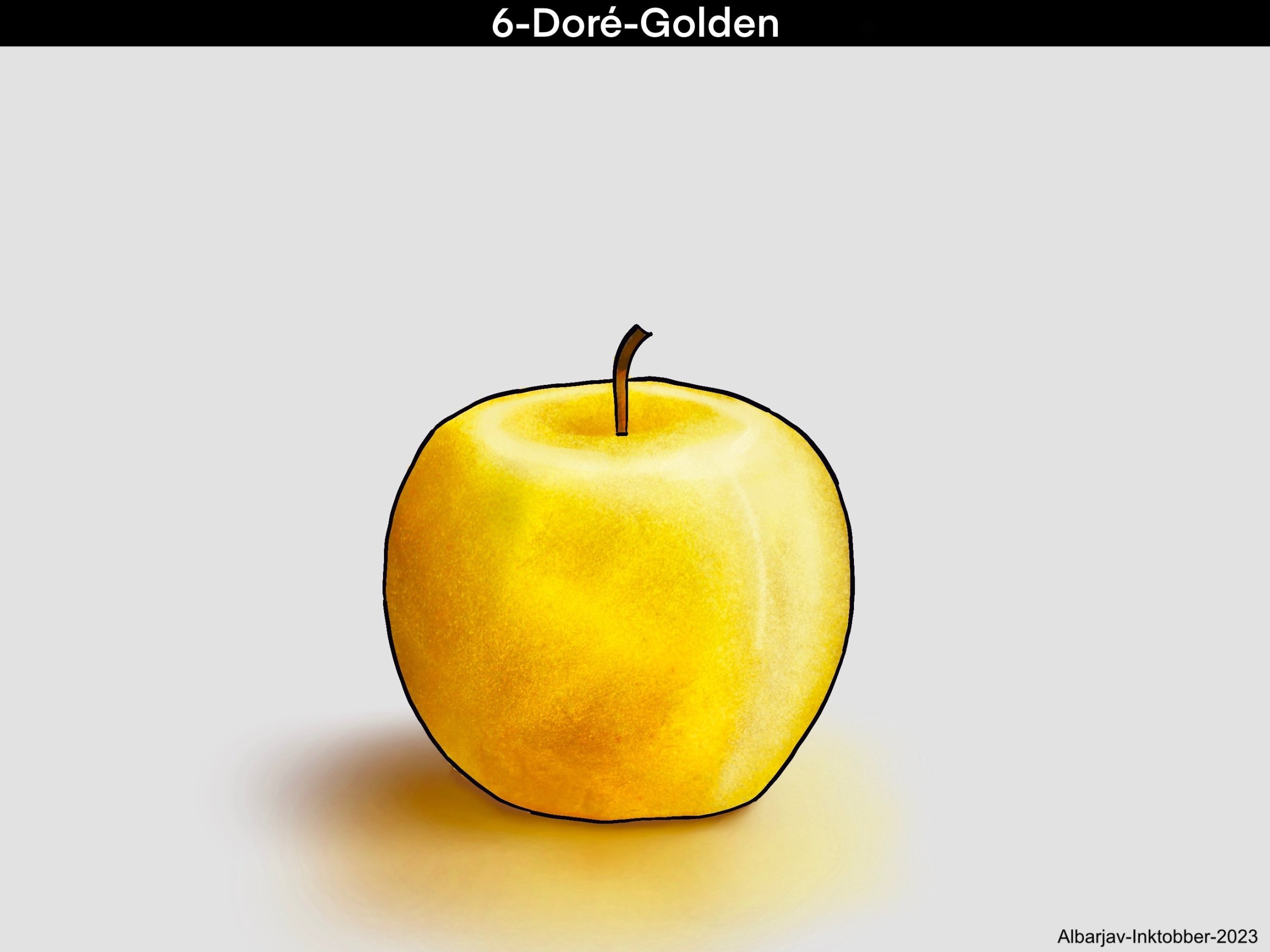 Hello. au début je suis parti avec l'idée de rendre un hommage, ou plus modestement de faire un clin d'oeil à Gustave Doré dont j'aime beaucoup les gravures. Mais, mais, les hachures c'est bien, mais ça ne s'improvise pas, je ne suis pas fort à ça, et ça bouffe du temps. Et les environnements, pas fort non plus. donc hier soir j'ai pensé à la pomme Golden et suis parti la dessus ce matin. Bien plus simple. je vous livre tout de même le premier inachevé et moche. c'st le jeu ;o) @Savadjatrès beau portrait , le doré de la peau reste très crédible. @Marco, ha oui, y a des contraintes comme ça qui brident tout de même un peu ;o) Néanmoins, sur le texte, tu t'en es bien sorti, on sent bien la surface brillante (bon, certes, qui pourrait aussi être du chrome...) @fabio ha, un menu golden servi avec le sourire, y a rien tel au petit déjeuner. @Darosan On se retrouve sur la golden. La tienne semble très convoitée @Deny j'adore l'avidité des visages des perso. et le chien qui hurle car il sent que ça pue cette histoire, ça va mal tourner... et bravo pour ton centième. je vais aller voir ça. @Pandigotrès joli, c'est doux, Comme quoi quelques hachures au bons endroits... va falloir que je m'y entraîne,. @Samaëlej'aime beaucoup tes dessins carnets de voyages, il y toujours une ambiance, on voyage. @ApostroKe ha, là on sent qu'il y a que le truc il fait son poids en or. Mais va savoir pourquoi, on a pas envie de le voler. comme une petite peur de représailles maléfiques... @daff ha oui, comme pour Marco, en N&B c'est chaud. Bon, on imagine l'or, mais le dessin est chouette, on sent de la force, de la détermination. @sagitrès joli, j'aime bien la bouille du perso @Emifei original et beau rendu de verre et voici ma pomme GOLDEN : et parce que vous avez été gentils, mon dessin MOCHE d'hier et INACHEVE (et ça vaut peut-être mieux en fait...21 points
