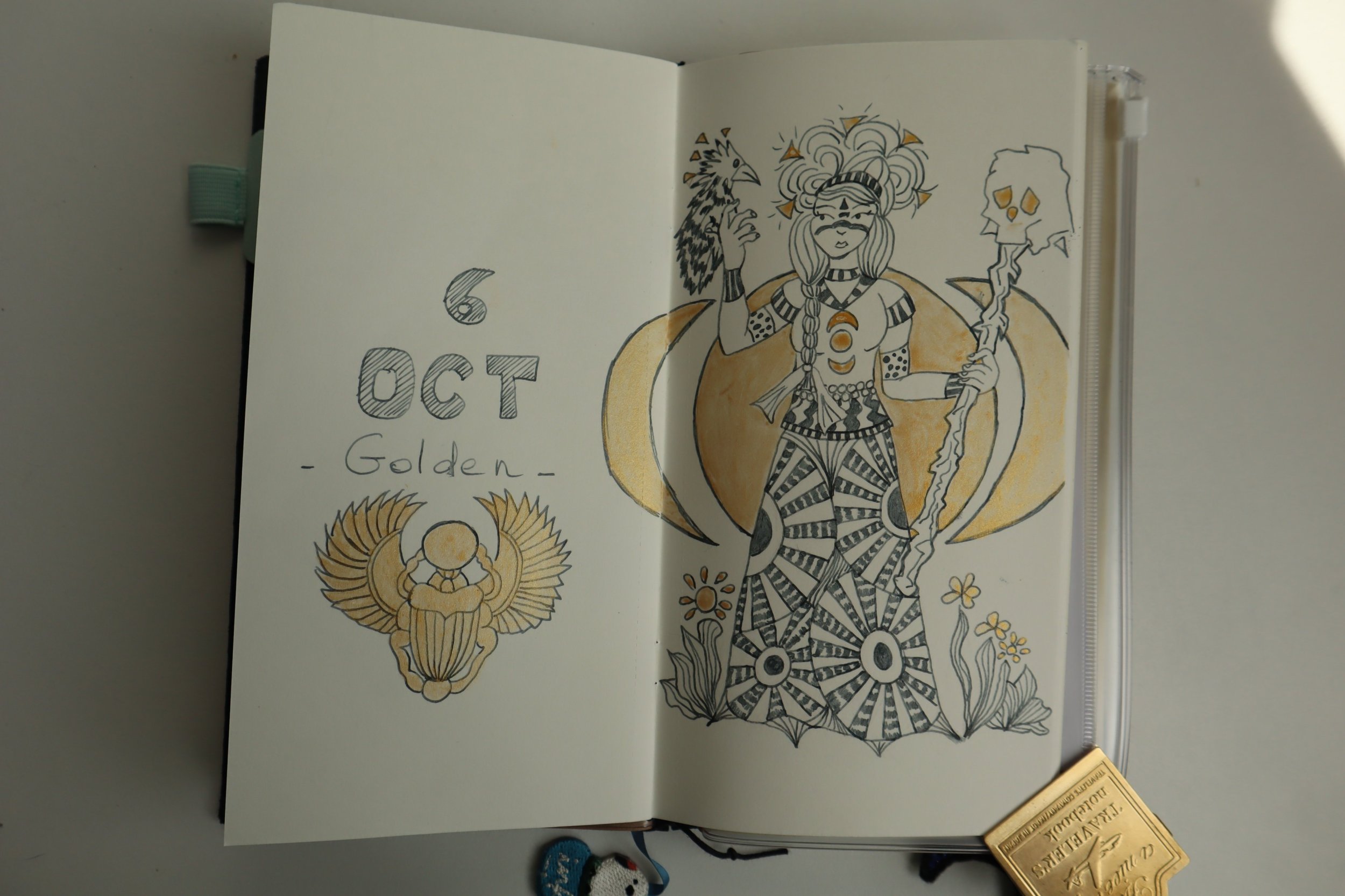 Bonjour @Savadja Ton portrait est très beau, le rendu doré sur la peau est très réussi. @Marco En effet, pas simple de rendre un aspect doré juste en noir et blanc, tu t’en es bien sorti je trouve. De mon côté, j’ai utilisé de l’encre doré 😉 @fabio j’aime bien la ref, bravo 🙂 @Darosan j’adore ton pigeon, et bonne idée la pomme. @Deny Superbe ton dessin, très beaux détails. @Pandigo J’aime beaucoup, très poétique. @Samaëlec’est superbe, bravo. voici mon dessin sur le thème doré. J’ai pensé à une magicienne. J’ai réalisé le dessin à l’encre (stylo plume) et j’ai colorisé certains détails à l’encre doré.28 points