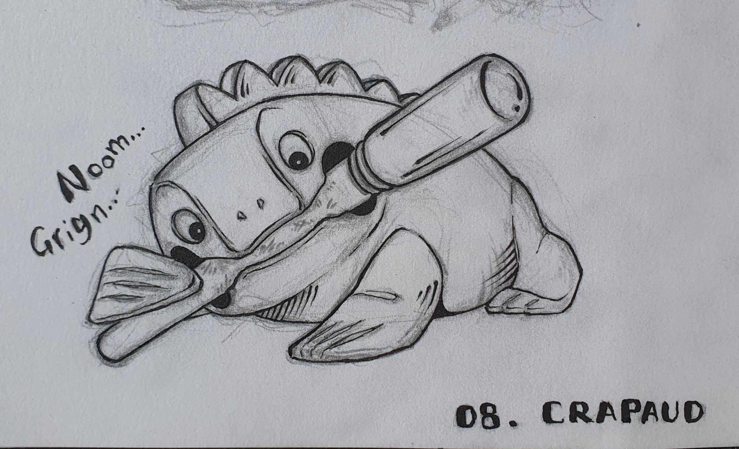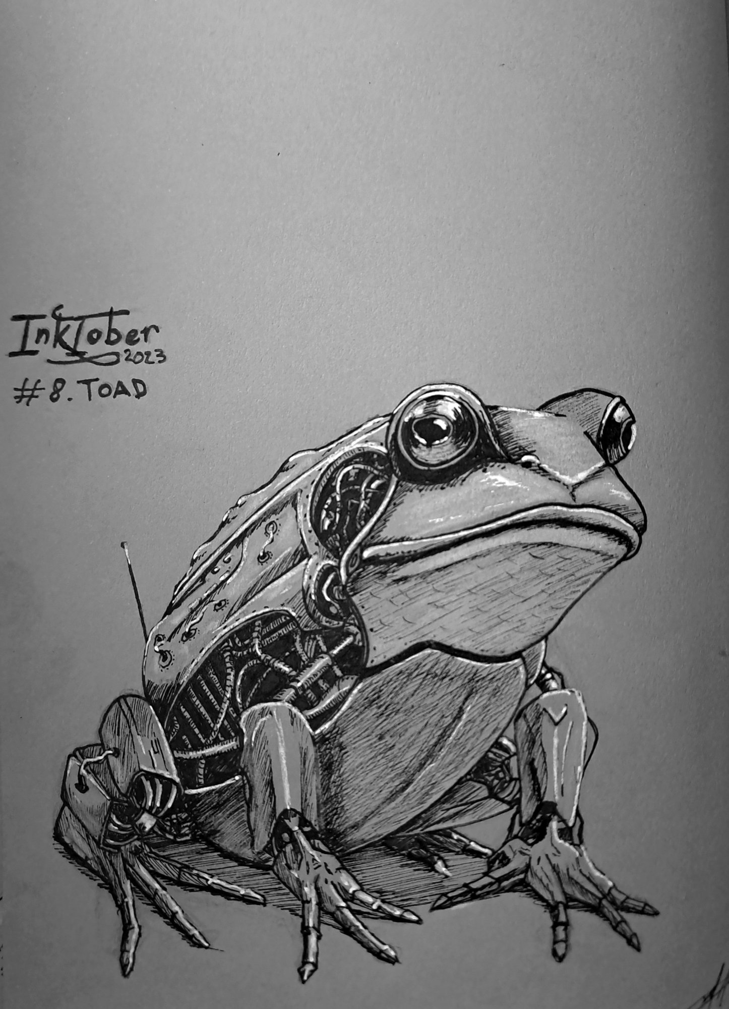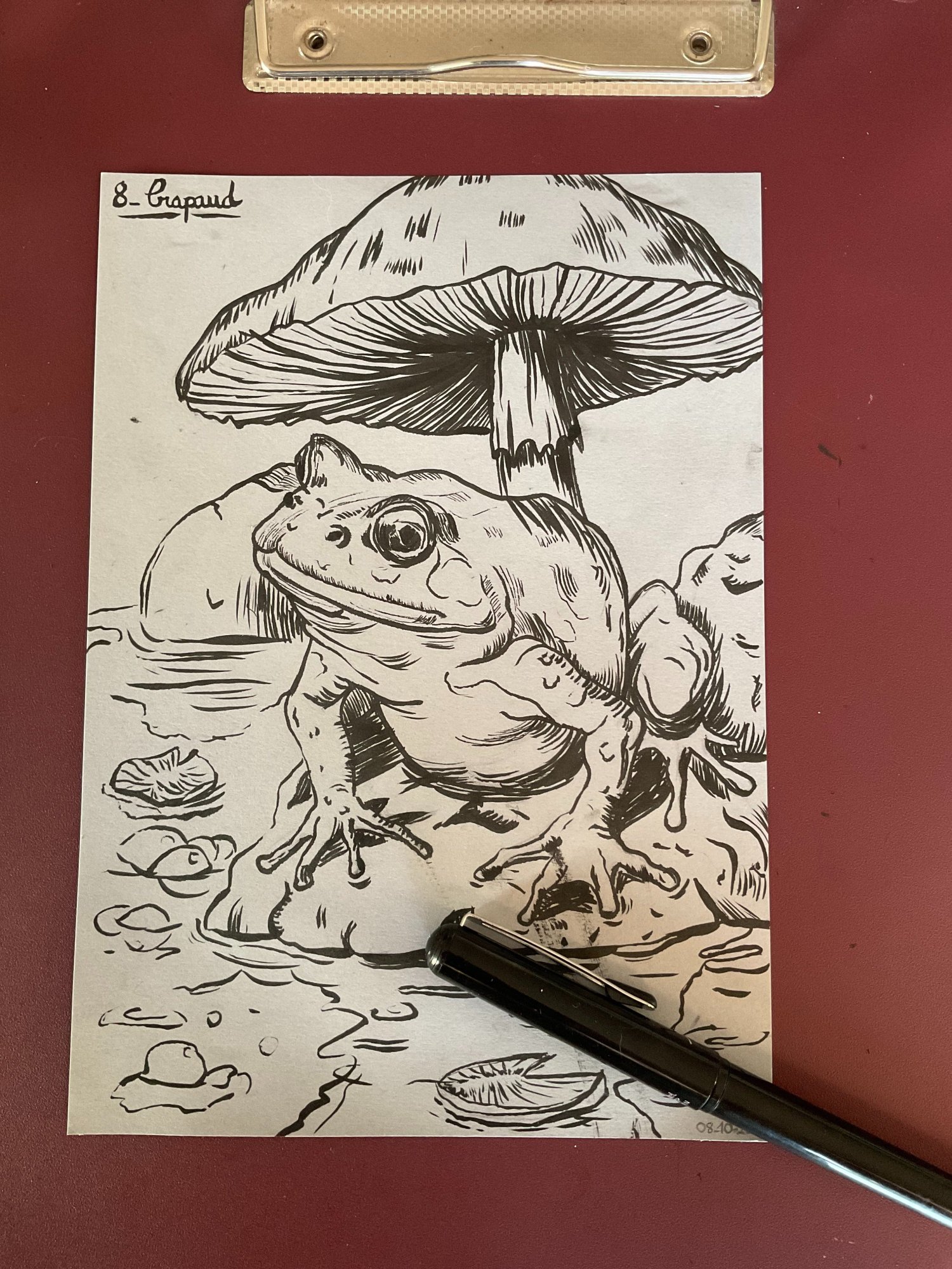 Bonjour @Archange.St.Michel il est très stylé et bien dynamique ton crapaud. @Marco Très bonne composition, et le mot crapaud en dessous est vraiment top. @Pandigo J’aime beaucoup ton crayonné. @Emifei Excellent avec les petits fantômes, ton dessin est très beau. @Deny J’aime beaucoup ta composition et dessin. @fabio Il est très cool ton crapaud. @Azhen j’aime beaucoup tes dessins, le portrait est top. Voici mon crapaud, réalisé à l’encre, avec un fond à l’encre.23 points