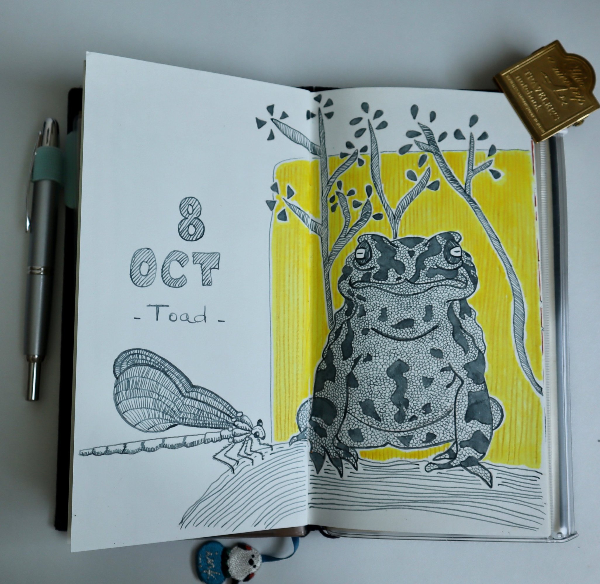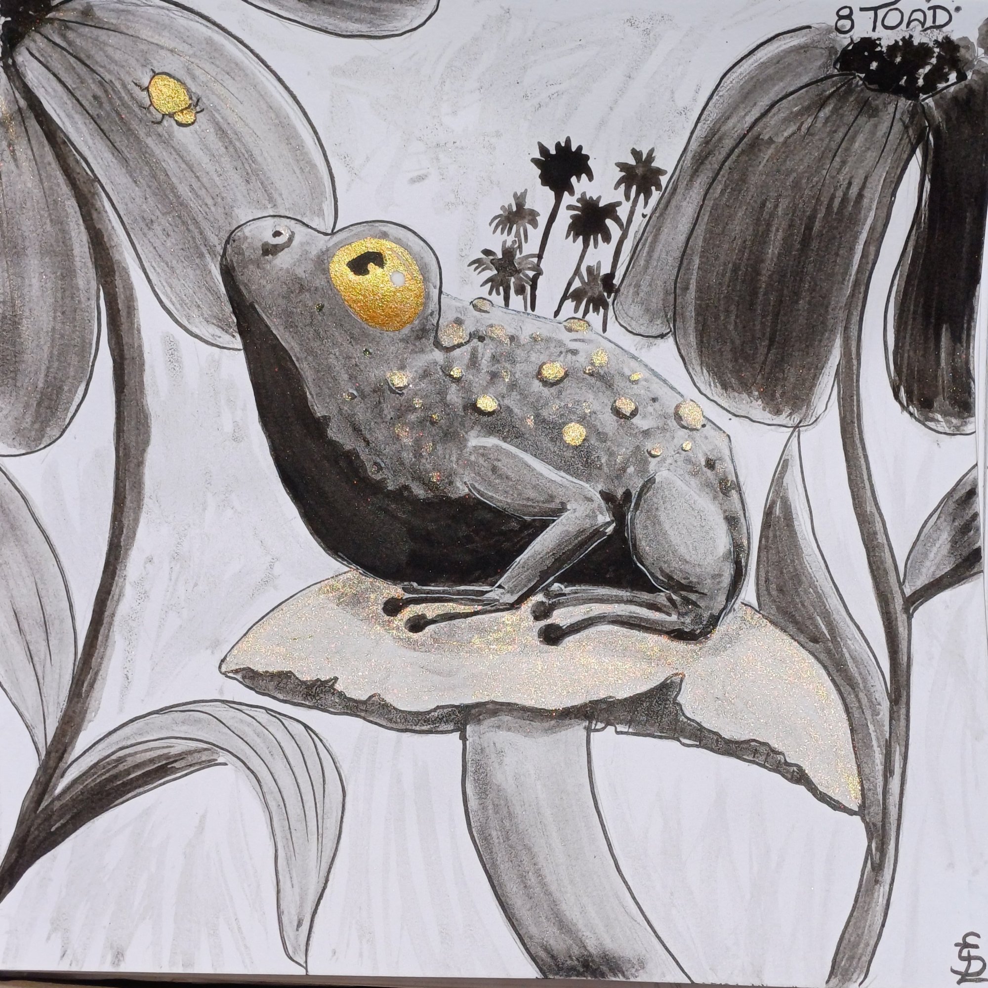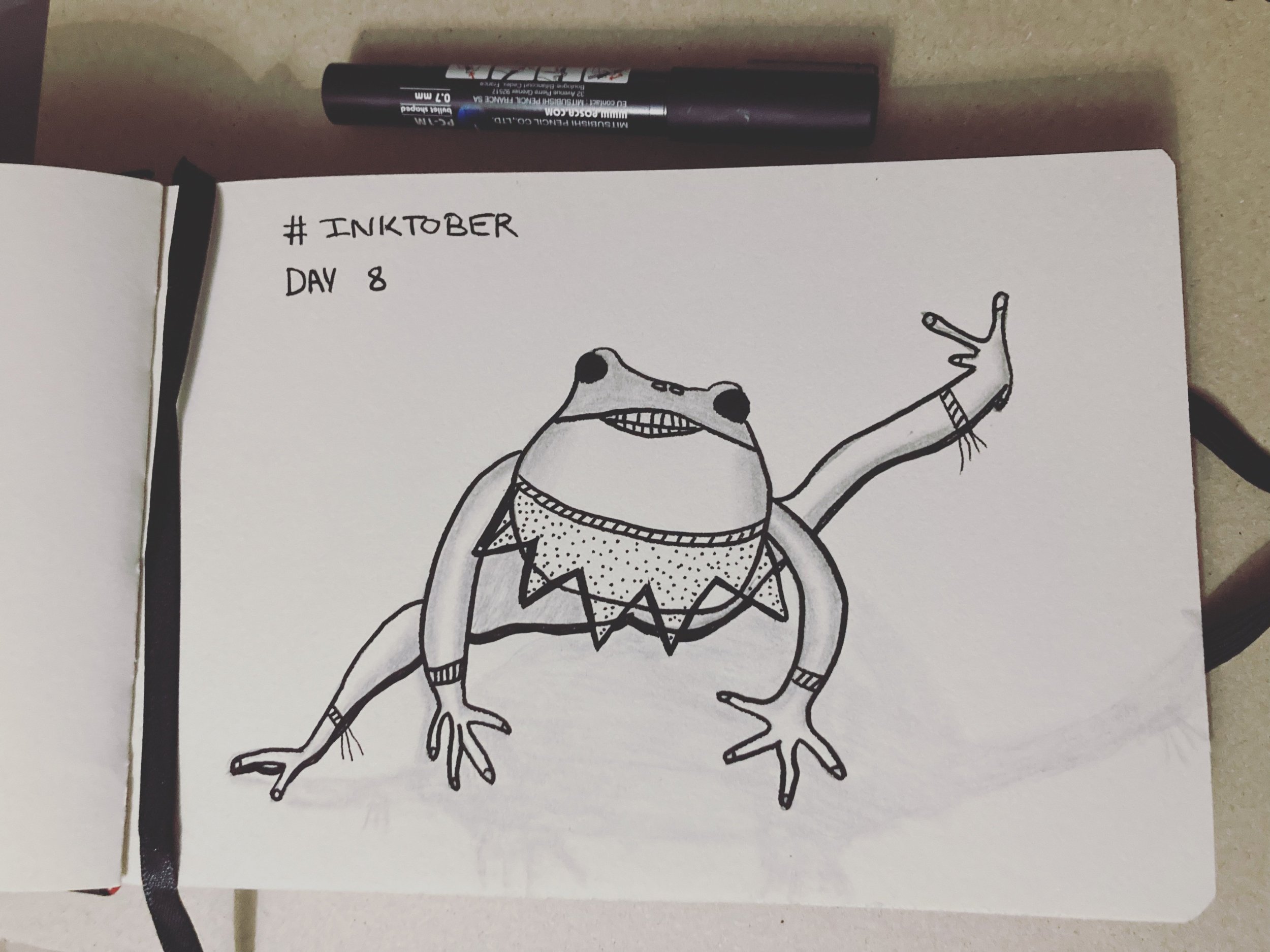Bonjour @Archange.St.Michel il est très stylé et bien dynamique ton crapaud. @Marco Très bonne composition, et le mot crapaud en dessous est vraiment top. @Pandigo J’aime beaucoup ton crayonné. @Emifei Excellent avec les petits fantômes, ton dessin est très beau. @Deny J’aime beaucoup ta composition et dessin. @fabio Il est très cool ton crapaud. @Azhen j’aime beaucoup tes dessins, le portrait est top. Voici mon crapaud, réalisé à l’encre, avec un fond à l’encre.23 points