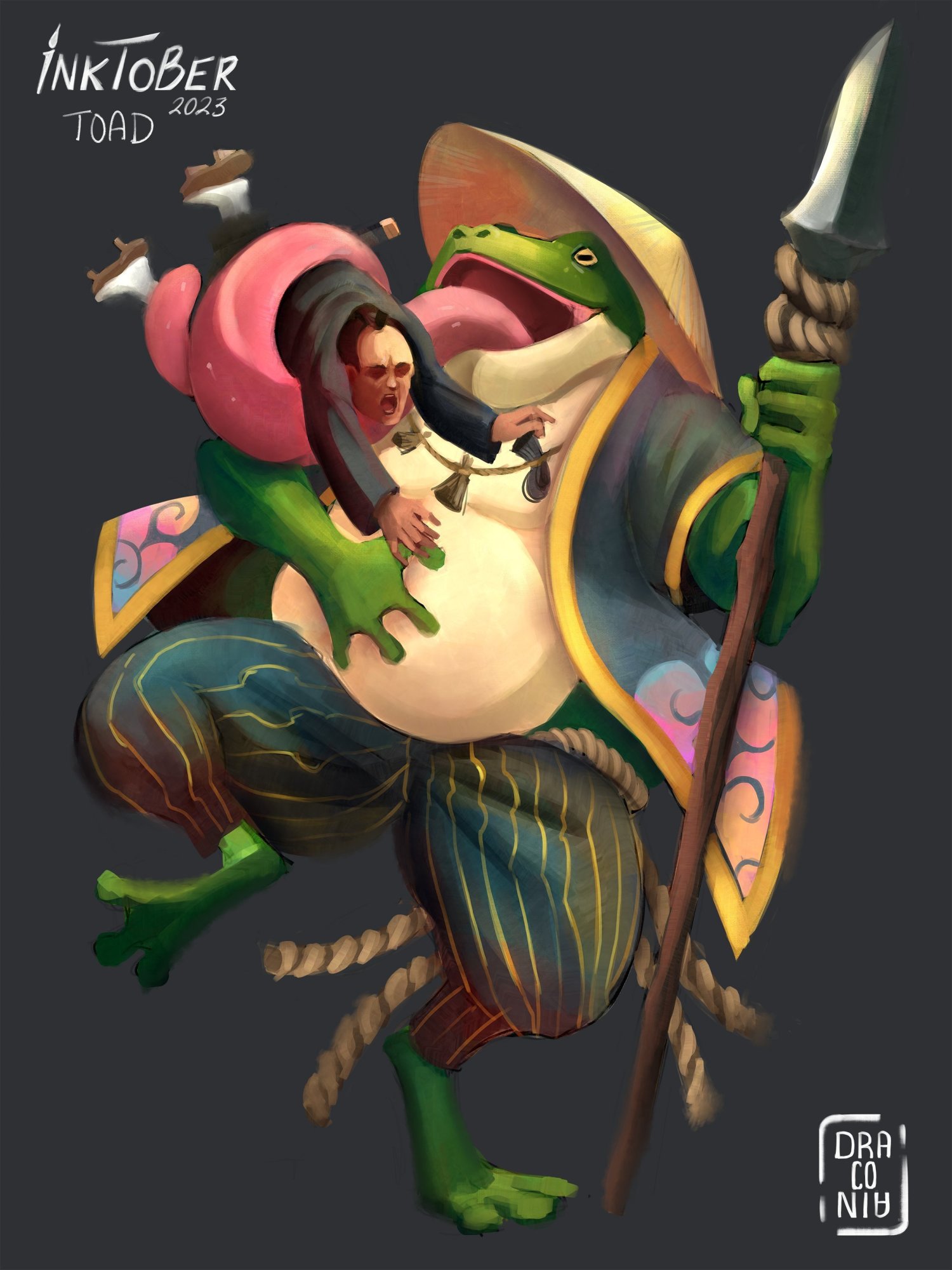 Salut à tous ! J’aime beaucoup le mot du jour alors c’est super de voir toutes vos illustrations dessus 😃 @Samaëlesuper j’adore ! C’est inspiré de quel peuple ? @Azhenla pose du personnage est bien dynamique ça rend bien le mouvement. @fabioah naruto de bons souvenirs ! Très bien invoqué ton grand crapaud 😉 De mon côté mes personnages ont découvert un crapaud gigantesque ! Qui est partant pour un petit tour à dos de crapaud ?26 points