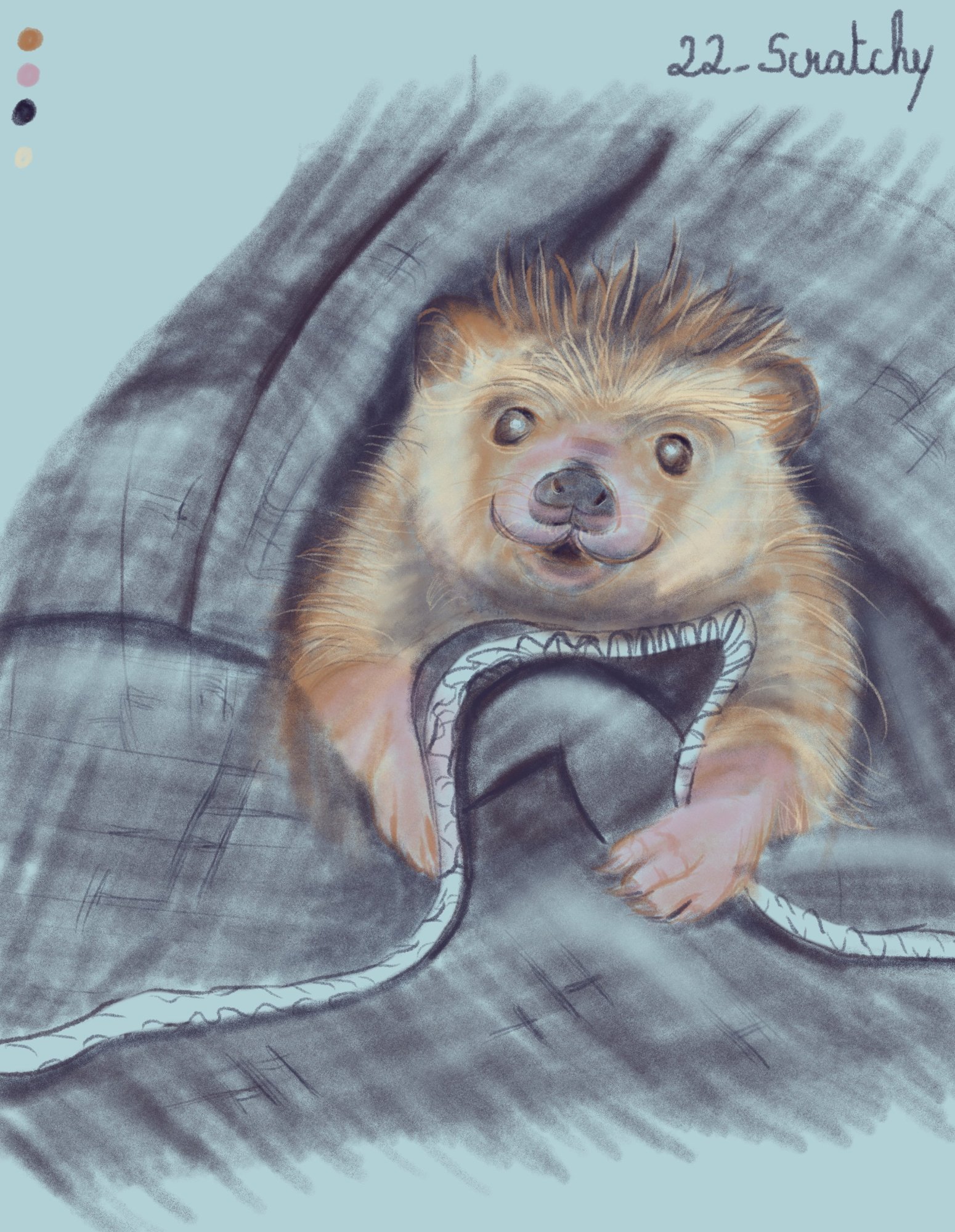Bonsoir ! Voilà mon petit scratchy dans sa couverture en laine (j'ai pris le sens de piquant/rêche donc). Vraiment pas simple ce thème, je crois que c'est celui qui m'a donné le plus de difficulté pour trouver une idée, j'ai failli jeter l'éponge. @AgapiC'est validé pour le thème à mon sens, j'y avais pensé aussi. J'adore ta réalisation, elle est adorable et très joli effet de bourrasque. ♥ @alkecesaNous aussi on t'aime ! Une de plus, bravo ! @sivayneOn peut pas toujours avoir la même énergie et l'envie, allez, on tient bon, courage pour la suite et le rattrapage ! Bravo pour ta participation !6 points