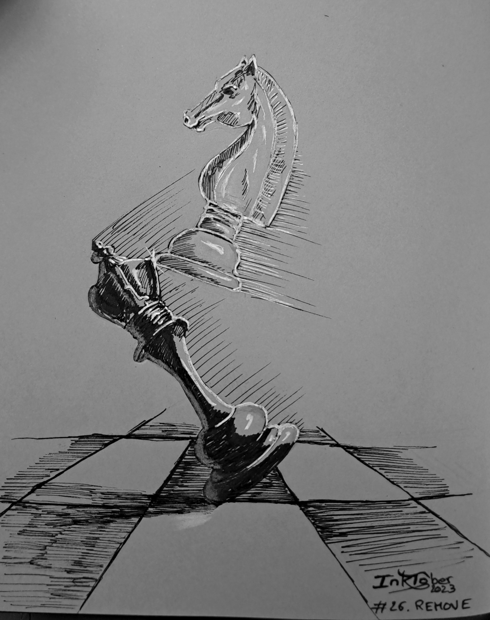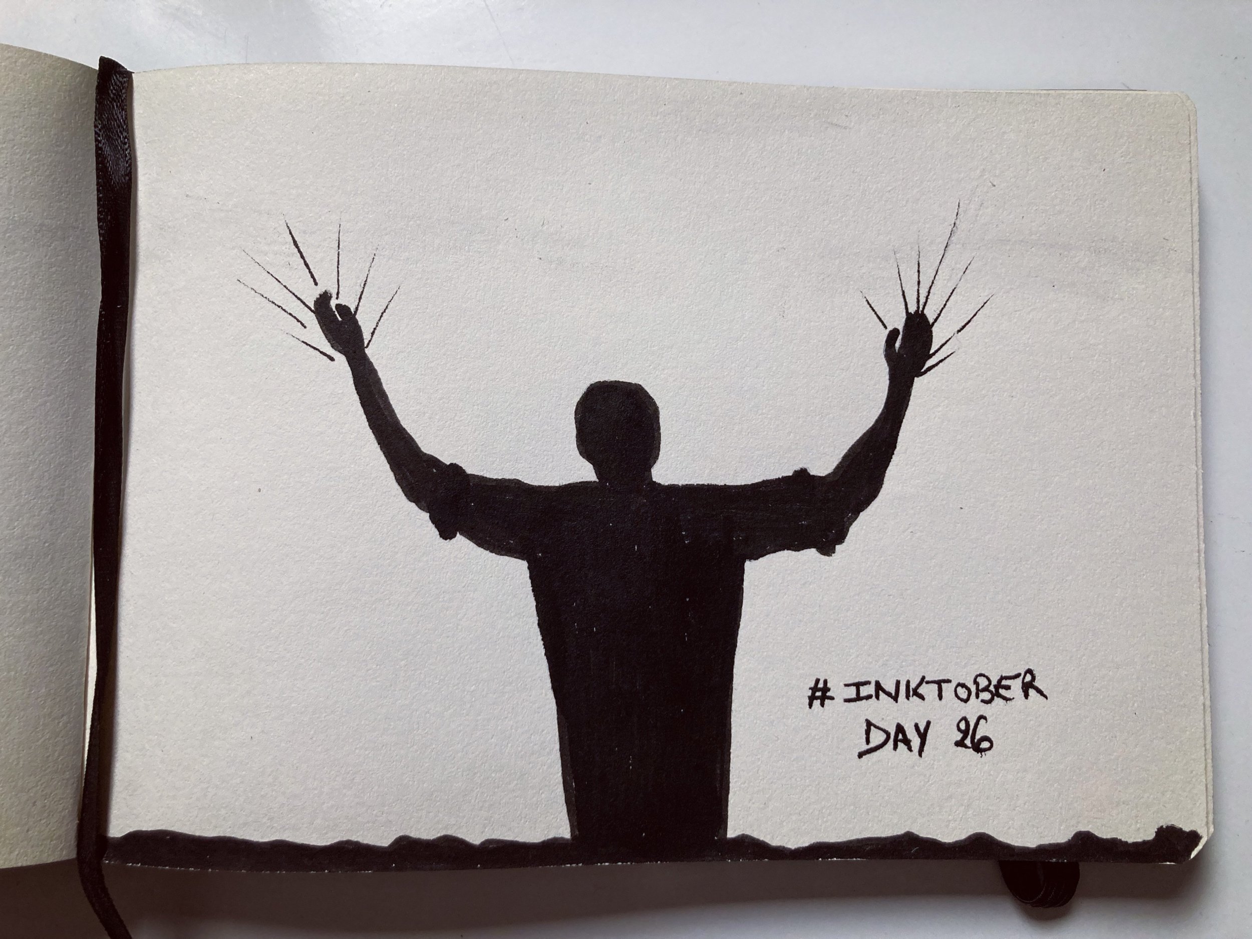 @Archange.St.Michel Vraiment drôle et inattendu comme ajout ! Il te faudrait un logiciel de dessin en zoom infini qu’on voit de temps en temps en création sur les réseaux sociaux ! Le résultat serait dingue 😜 @ApostroKe J’aime vraiment ton mood dark sur cet Inktober. T’es vraiment dans l’ambiance qui me fait vibrer en ce moment ! Le design de ton personnage est vraiment top 👍 Quant à moi, un peu fatigué et malade, je me suis rabattu sur une étude pas évidente à l’encre (peu de contraste pour la main et des reflets difficiles sur le métal. J’espère que ça passe…21 points
