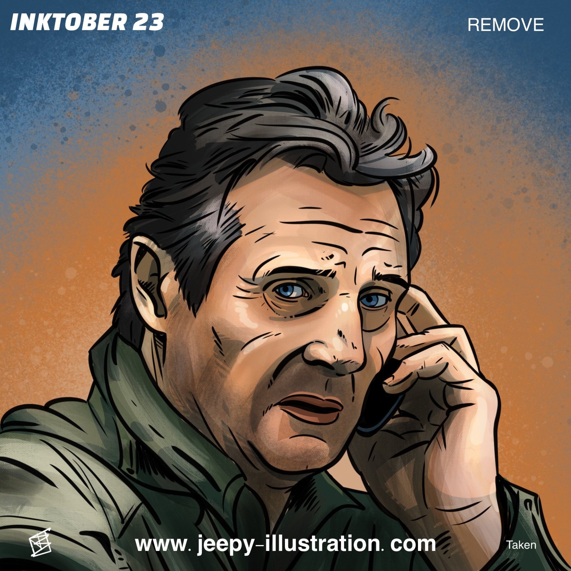Inktober23 - Remove : " Taken" Thriller haletant avec Liam Neeson. Un ancien agent secret doit libérer sa fille de ses ravisseurs. www.jeepy-illustration.com #inktober #ink #inktoberfrance #inktober2023 #cartoon #popculture #movie #cinema #illustrateur #illustration #bd #comic #spiderman #fanart #characterdesign #character #taken #liamneeson @liwytres chouette @Marco idée originale, 👏17 points