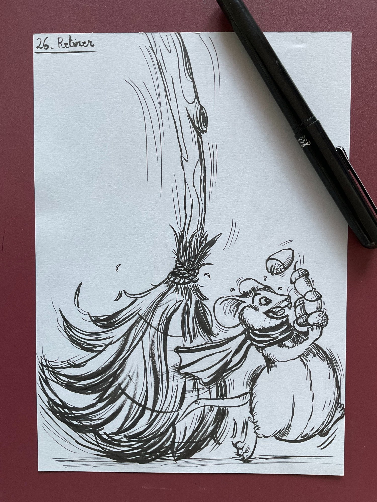 Bonsoooir ! "Du balai !" ça tente de se débarrasser d'un "nuisible" qui prend soin de retirer de sa cachette ses provisions avant de fuir. 😁 Je n'ai pas réussi à retrouver la belle dynamique que j'avais sur mon croquis, ni l'expression de ma souris, mais que voulez-vous. P'tit goûter et je viens admirer vos réalisations ! ☕🍪15 points