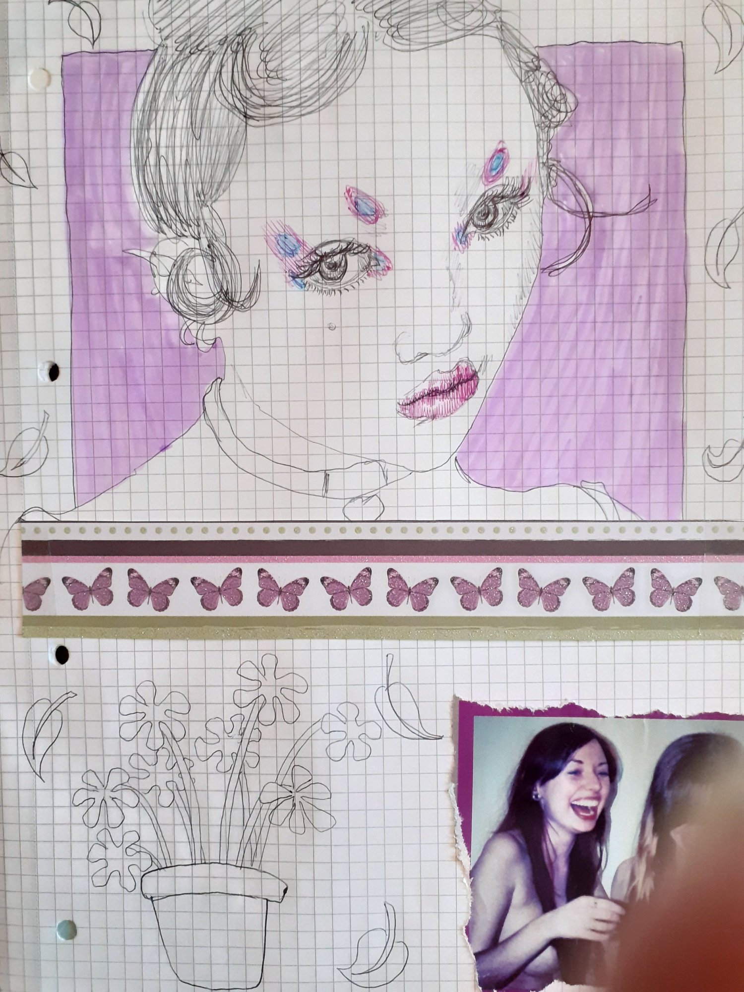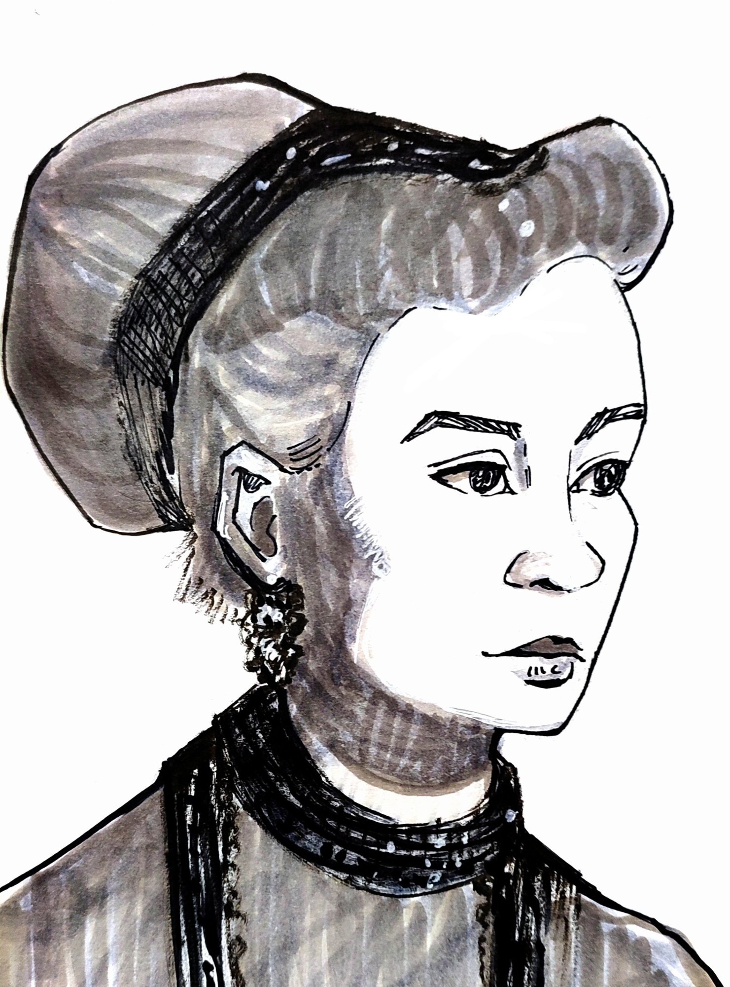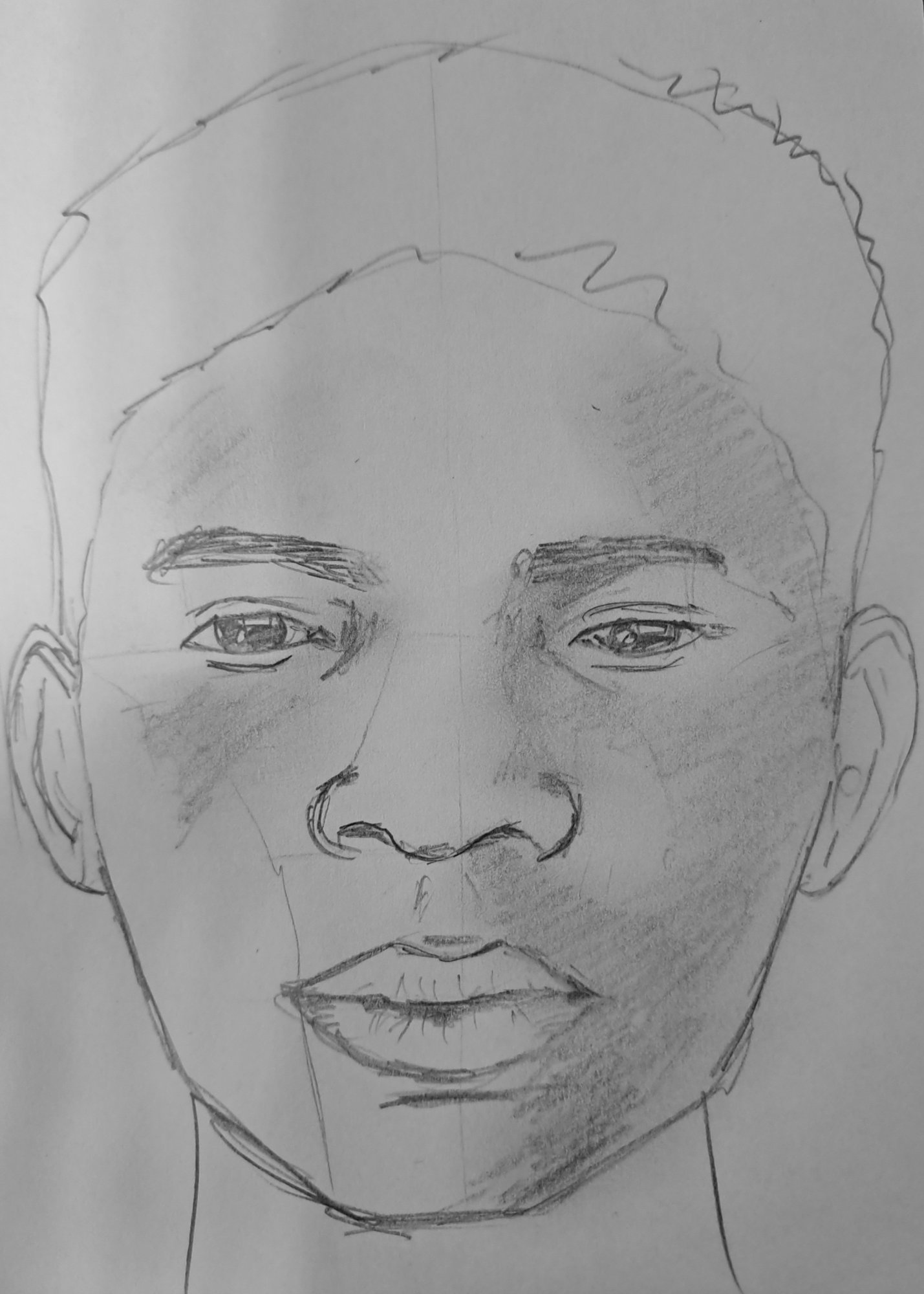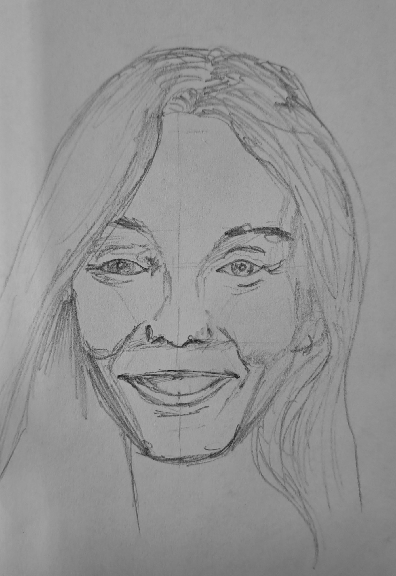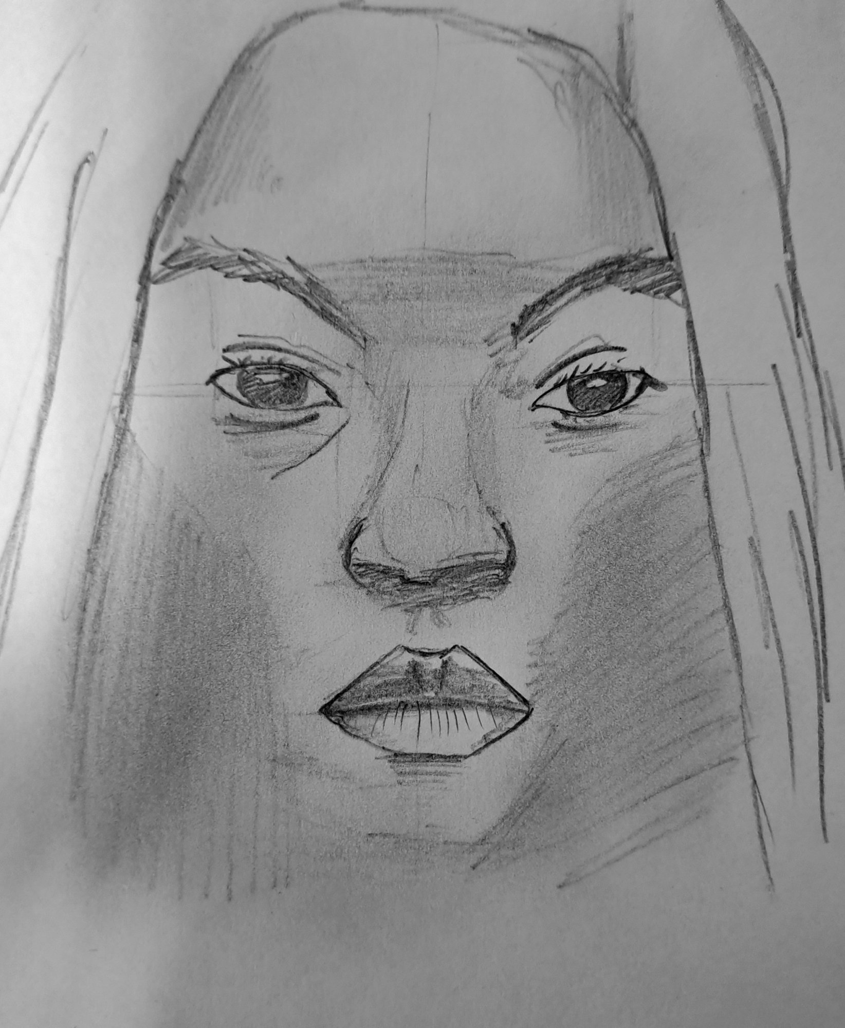 Voilà , j'ai un portrait frontal, comme la référence du 24 oct. J'ai recommencé 2 fois la couleur, parce que ça n'allait pas...avant que je prennes conscience que j'avais un problème de symétrie avec un oeil. ensuite, j'ai voulu faire disparaitre mes lignes de contour (Ercwolf d'avoir une mauvaise influence sur moi )...bref meilleur chance la prochaine fois 😭.. Il y avait encore les vêtements à bosser...mais bon...je finirais jamais ..sinon ..😓2 points