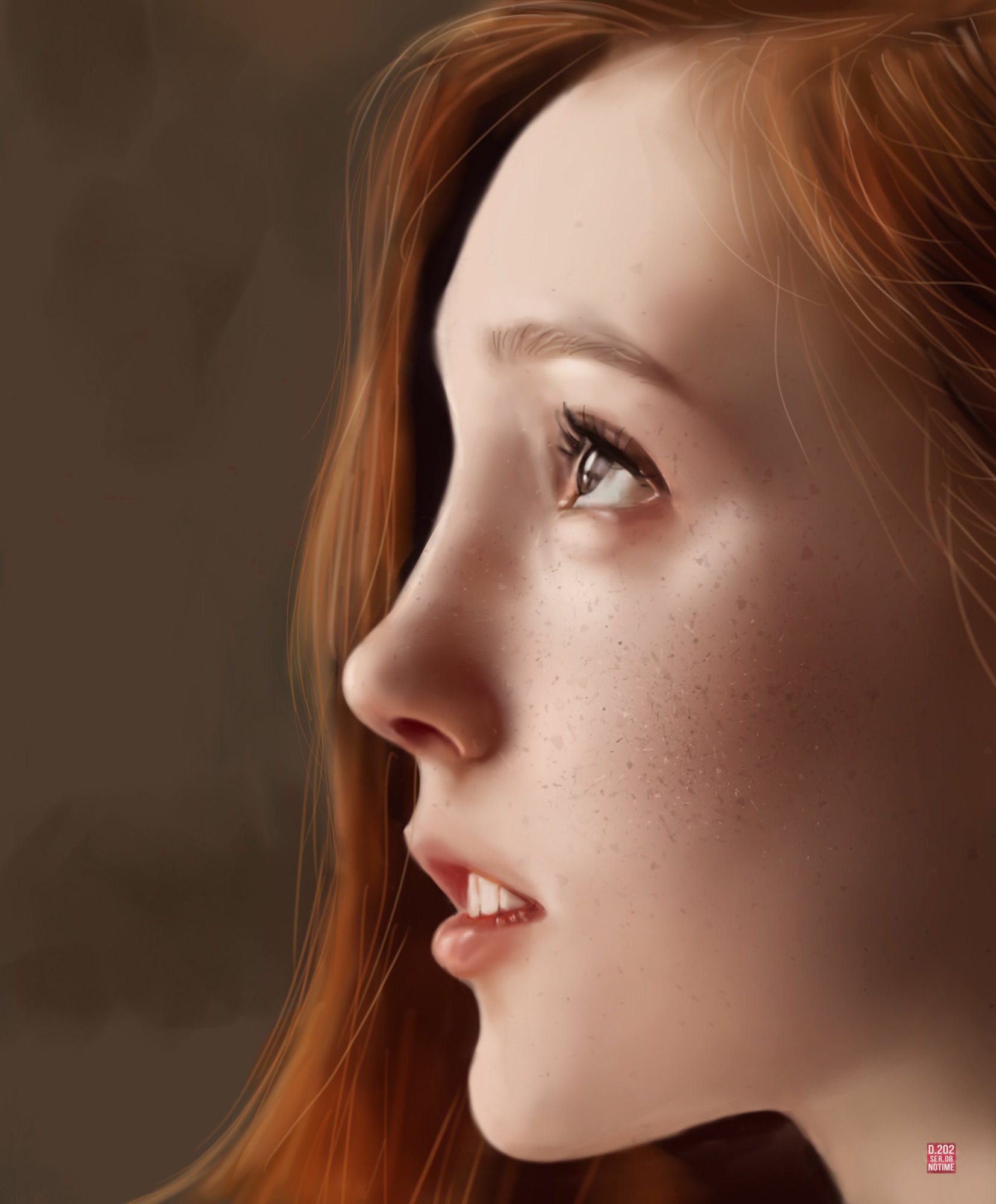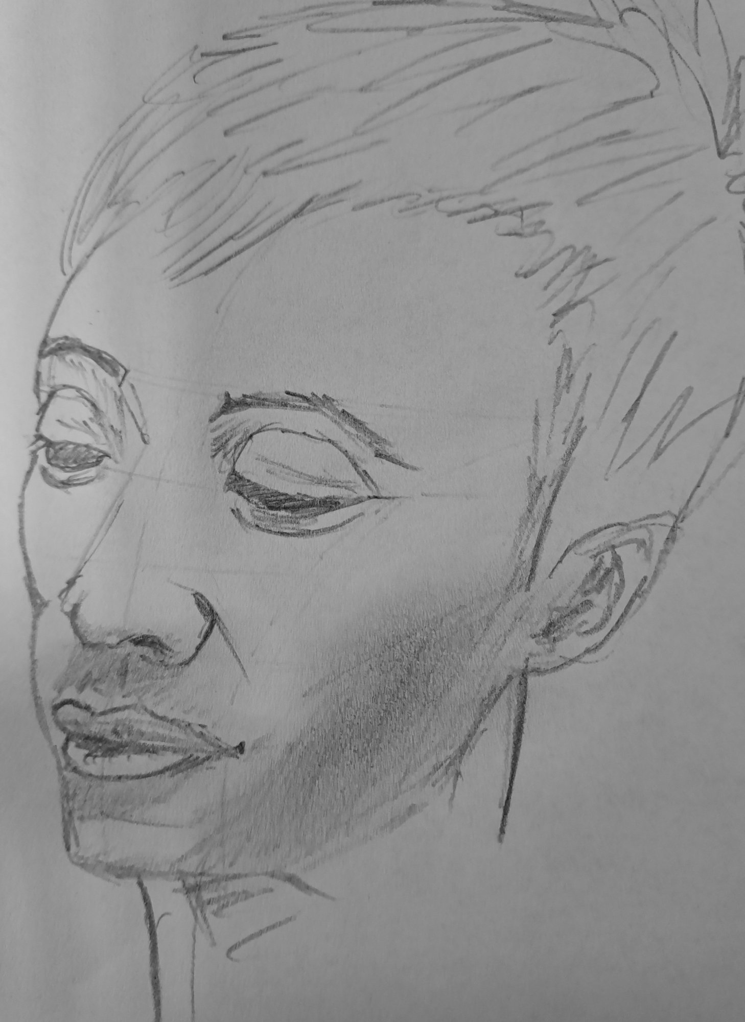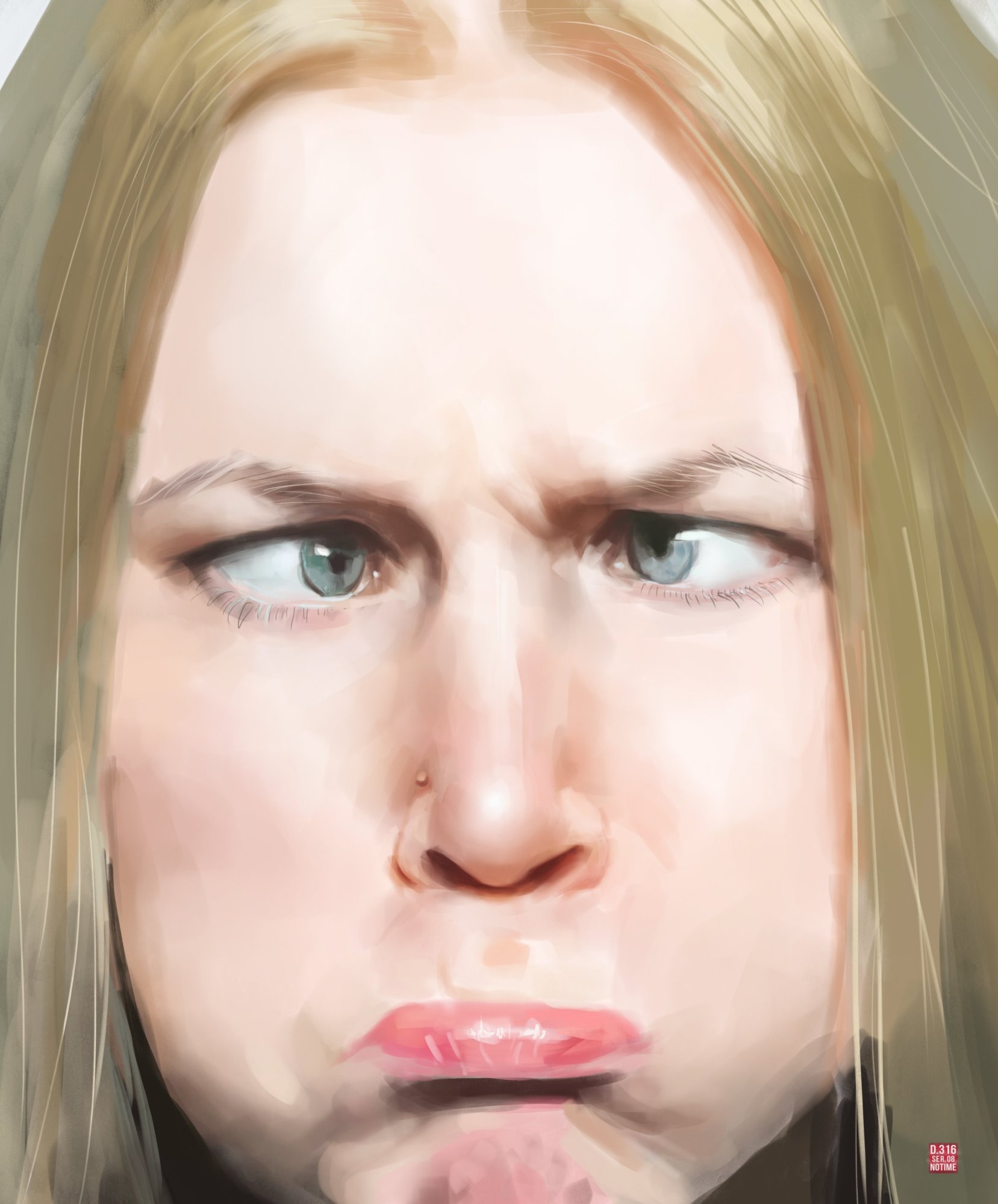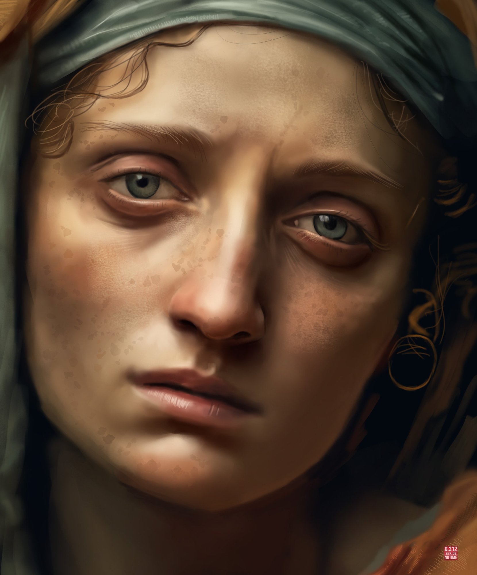 je me suis dit : "Tiens, la qualité de l'image dévoile la texture de la peau... C'est intéressant... On va zoomer et essayer de rendre la texture de la peau... en plus de ça, on aura moins de travail sur le visage en zoomant à fond..." Faux Nul Zéro C'est encore plus de taf et de temps ! D'ailleurs c'est même pas satisfaisant... Faudrait que je visionne des tuto pour ce niveau de détail...2 points
