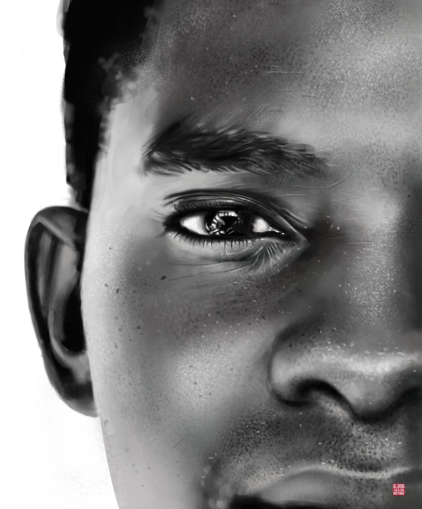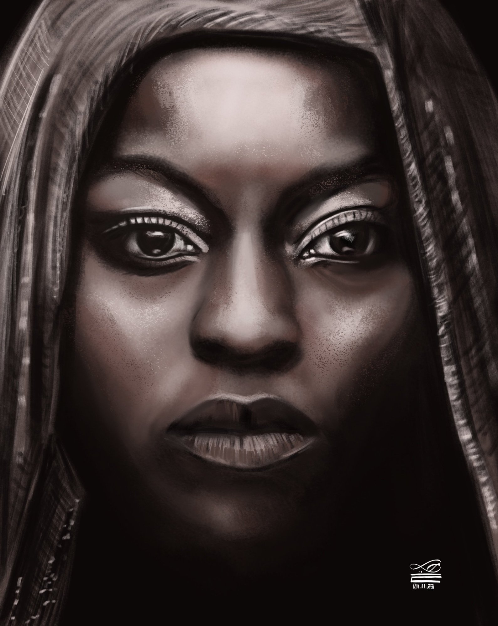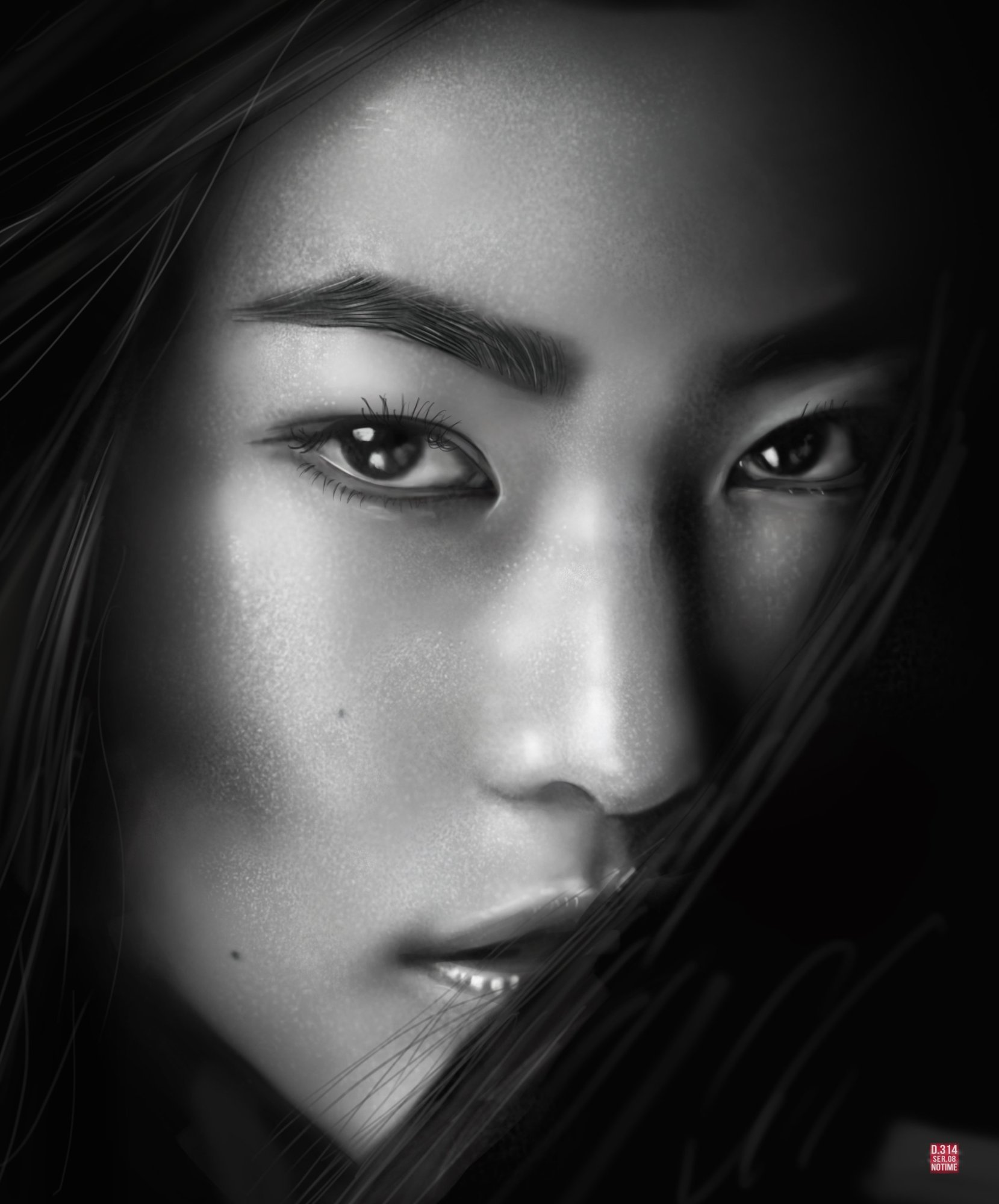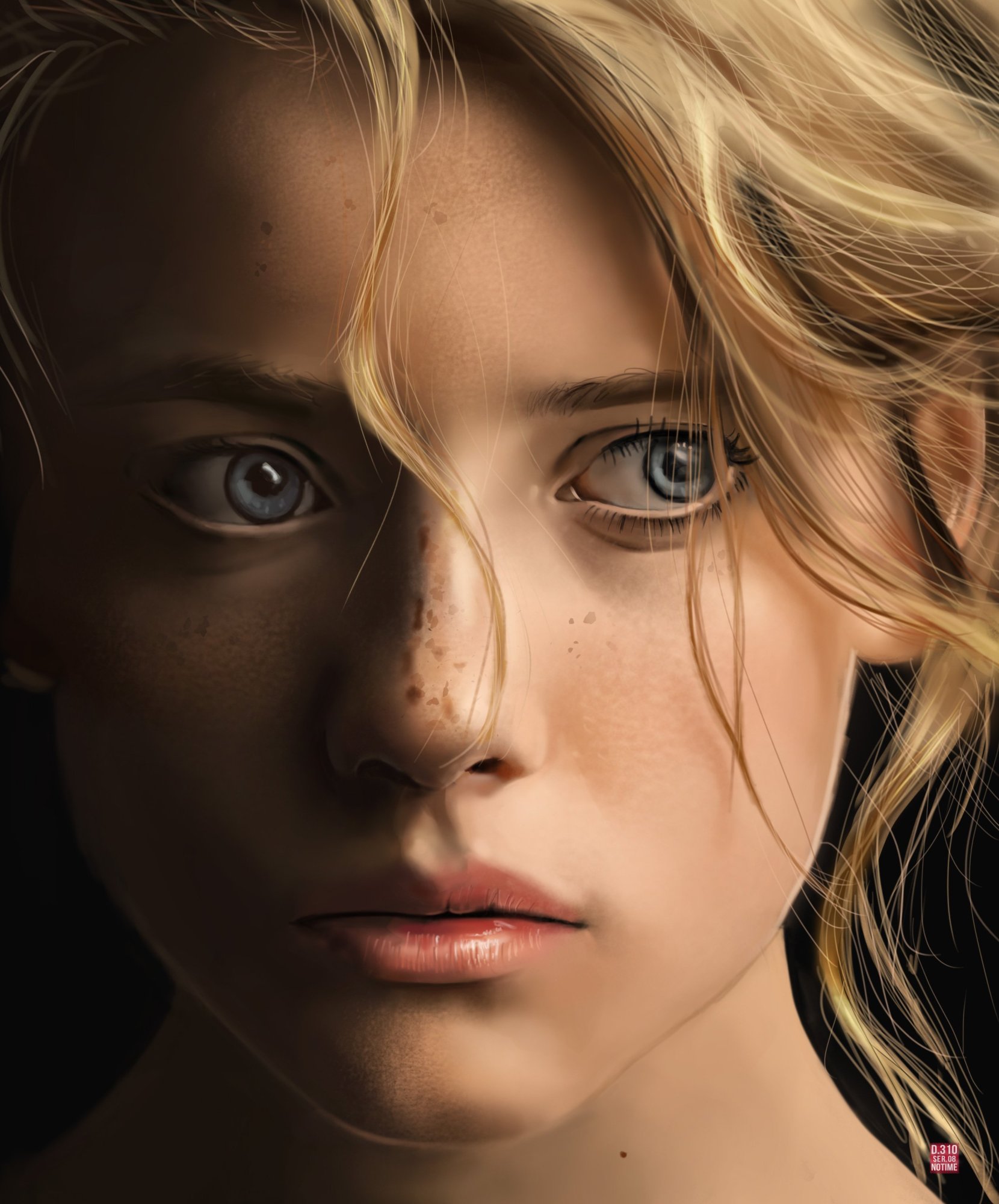 je me suis dit : "Tiens, la qualité de l'image dévoile la texture de la peau... C'est intéressant... On va zoomer et essayer de rendre la texture de la peau... en plus de ça, on aura moins de travail sur le visage en zoomant à fond..." Faux Nul Zéro C'est encore plus de taf et de temps ! D'ailleurs c'est même pas satisfaisant... Faudrait que je visionne des tuto pour ce niveau de détail...2 points