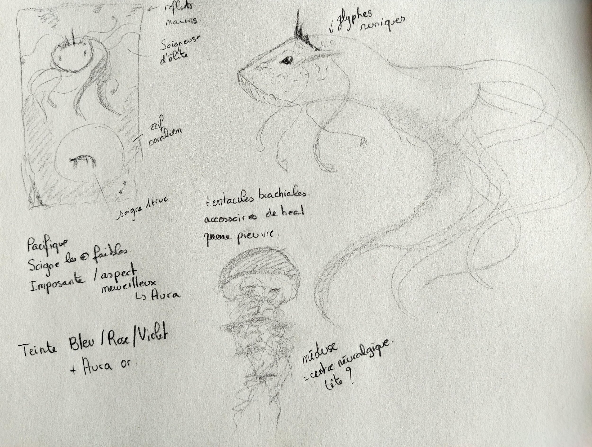 Bien le bonjour 😄 Bon après de longues réfléxions et test, j'ai étais bien inspiré pour les Extrobaleine 😄 Je suis donc partie sur deux types de "baleines". Je me suis permis d'écrire une sorte de "carnet de bord" de scientifique qui analyse ces créatures. Je le met a jours de temps en temps quand me viens des idées, donc veuillez me pardonner si il y a des fautes, je n'ai pas toujours le temps de me corriger tout de suite après xD La première : Extrobaleine nourricière! L'unique baleine de cette planète qui peut engendrer la vie ! C'est une créature extrêmement fragile et sensible, cette sensibilité est due à une particularité encore peu comprise, mais as première vue elle serait capable de capter les informations émotionnelles de ces congénères ainsi que leurs histoires dans le but de les transmettres à sa progéniture. Nous ne savons pas encore pourquoi, mais nous avons l'hypothèse que cette extrasensibilité l'aurait rendu aveugle pour ne pas surcharger ses capacitées cérébrales. Ce qui rend la pauvre bête d'autant plus fragile. Pour ce qui est de la progéniture, c'est la première créature de l'univers qui met aux défis toutes nos connaissances dans ce domaine. Tels des kangourous, le bébé grandis dans une poche a l'extérieur du ventre de la baleine, mais contrairement à elle, la peau qui protège ce nourrisson est extrêmement fine et fragile c'est pour quoi elle possède un trio de nageoire lui permettant de pouvoir se stabiliser totalement, même en cas des plus grandes tempêtes. La mère surveille en permanence l'état de sa progéniture grâce aux deux paires de trois tentacules qu'elles possèdent, contrairement à celle de ces congénère, les soigneuses, celle-ci permette de nourrir et apaiser le bébé durant sa gestation. Nous avons beaucoup parlé de sa fragilité c'est pourquoi elle ne se déplace jamais sans un autre type de baleine. Extrobaleine Protectrice Les colossales et féroces protectrices ! très ressemblent sur la forme à des cachalots de notre monde, mais en bien plus imposant. La principale propriété de ce type sont les épaisses couches de coraux qui apparaissent aux extremités de la créature ainsi que sur les zones sensibles de son corps. Nous n'avons encore rien vu capable de rivaliser avec la résistance de ces animaux ! même au bord de la mort ils défendent avec férocité leurs nourricières. Leur seul point faible est la vitesse, mais qui est vite compensée par leurs intelligences et leurs tailles !2 points