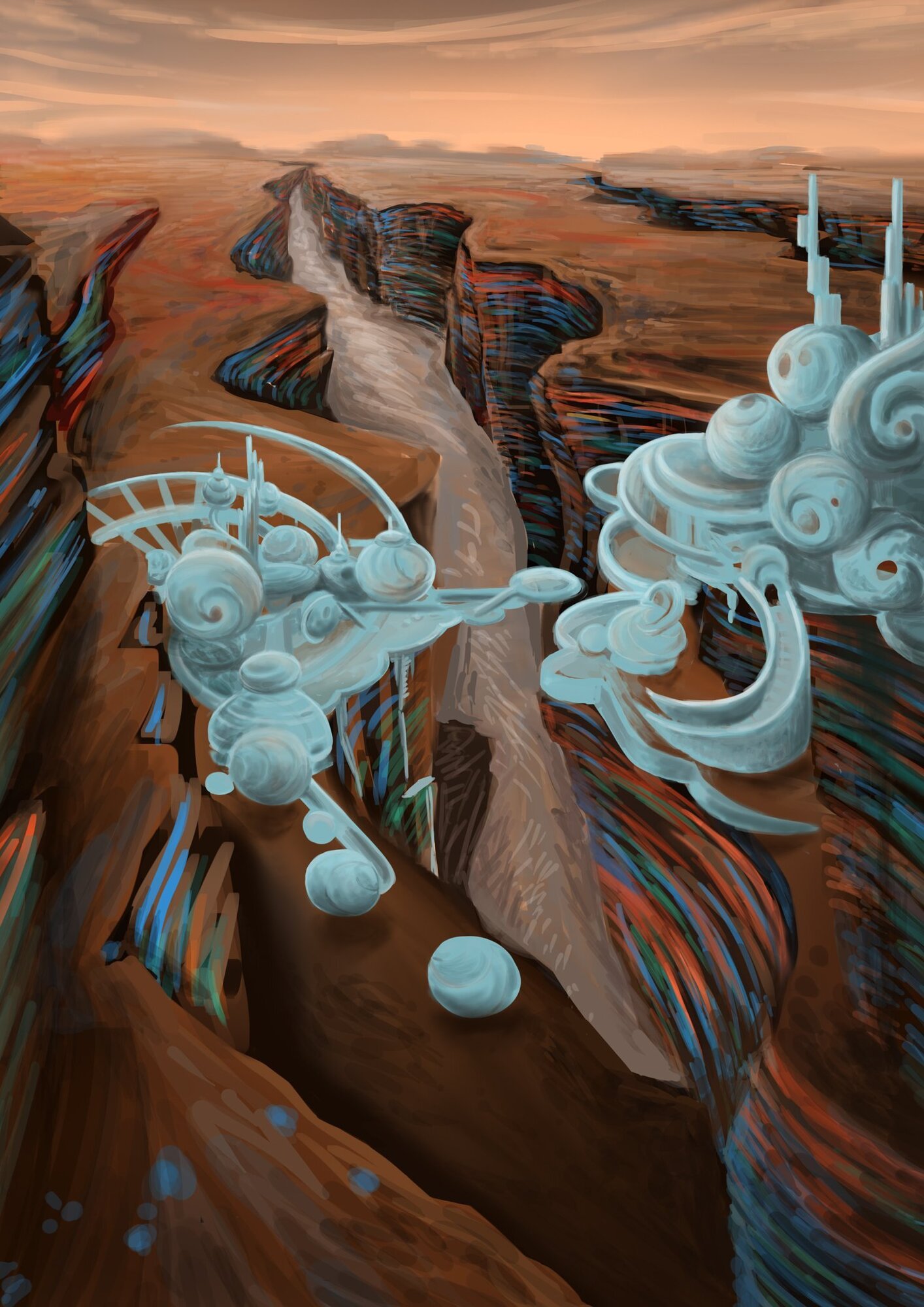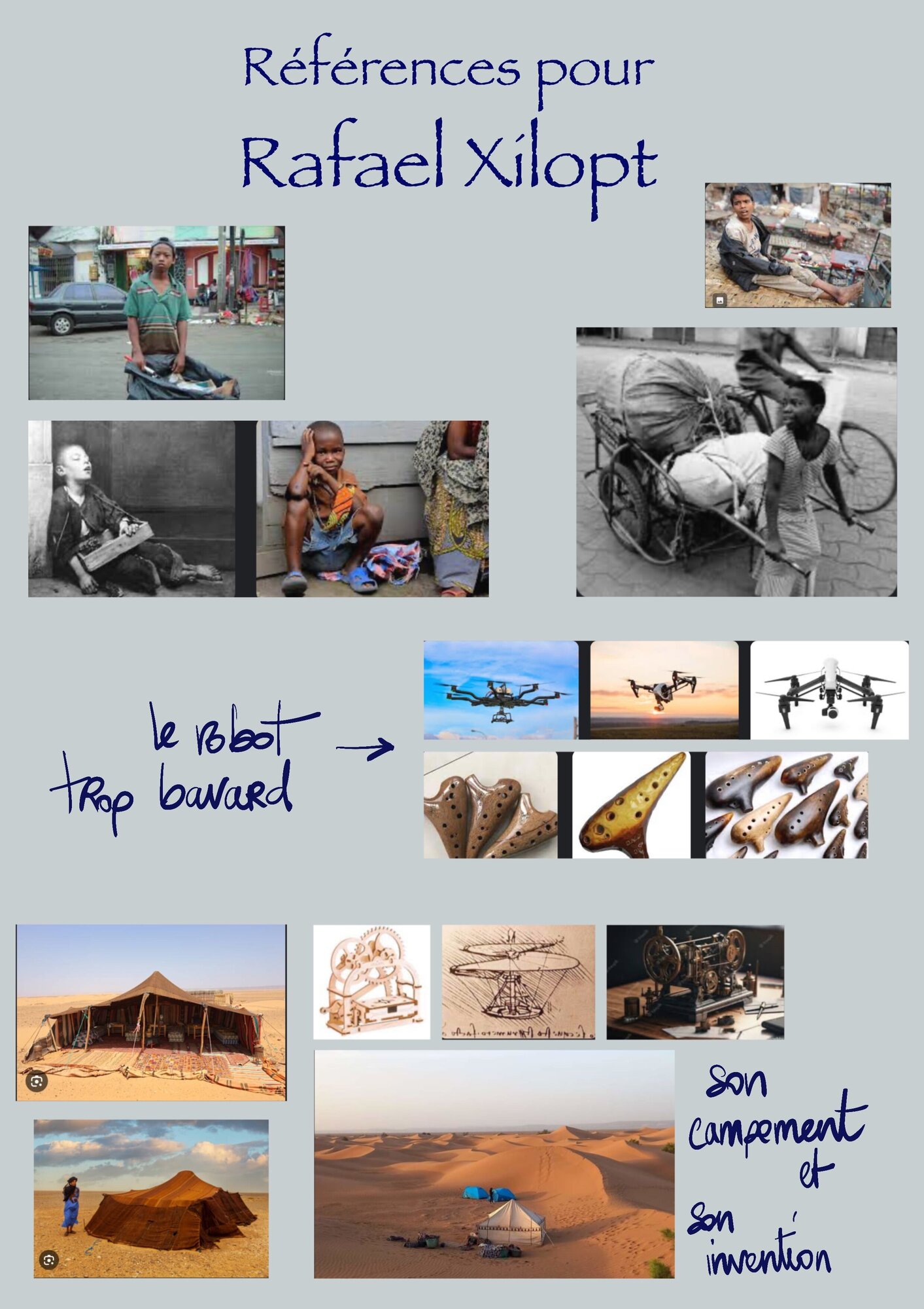 Bonjour! Voici mes références que j’ai cherché sur Google image, pour jouer le jeu et vous donner une idée plus illustrée. J’ai trouvé un instrument intéressant pour faire « parler » le robot de Rafael je vais essayer de faire un robot un peu bariolé comme fait de bric et de broc en partant d’un squelette de drone. 🙂 Pour le village je vais me lancer et changer légèrement le point de vu pour avoir un focus sur une scène de vie au niveau d’une « guinguette terrasse » qui donne sur le canyon. Ainsi je pourrais mettre en valeur les couleurs sur la falaise d’en face.2 points