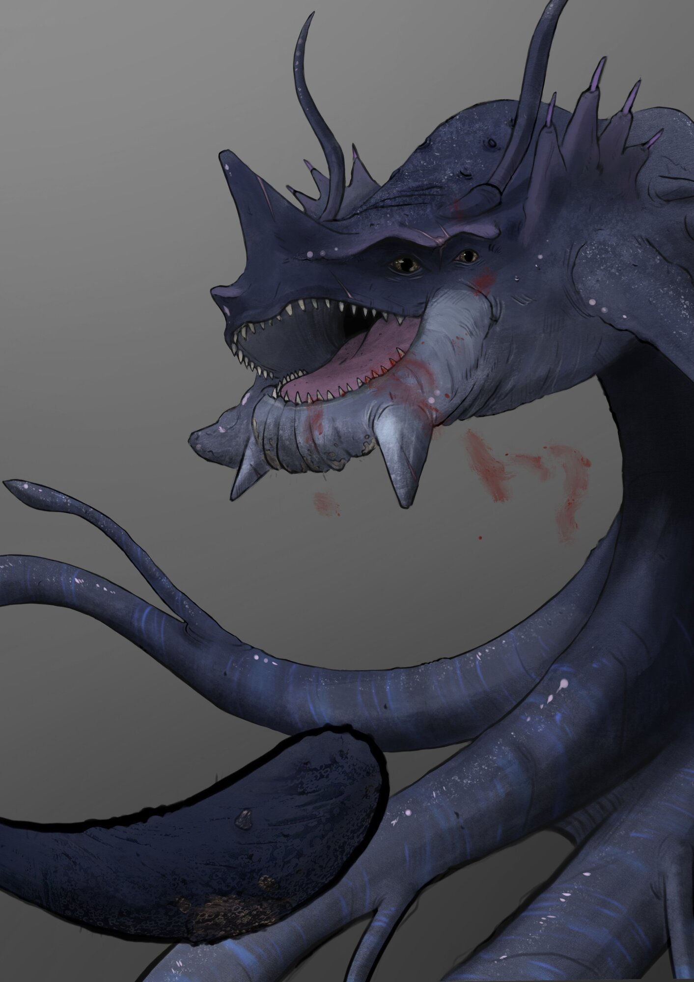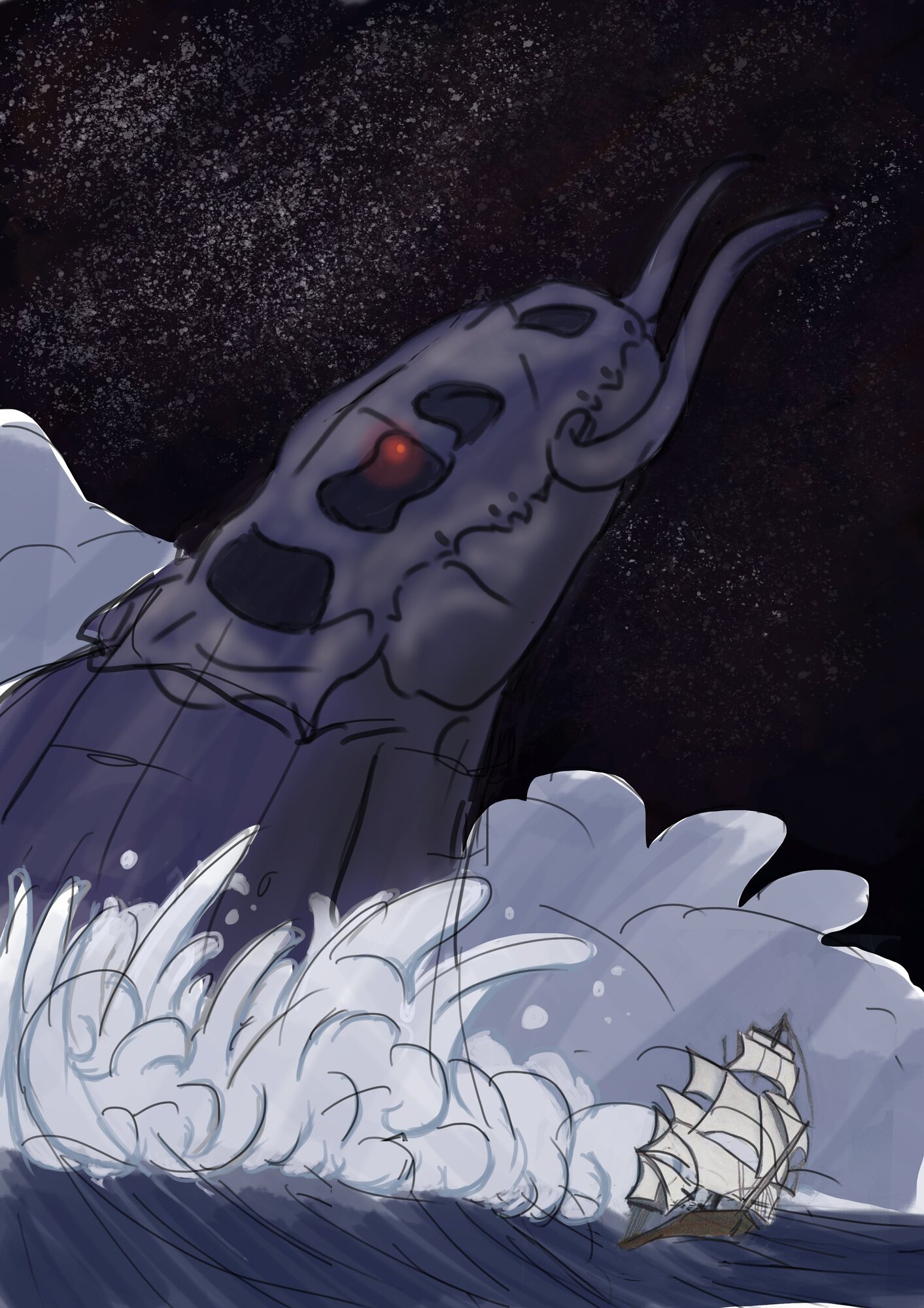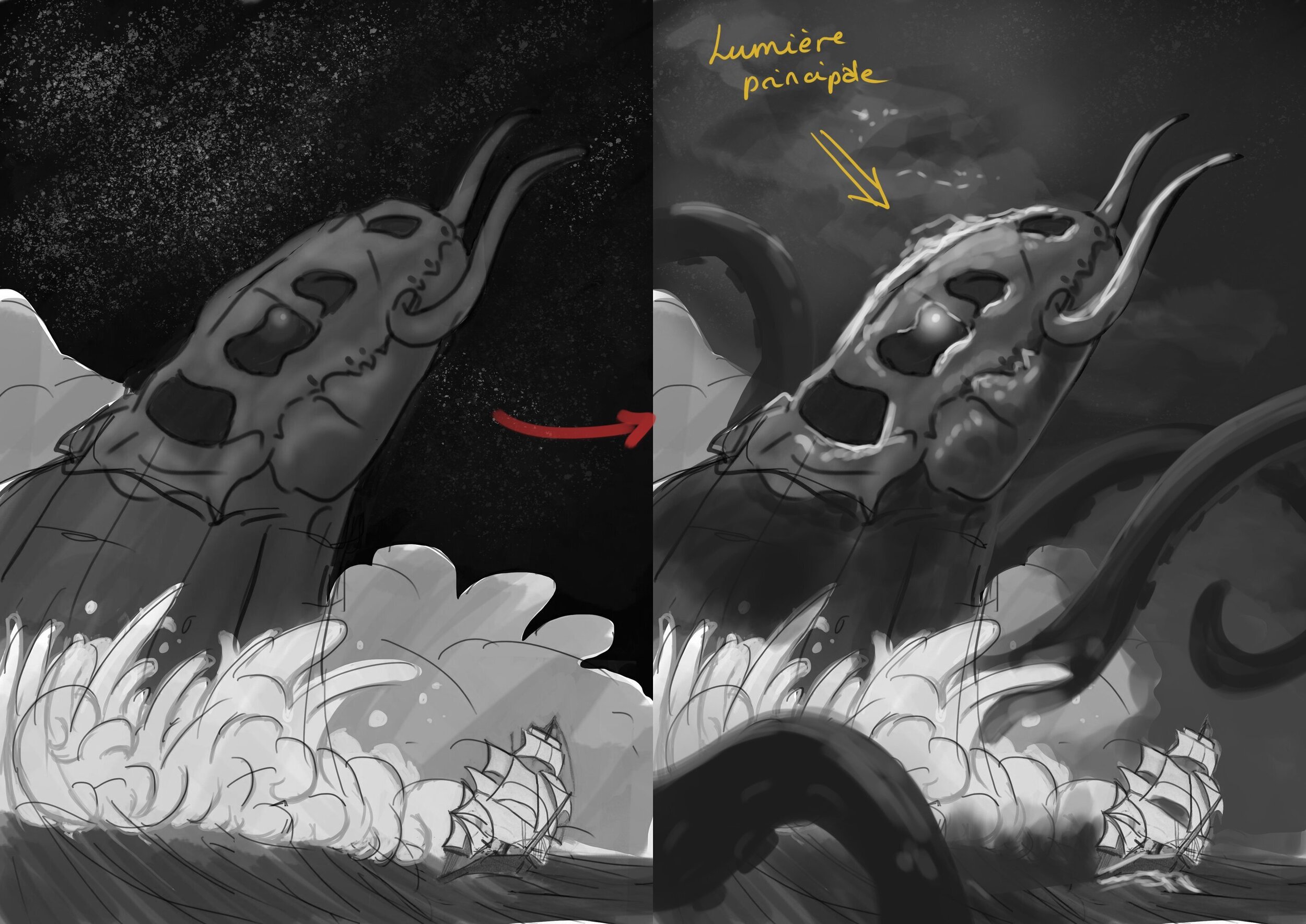 Bonne composition en effet ! Je te conseillerais cependant de revenir sur du noir et blanc avant de passer à la couleur (qui tu pourra mettre en incrustation). De bonnes valeurs de gris c'est essentiel pour la visibilité de ton image. Avec cette valeur de gris, par contraste, il sera important de venir mettre en valeur ta focale principale (la créature) et secondaire (le bateau). J'ai fait un très rapide PO pour te donner une idée de ce que je veux dire : C'est du vite fait mais j'espère que cela t'aidera à comprendre ce que je veux dire. N'hésite pas à étudier des images de références. Dans ton cas, les illustrations de Cthlhu (F. Baranger) par exemple, et autre du genre créature marine. Voici quelques exemples : Bon courage !3 points