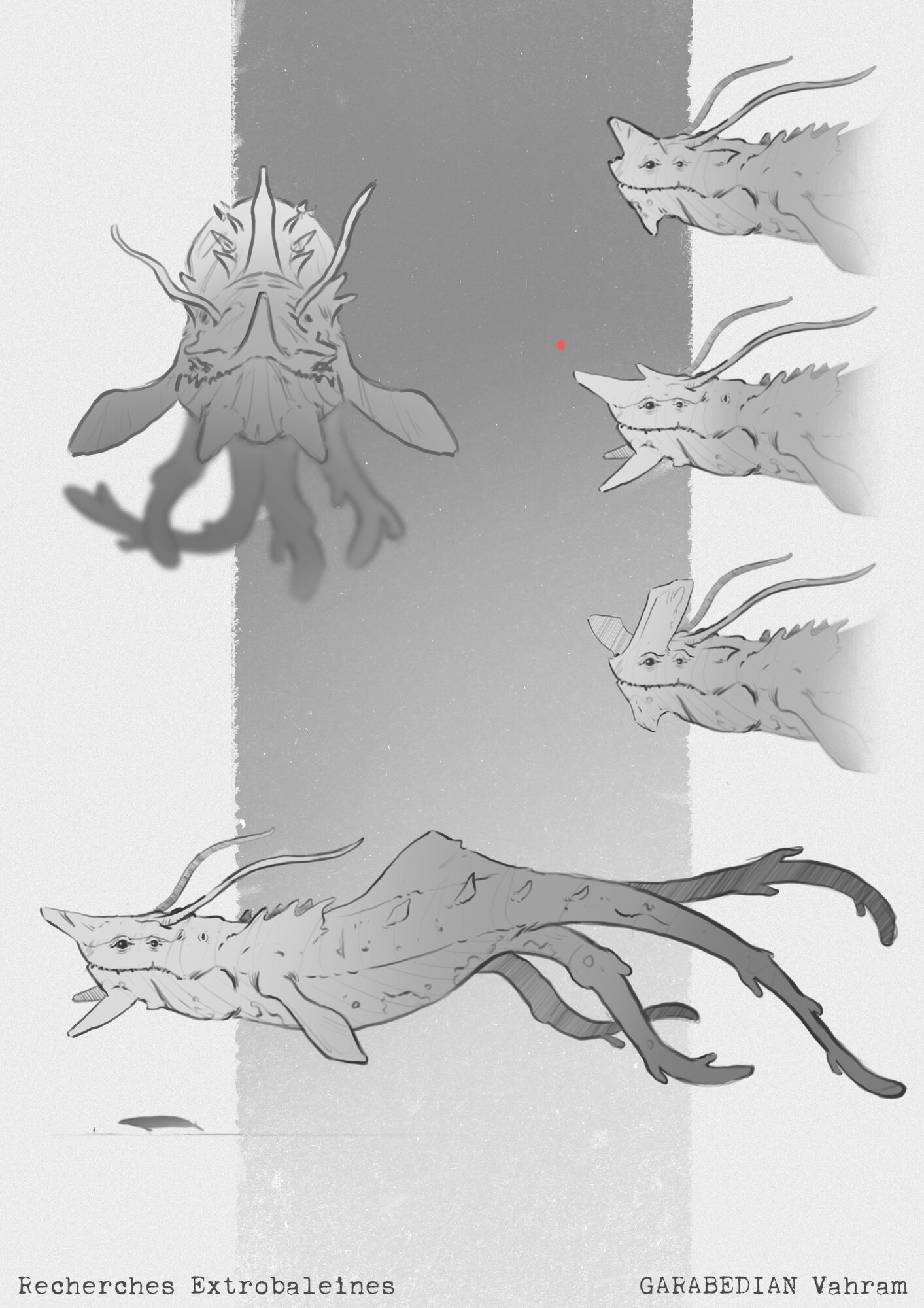 Bonjour tous le monde (qui passe par là ^^), Déjà bon courage à tous pour ceux qui participe :) Deuxième concours auquel je participe, mais c'est la première fois que je me dis : "Tiens, cette fois-ci je vais pas me lancer tout de suite dans une illu pour me rendre compte que c'est nul au bout de 10h !" Donc pour me motiver un peu (et comme beaucoup d'entre vous qui participe j'imagine), je me dit que ca peut être cool de partager ça avec d'autres, et même porter vers le haut le résultat final de ce que j'aurais fait seul dans mon coin. Alors pour commencer, j'ai choisi 3 thèmes parmis les personnages, environnements et autres êtres peuplant l'univers de Star Discovery, et j'ai retenu Rafael pour le personnage, le vaiseau eclaireur pour l'environnement et les exobaleines. Les exobaleines me semblent finalement le thème le plus abordables par rapport à la description faite, car j'ai tout de suite eu des idées de compo et cadrage et je savais donc quoi chercher. Une fois toutes les refs mises de côté, et n'ayant jamais dessiné vraiment de baleines (avec attention), j'ai donc commencé par faire quelques études rapide, pour avoir un peu le gabarit de l'animal en tête. A la suite de quoi j'ai immédiatement repris le croquis du bas pour créer une exobaleine, par itération, jusqu'à avoir une créature qui me semble en adéquation avec la description. Celle-ci mentionnant l'aspect de la femelle mais aussi du mâle, j'ai donc repris l'aspect "final" de ma femelle pour la transformer en un congénère du sexe opposé. J'ai aussi ajouté quelques petites descriptions, et pour moi, c'est donc la V4 femelle et la V2 du mâle qui me plaise le plus. Mais j'ai un doute avec les versions marqué d'un point d'interogation, car elle pourraient également correspondre je trouve. N'hésitez pas si vous avez des suggestions ou conseils à me proposer, je serai ravi de les écouter :)4 points