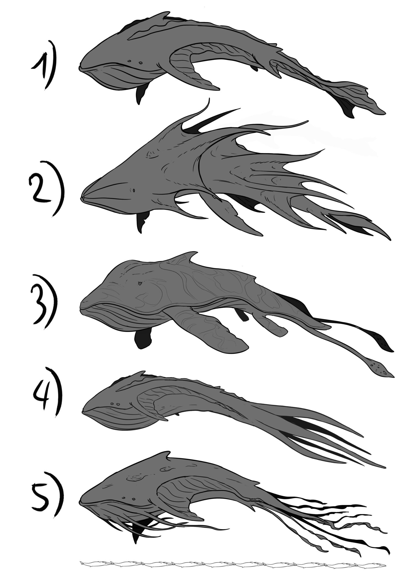 Et voilà les premiers essais de design pour ces "petits" cétacés 😄 N'hésitez à me dire celui que vous préférez 🙂 L'idée est d'en choisir l'un des cinq pour une extrobaleine "normal" que je vais ensuite adapter avec des caractéristiques plus particulière en fonction du membre du groupe Petits détails pour chaque variante : 1) les excroissances sur le dos et entre les "nageoires" sont des excroissances comme celles des seiches, que l'extrobaleine contrôle pour accélérer, les variantes 3,4 et 4 possèdent aussi ces excroissances 2) Cette variante là, ses excroissances se rapprochent plus des pieuvres avec deux manteaux de tissu et de tentacules 3) Celle-ci est beaucoup plus proche du corps d'une seiche 4) Variante avec des tentacules de calamars 5) Variante avec des tentacules de méduse2 points