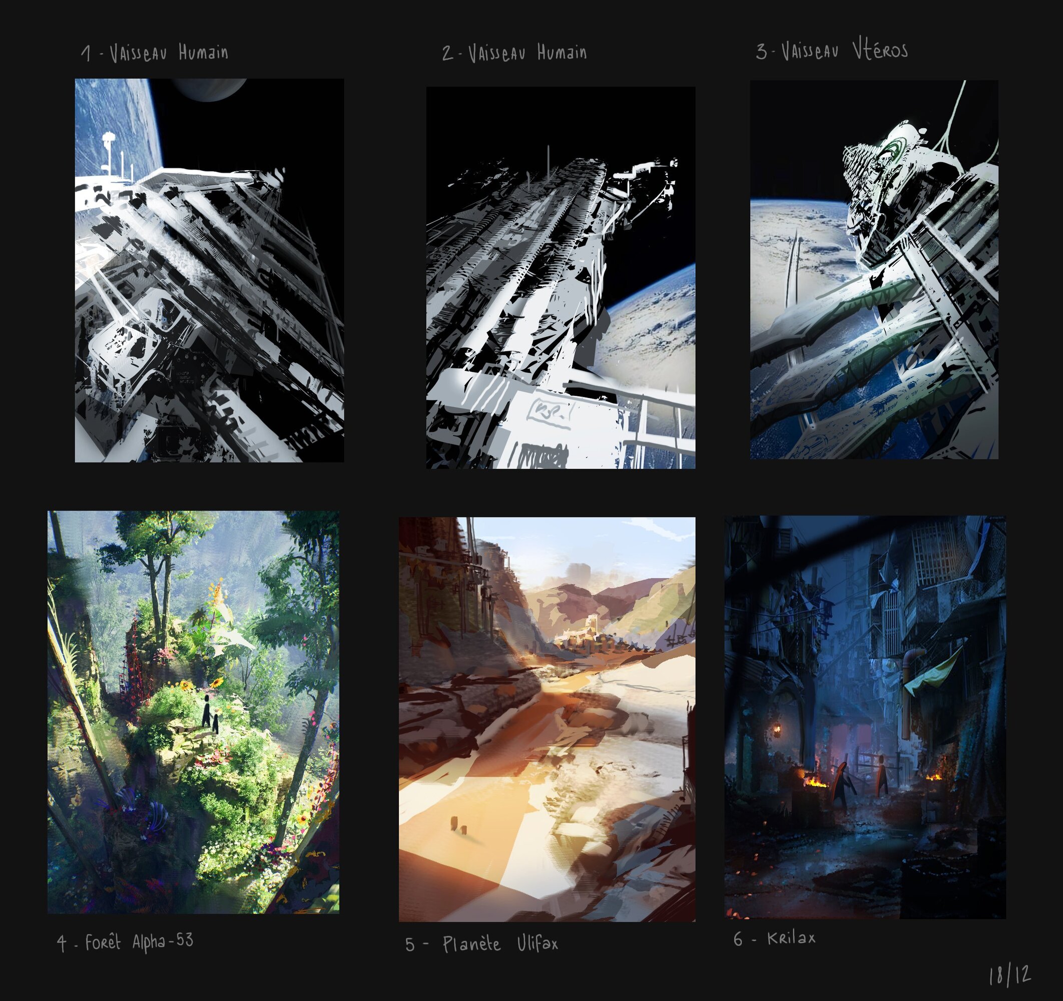 Bonjour tous le monde (qui passe par là ^^), Déjà bon courage à tous pour ceux qui participe :) Deuxième concours auquel je participe, mais c'est la première fois que je me dis : "Tiens, cette fois-ci je vais pas me lancer tout de suite dans une illu pour me rendre compte que c'est nul au bout de 10h !" Donc pour me motiver un peu (et comme beaucoup d'entre vous qui participe j'imagine), je me dit que ca peut être cool de partager ça avec d'autres, et même porter vers le haut le résultat final de ce que j'aurais fait seul dans mon coin. Alors pour commencer, j'ai choisi 3 thèmes parmis les personnages, environnements et autres êtres peuplant l'univers de Star Discovery, et j'ai retenu Rafael pour le personnage, le vaiseau eclaireur pour l'environnement et les exobaleines. Les exobaleines me semblent finalement le thème le plus abordables par rapport à la description faite, car j'ai tout de suite eu des idées de compo et cadrage et je savais donc quoi chercher. Une fois toutes les refs mises de côté, et n'ayant jamais dessiné vraiment de baleines (avec attention), j'ai donc commencé par faire quelques études rapide, pour avoir un peu le gabarit de l'animal en tête. A la suite de quoi j'ai immédiatement repris le croquis du bas pour créer une exobaleine, par itération, jusqu'à avoir une créature qui me semble en adéquation avec la description. Celle-ci mentionnant l'aspect de la femelle mais aussi du mâle, j'ai donc repris l'aspect "final" de ma femelle pour la transformer en un congénère du sexe opposé. J'ai aussi ajouté quelques petites descriptions, et pour moi, c'est donc la V4 femelle et la V2 du mâle qui me plaise le plus. Mais j'ai un doute avec les versions marqué d'un point d'interogation, car elle pourraient également correspondre je trouve. N'hésitez pas si vous avez des suggestions ou conseils à me proposer, je serai ravi de les écouter :)4 points