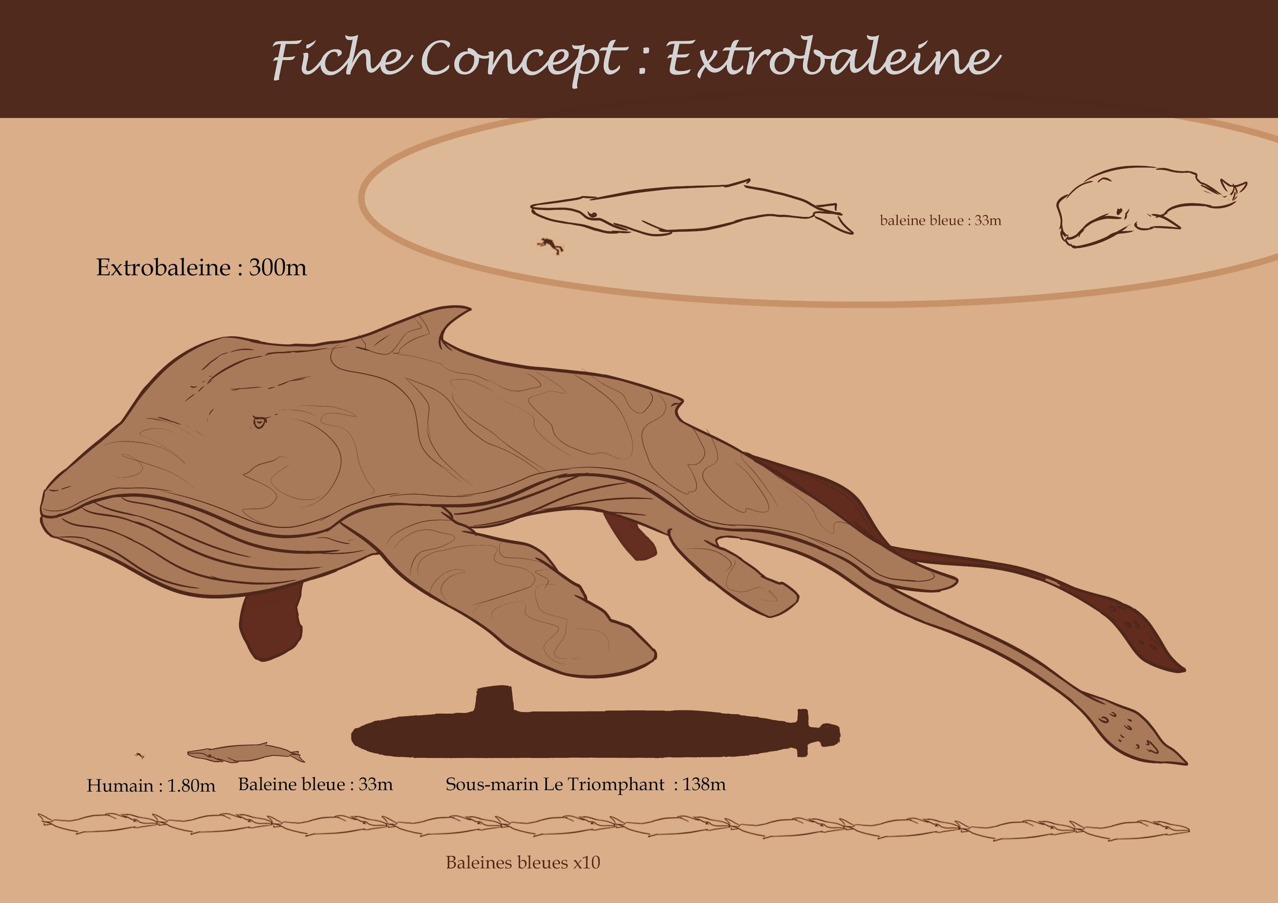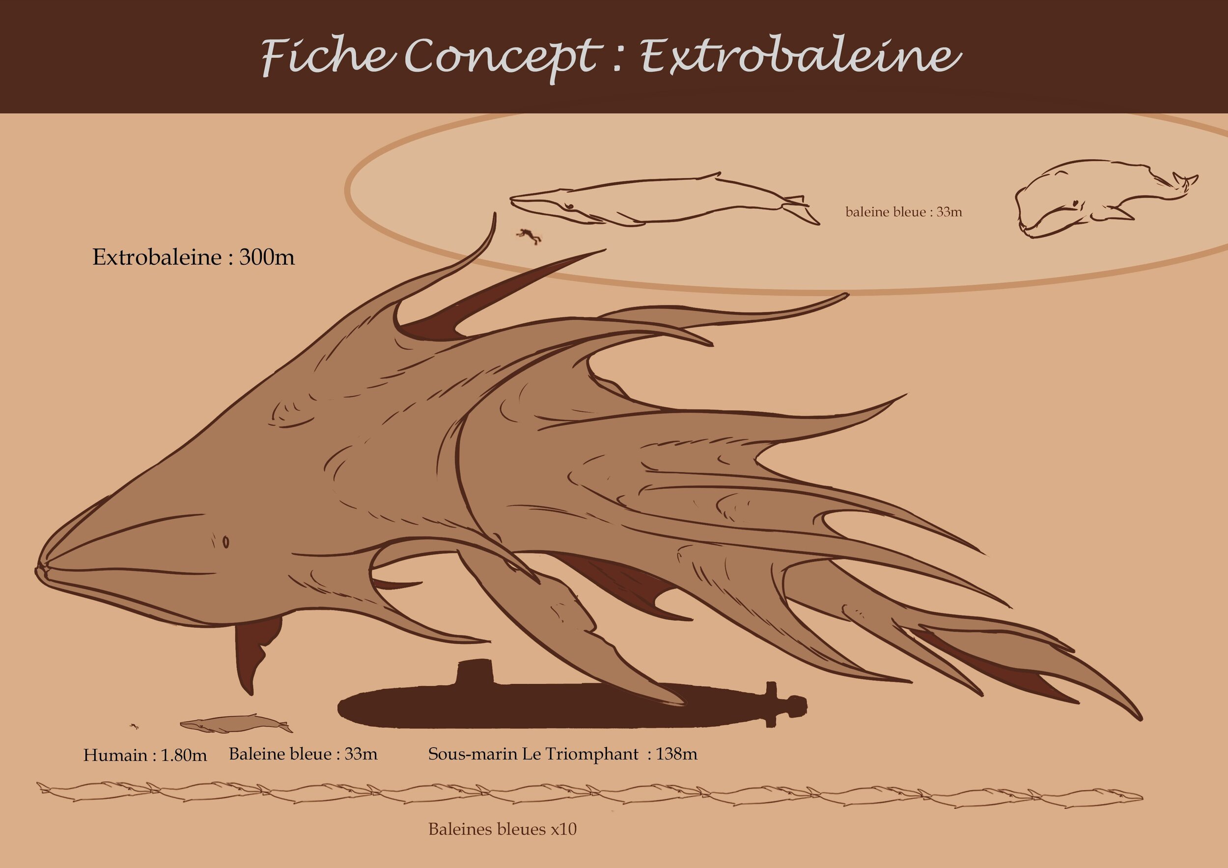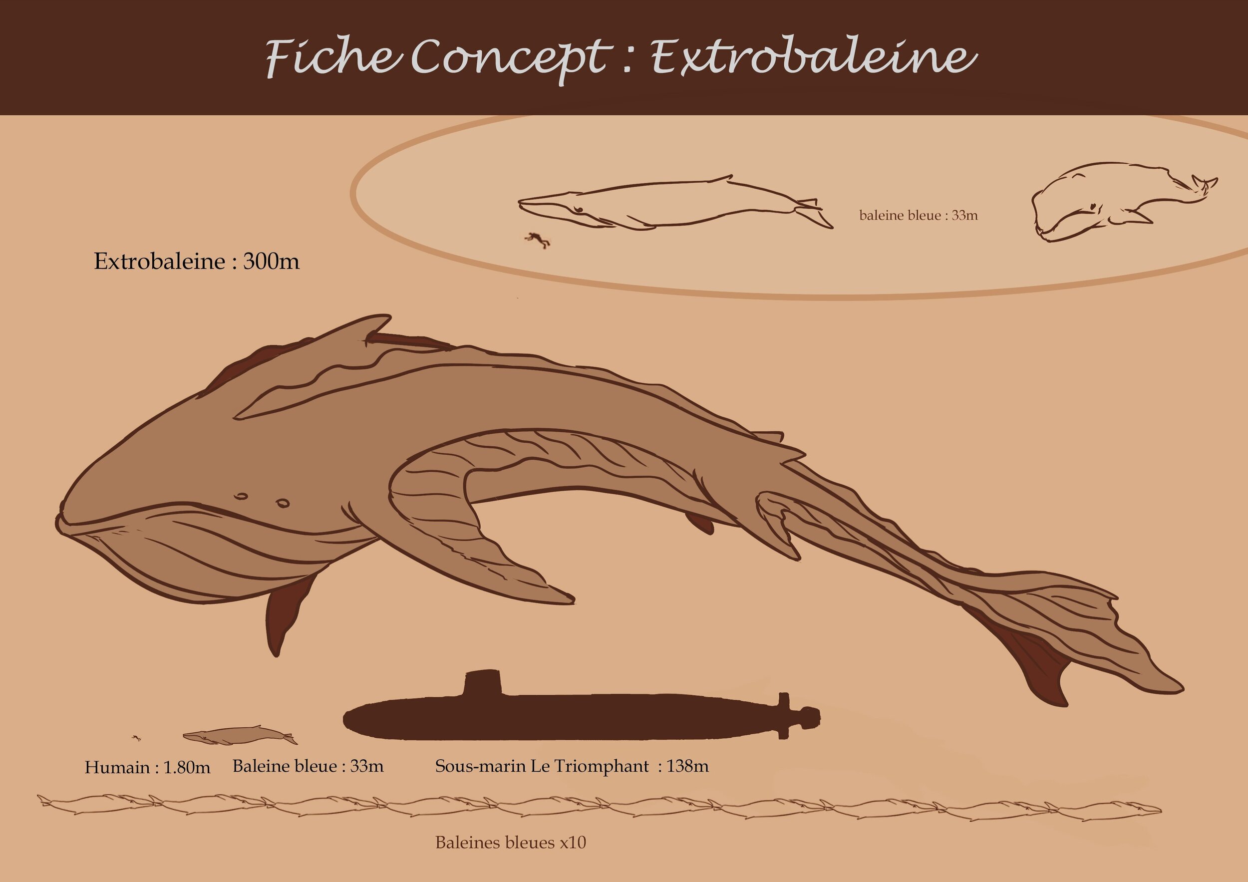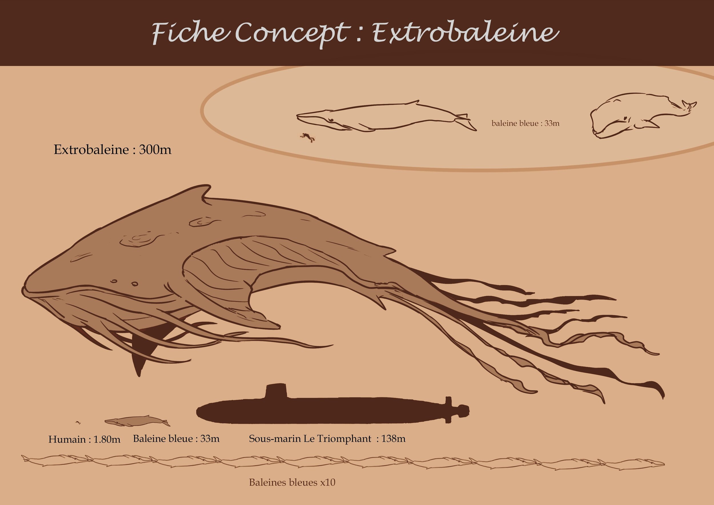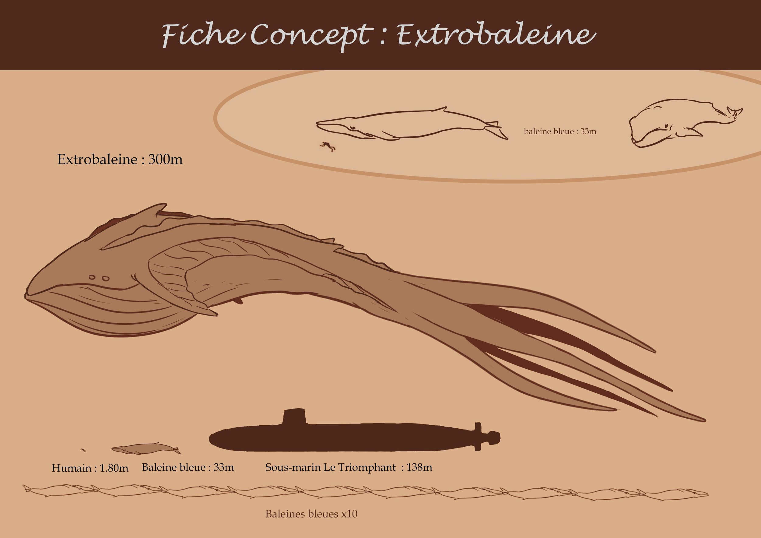 Bien le bonjour 😄 Bon après de longues réfléxions et test, j'ai étais bien inspiré pour les Extrobaleine 😄 Je suis donc partie sur deux types de "baleines". Je me suis permis d'écrire une sorte de "carnet de bord" de scientifique qui analyse ces créatures. Je le met a jours de temps en temps quand me viens des idées, donc veuillez me pardonner si il y a des fautes, je n'ai pas toujours le temps de me corriger tout de suite après xD La première : Extrobaleine nourricière! L'unique baleine de cette planète qui peut engendrer la vie ! C'est une créature extrêmement fragile et sensible, cette sensibilité est due à une particularité encore peu comprise, mais as première vue elle serait capable de capter les informations émotionnelles de ces congénères ainsi que leurs histoires dans le but de les transmettres à sa progéniture. Nous ne savons pas encore pourquoi, mais nous avons l'hypothèse que cette extrasensibilité l'aurait rendu aveugle pour ne pas surcharger ses capacitées cérébrales. Ce qui rend la pauvre bête d'autant plus fragile. Pour ce qui est de la progéniture, c'est la première créature de l'univers qui met aux défis toutes nos connaissances dans ce domaine. Tels des kangourous, le bébé grandis dans une poche a l'extérieur du ventre de la baleine, mais contrairement à elle, la peau qui protège ce nourrisson est extrêmement fine et fragile c'est pour quoi elle possède un trio de nageoire lui permettant de pouvoir se stabiliser totalement, même en cas des plus grandes tempêtes. La mère surveille en permanence l'état de sa progéniture grâce aux deux paires de trois tentacules qu'elles possèdent, contrairement à celle de ces congénère, les soigneuses, celle-ci permette de nourrir et apaiser le bébé durant sa gestation. Nous avons beaucoup parlé de sa fragilité c'est pourquoi elle ne se déplace jamais sans un autre type de baleine. Extrobaleine Protectrice Les colossales et féroces protectrices ! très ressemblent sur la forme à des cachalots de notre monde, mais en bien plus imposant. La principale propriété de ce type sont les épaisses couches de coraux qui apparaissent aux extremités de la créature ainsi que sur les zones sensibles de son corps. Nous n'avons encore rien vu capable de rivaliser avec la résistance de ces animaux ! même au bord de la mort ils défendent avec férocité leurs nourricières. Leur seul point faible est la vitesse, mais qui est vite compensée par leurs intelligences et leurs tailles !2 points