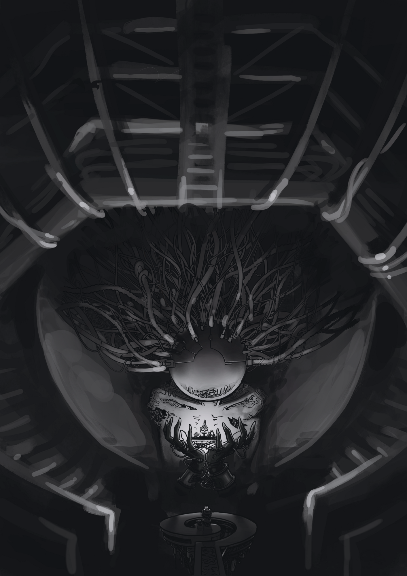 Bien le bonsoir tout le monde ! Voici un petit point sur mes avancées. J'ai un workflow assez erratique sur ce painting où j'alterne entre phases de line art + nettoyage, et de recherche de valeurs / composition. Après le premier sketch de mon post précédent, j'ai ainsi détaillé le line art du coeur de l'image : (c'est une capture d'écran que j'avais posté sur Discord, désolé pour la piètre qualité) Puis je suis reparti sur une technique un peu plus peinture: C'est vraiment le bazar, mais j'ose espérer que ça va finir par converger vers quelque chose de clean 🤞 Je trouve la compo actuelle assez intéressante avec l'idée de l'oeil en "paréidolie" (le fait de voir un truc alors qu'il n'y est pas, comme voir un visage dans un nuage). Cela vient encore renforcer le passage du Fètprox à la machine, floutant encore un peu plus la limite de leurs consciences. Et puis cela rajoute un niveau de hiérarchie supplémentaire: l'astronaute, le conseil, le Fètprox, la machine. Je voulais aussi dire deux mots sur le caractère symétrique de la compo. D'habitude, on a tendance à éviter ce genre de choix, car cela rend le plus souvent le painting ultra statique, car sans déséquilibre. Après réflexion, c'est en fait précisément ce que je veux ici. La compo n'en est que moins organique, beaucoup plus rigide, à l'image même des Fètprox qui ne bougent plus beaucoup et qui auraient atteint cet état de stase quasi divin 🤔 A bientôt !2 points
