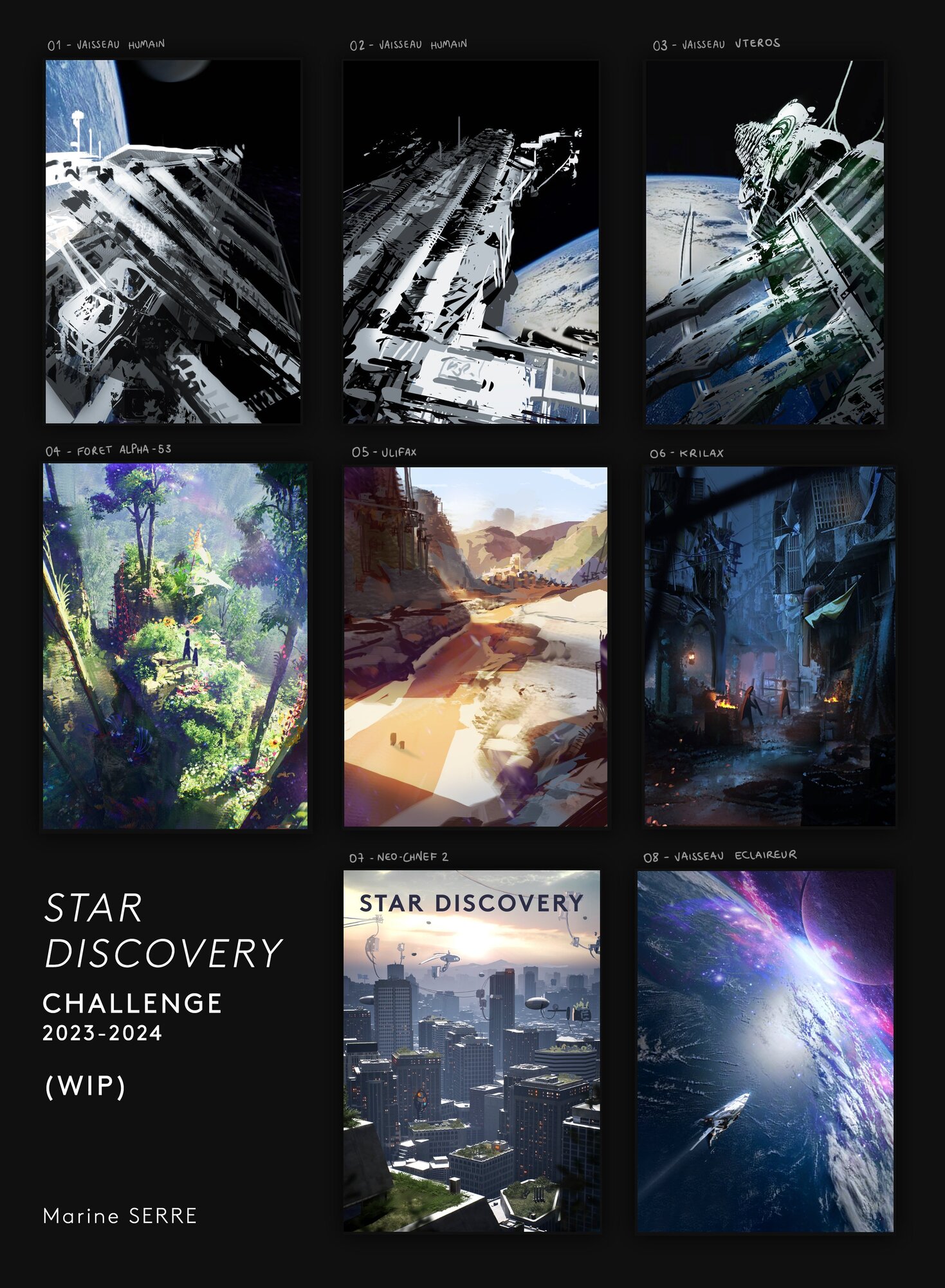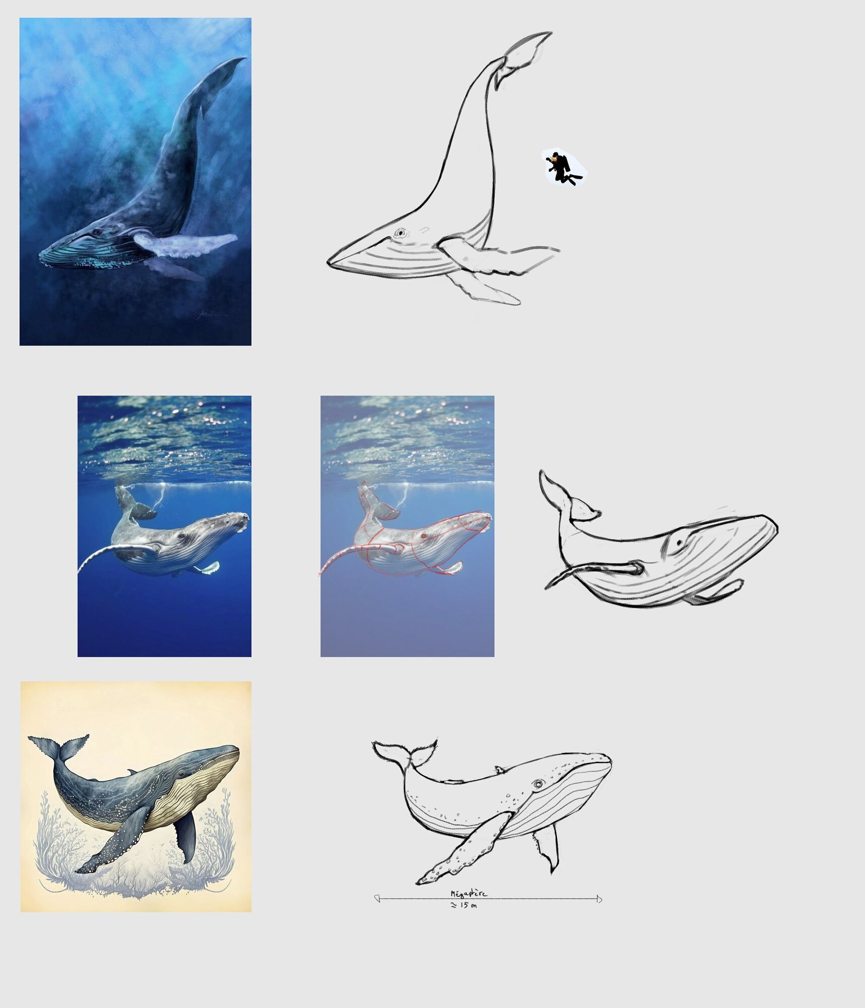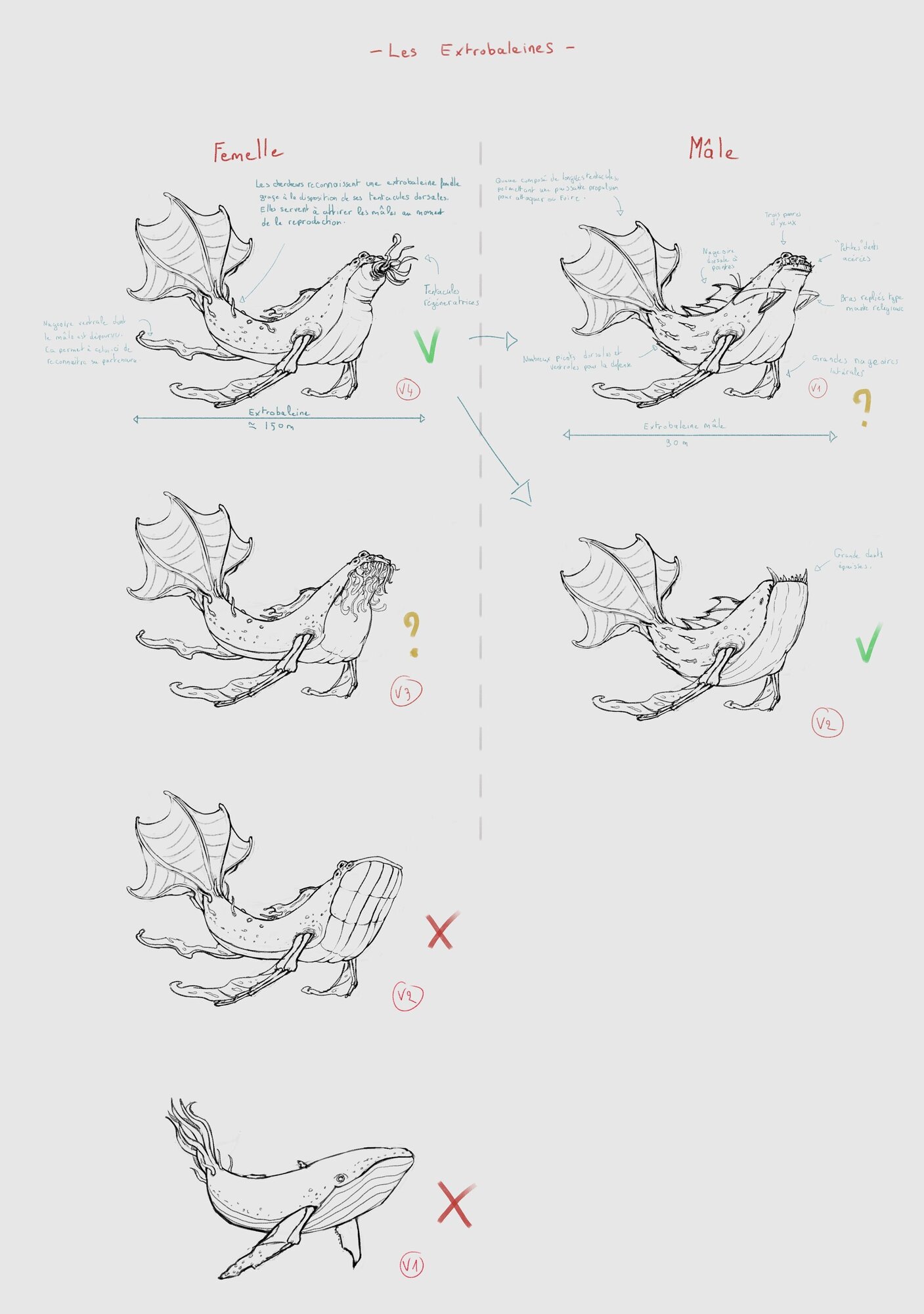 Bonjour tous le monde (qui passe par là ^^), Déjà bon courage à tous pour ceux qui participe :) Deuxième concours auquel je participe, mais c'est la première fois que je me dis : "Tiens, cette fois-ci je vais pas me lancer tout de suite dans une illu pour me rendre compte que c'est nul au bout de 10h !" Donc pour me motiver un peu (et comme beaucoup d'entre vous qui participe j'imagine), je me dit que ca peut être cool de partager ça avec d'autres, et même porter vers le haut le résultat final de ce que j'aurais fait seul dans mon coin. Alors pour commencer, j'ai choisi 3 thèmes parmis les personnages, environnements et autres êtres peuplant l'univers de Star Discovery, et j'ai retenu Rafael pour le personnage, le vaiseau eclaireur pour l'environnement et les exobaleines. Les exobaleines me semblent finalement le thème le plus abordables par rapport à la description faite, car j'ai tout de suite eu des idées de compo et cadrage et je savais donc quoi chercher. Une fois toutes les refs mises de côté, et n'ayant jamais dessiné vraiment de baleines (avec attention), j'ai donc commencé par faire quelques études rapide, pour avoir un peu le gabarit de l'animal en tête. A la suite de quoi j'ai immédiatement repris le croquis du bas pour créer une exobaleine, par itération, jusqu'à avoir une créature qui me semble en adéquation avec la description. Celle-ci mentionnant l'aspect de la femelle mais aussi du mâle, j'ai donc repris l'aspect "final" de ma femelle pour la transformer en un congénère du sexe opposé. J'ai aussi ajouté quelques petites descriptions, et pour moi, c'est donc la V4 femelle et la V2 du mâle qui me plaise le plus. Mais j'ai un doute avec les versions marqué d'un point d'interogation, car elle pourraient également correspondre je trouve. N'hésitez pas si vous avez des suggestions ou conseils à me proposer, je serai ravi de les écouter :)1 point