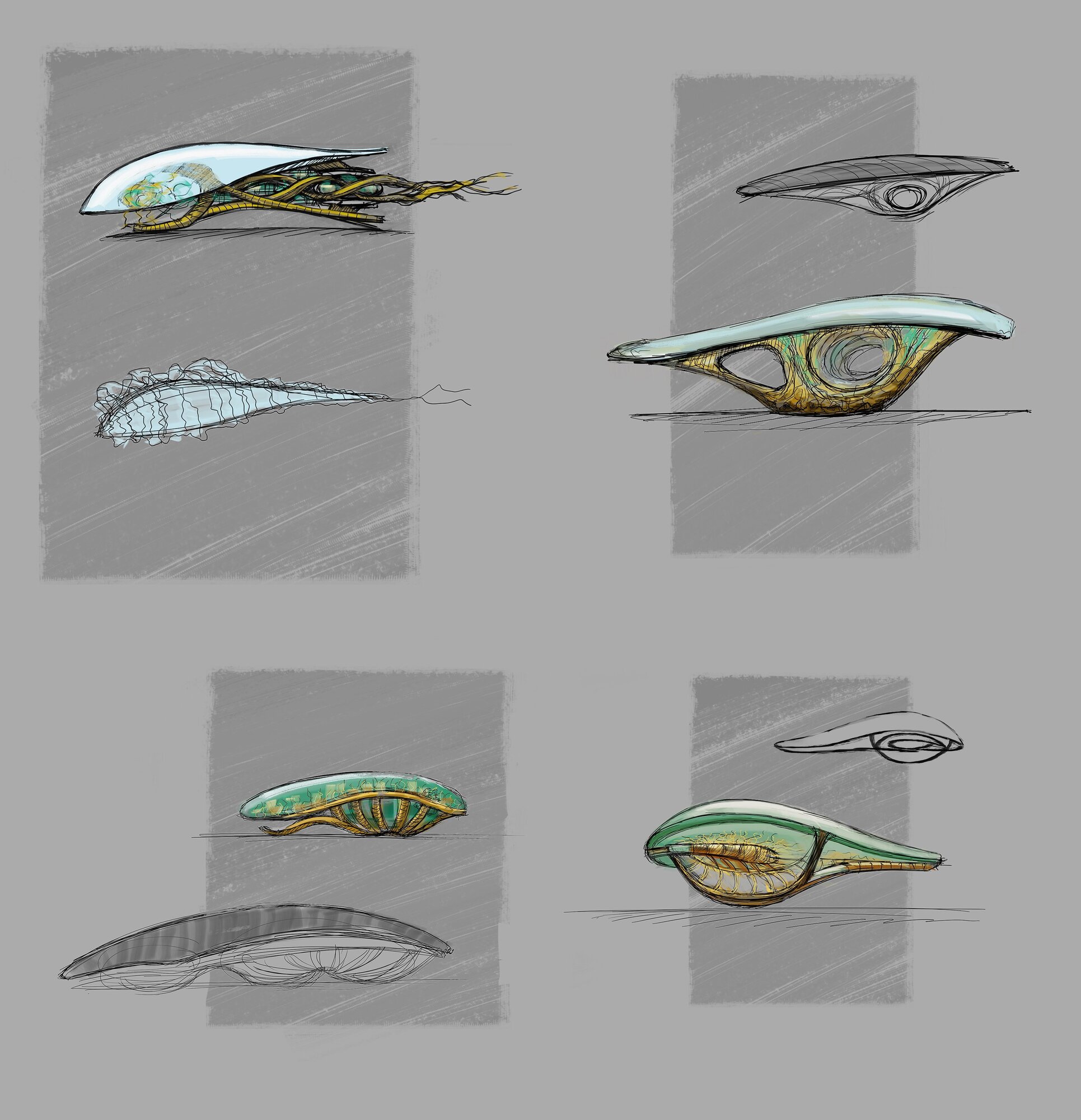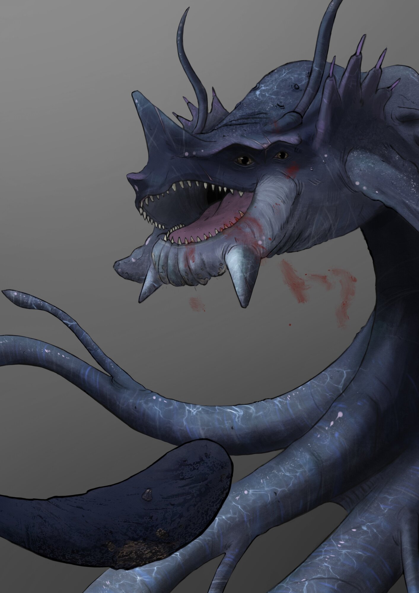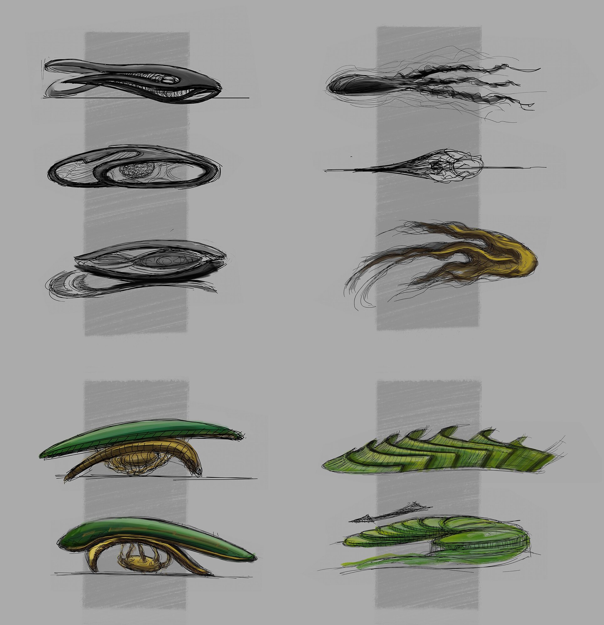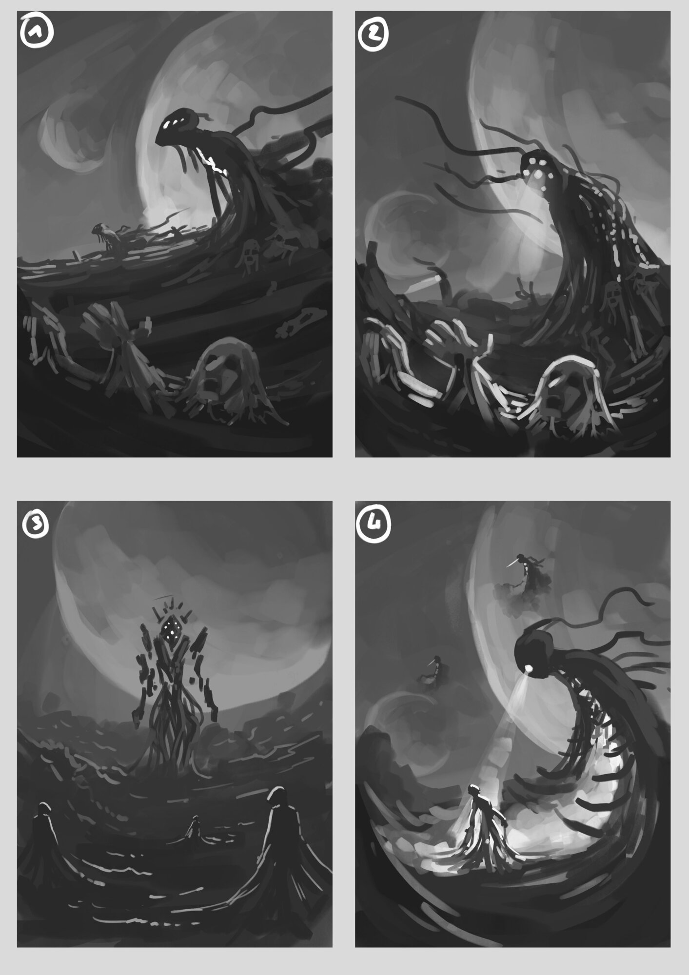 Salut à tous, j'arrive un peu tard mais c'est parti pour ce nouveau challenge ! Je vais partir sur les "spirit eaters" pour ma première participation. J'ai essayé de sortir les éléments importants du brief, à savoir : - l'aspect moisson/assimilation --> je suis rapidement parti sur l'idée d'une vague qui absorbe toute la vie sur son passage, qui se répand sur des planètes entières - l'aspect psychique/folie --> pas encore très clair comment je le prends en compte, j'ai essayé de leur mettre des sortes d'yeux luminescents mais à creuser - l'aspect prophétique --> donner un air un peu mystique, indescriptible aux créatures (l'idée de la vague fonctionne plutôt bien comme une sentence divine, type le Déluge dans la Bible) - l'aspect expansion intergalactique --> essayer de rendre les créatures flottantes ? insensibles à la gravité ? pas encore très clair non plus Voilà donc mes premiers jets de concept : En terme de compo, j'ai vite eu l'idée d'une scène de nuit, avec une ou plusieurs lunes gigantesques derrière (dans le style de Pandora dans Avatar). Voila quelques premiers thumbs : Merci d'avance pour vos retours ! 😀4 points