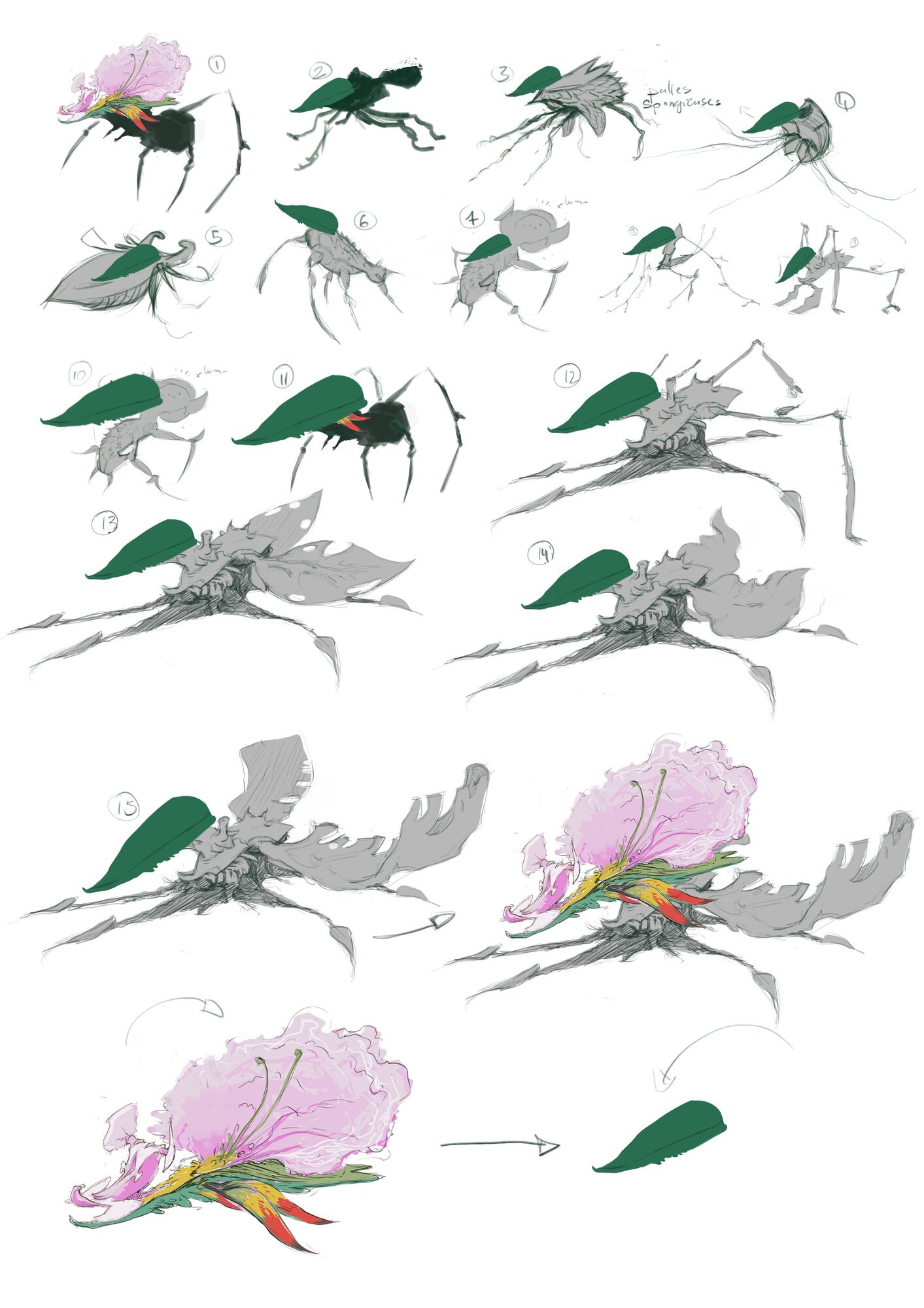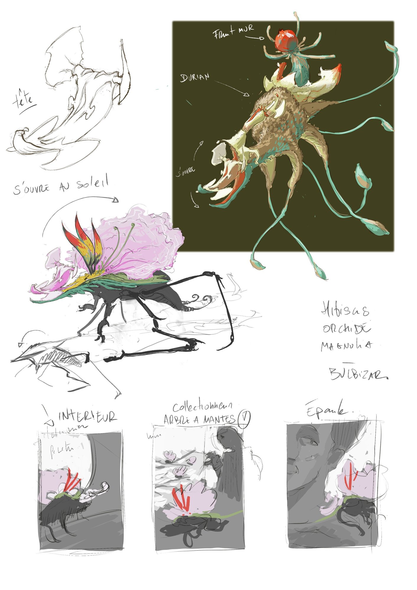 Bonjour à tous ! Pour commencer, un grand bravo à l'équipe DPS pour ce nouveau défi. Vraiment inspirant et libre à souhait. C'est vraiment du beau boulot, ou allez vous chercher tout ça ? Rien qu'avec cette univers, il y a moyen de faire son book. Merci ! J'ai eu plusieurs idées en lisant le brief, mais cette fois je n'aurais probablement pas le temps de soumettre 3 propositions et c'est bien dommage.... 😉 Voici pour commencer, mes premières recherche sur " Les Mantes de Dentis" Une créature plante/fleur qui s'ouvre au soleil et se referme la nuit venue, Forme insectoïde dont j'essaie de m'éloigner le plus possible, coloré et sublime et qui produit évidement un fruit chaque saison de reproduction.2 points