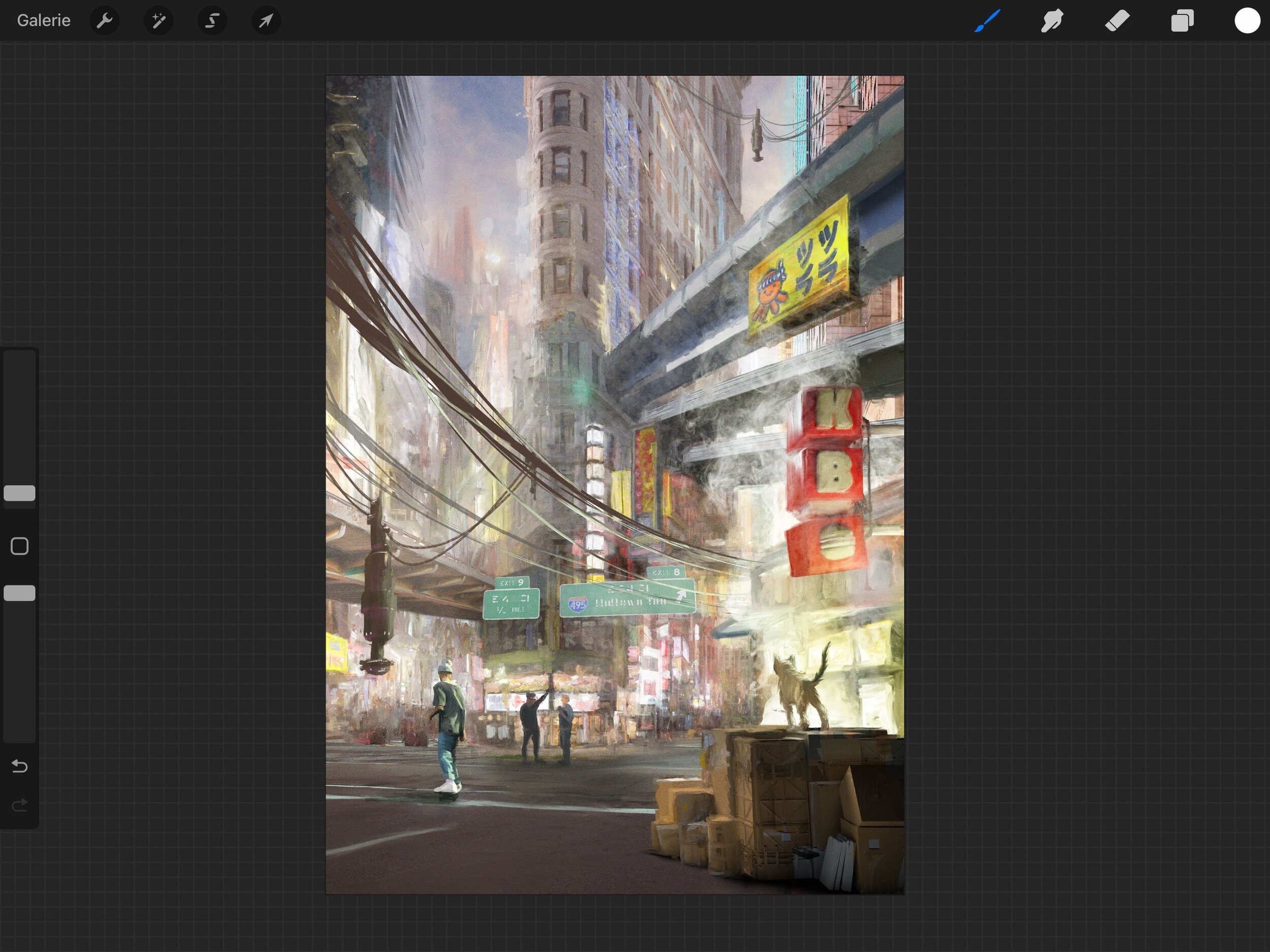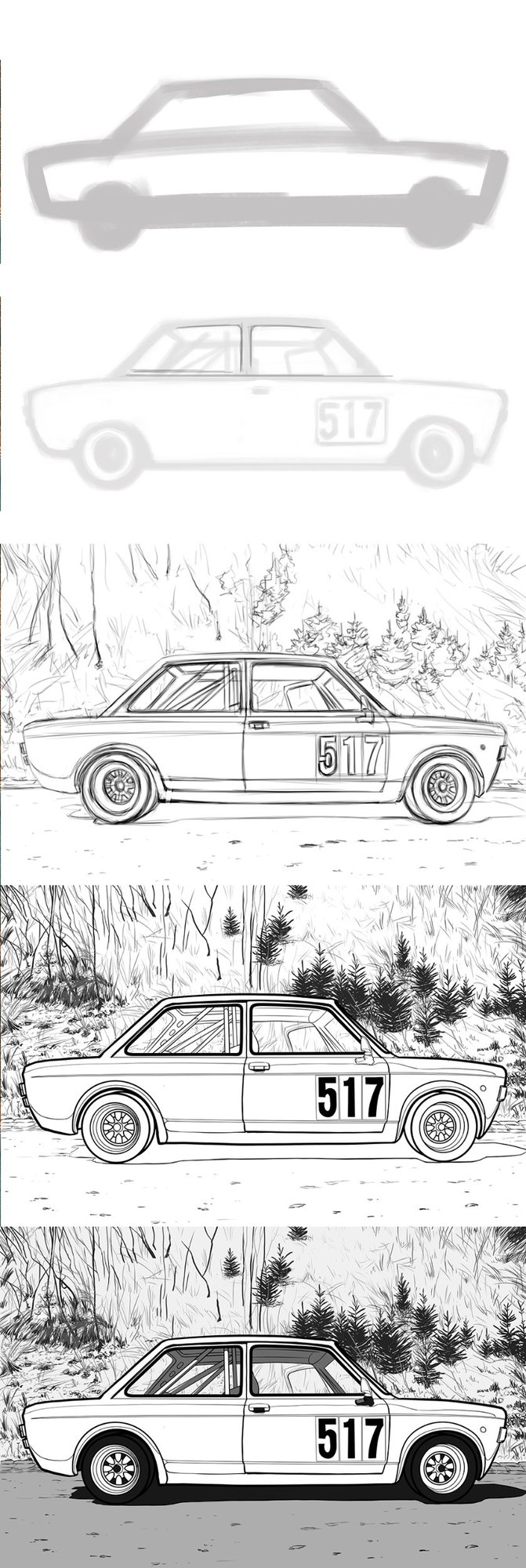 Salut à tous, Merci @Schmaxpour ton retour. J'ai continué le travail du croquis avec la voiture. Je n'ai pas lésiné sur l'utilisation de la plume pour les longues courbes et de Lazy Nezumi pour le smoothing et les ellipses. Je me suis essayé au rendu du fond en traits (une bonne prise de tête) et puis j'ai finalement eu recours à des aplats de différents tons pour séparer les différents plans. Critiques are welcome! Je continue les croquis... Bons paintings à tous et bonne fin de WE!1 point