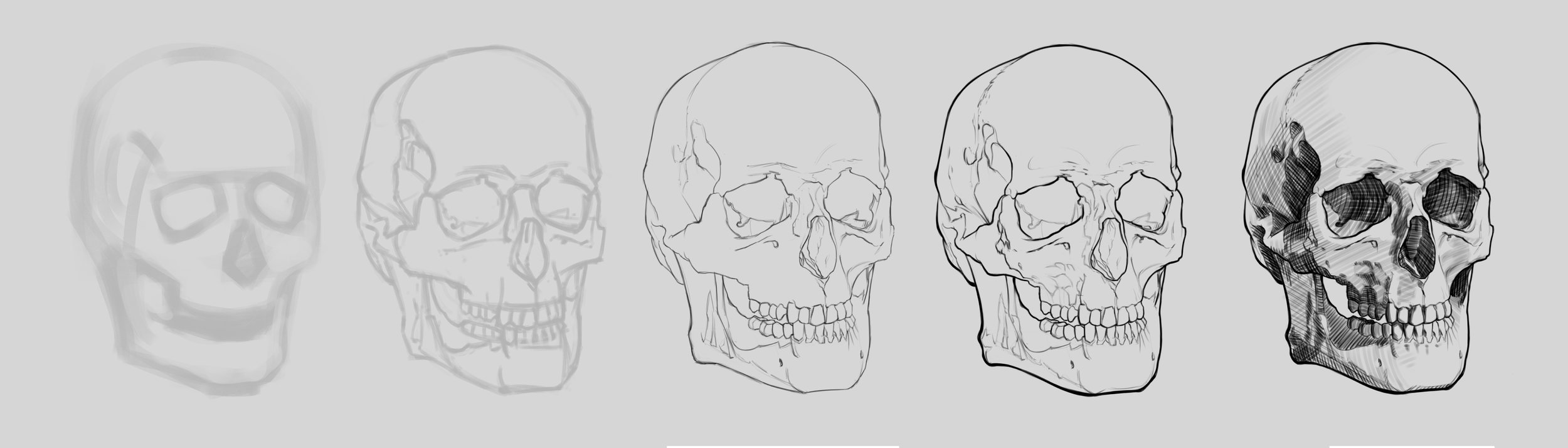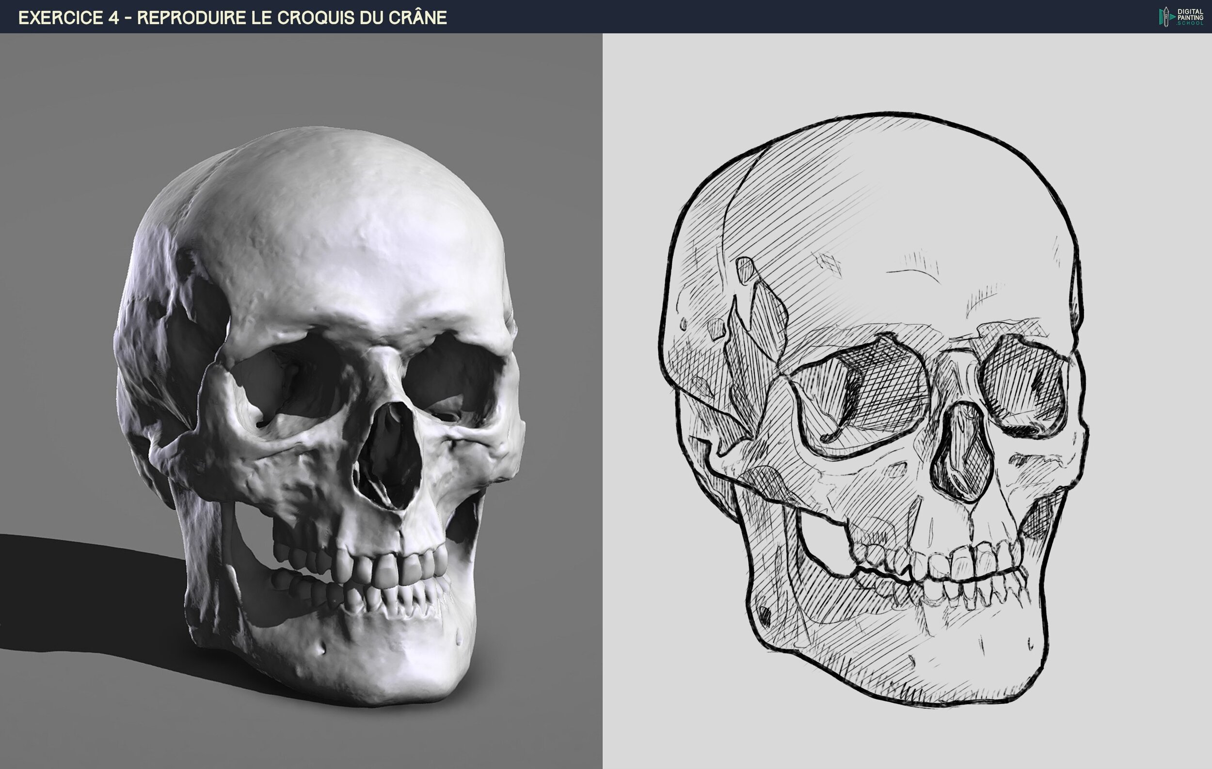 Hello ! Bon alors là je suis plutôt impressionné, le rendu est vraiment top, tes proportions sont justes, le poids des lines est plutôt cohérent même si j'aurai un peu différencier le haut du contour des orbites et le bas (plus éclairé) Pour les hachures ca fonctionne bien je trouves, en effet c'est pas évident mais ne t'en fais pas ce n'est pas tout à fait le sujet du chapitre. Néanmoins si tu veux pousser un peu plus tes études sur le sujet, je te conseil d'aller voir le travail de villarrte sur insta qui fait vraiment une bonne utilisation des hachures au service de ses volumes : https://www.instagram.com/villarrte/?hl=fr1 point