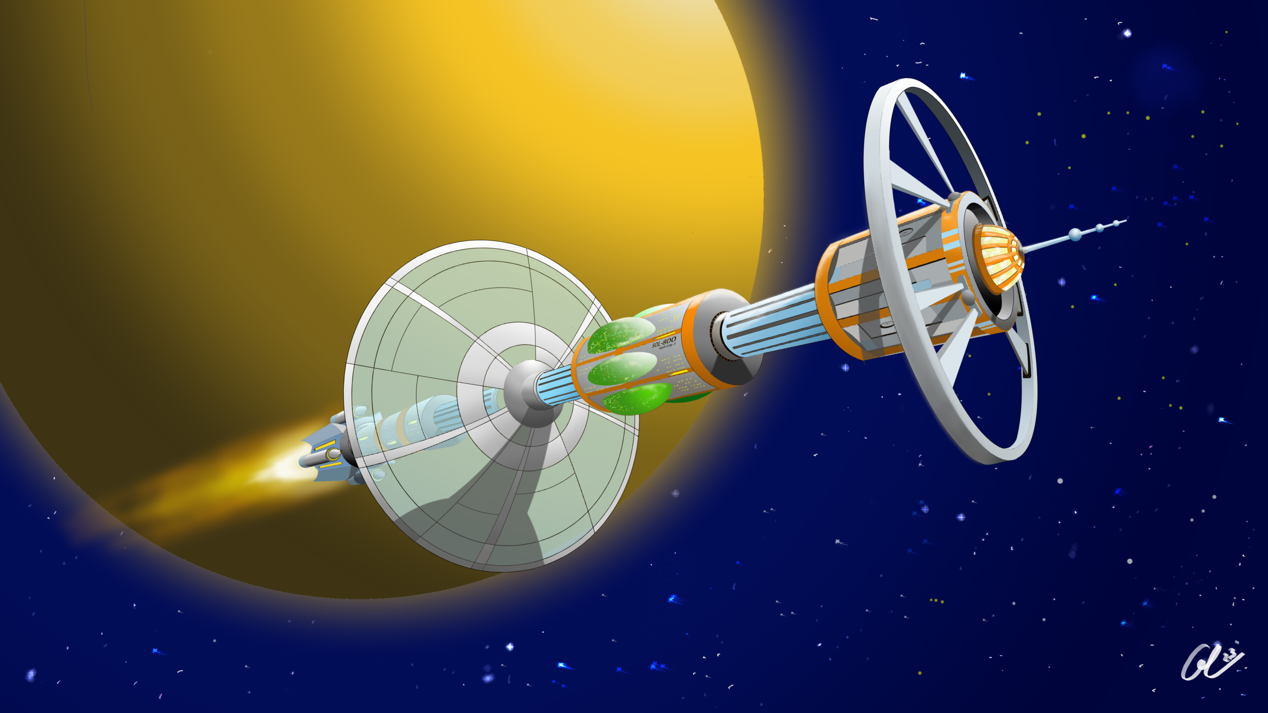 Voici donc les 3 compositions que je garde. J'ai décidé de retourner la première image pour en faciliter la lecture. L'impression que j'ai c'est que dans le sens de base l'œil se pose d'abord sur le vaisseau puis descend en bas à gauche de l'image sur les rochers puis y reste. Alors qu'en inversant j'ai plus l'impression que l'œil passe du vaisseau aux rochers puis et à nouveau attiré par le vaisseau. Ce qui crée une boucle et maintien le focus sur l'élément principal. 10. Sphères Vous aurez certainement remarqué que je n'ai pas encore réellement travaillé sur les sphère qui gravitent autour du vaisseau. Et bien c'est le moment, d'en parler. Voici mon idée de base. L'idée c'est d'avoir des moteurs et armes rétractables. La manière dont elle se déplace est assez simple. On a sur chaque côté un anneau de boosters, il suffit d'activer certains boosters pour choisir une direction, avant/arrière, haut/bas. En ce qui concerne les rotations, il suffit d'allumer avant droite et arrière gauche pour faire une rotation sur Z par exemple. Etant donné leur taille et le fait qu'elle ne sont qu'à 300m d'un vaisseau qui fait 12Km elle ne seront que peut visible. Autre exemple de rotation. Ca me fait penser, je n'en pas parler mais c'est d'une façon similaire que le vaisseau peut tourner sur lui même. En effet, aux extrémités de chacuns des pilliers qui permettent de générer le bouclier du vaisseau, se trouve des boosters ainsi qu'à leur base. Grâce à ceux-ci le vaisseau peut effectuer toute sorte de rotations. 11. Finalisation Après quelques ajustement et correction voici ce que j'ai réussi à faire. (Comme mentionné, en respectant les échelles, les sphères sont assez petites il y en a 5 dans la première et 4 dans les deux autres, saurez vous toutes les voir ?) 12. Notes de fin Ayant commencé le challenge très tard (vers le 25janvier) je dois avouer que ça aurait été assez intense pour finir dans les temps. Je comptes pas le nombre de tutos regardés et de correction que j'ai du faire, notamment le texturing que j'ai du refaire entièrement vu que c'était très mal fait, oups. Mais j'aime beaucoup le résultat alors ça valait clairement le coup Ca aura été extrêmement enrichissant, j'ai plus appris sur Blender en 2 semaines que sur le dernier mois. Donc pour ça merci pour le challenge. PS: Si vous avez tout lu bravo et merci ! :)2 points