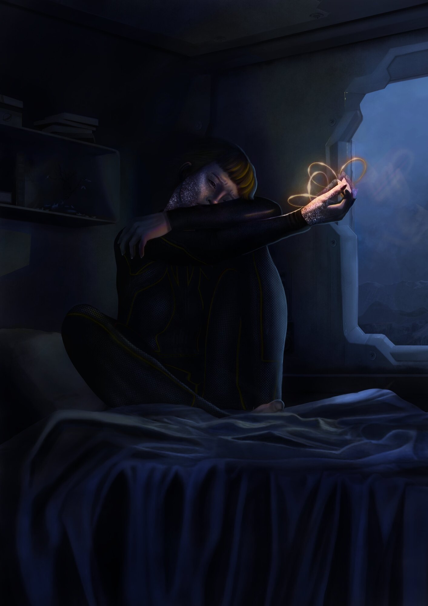 Bonjour, Merci @daff de ton retour, effectivement je comptais mettre un peu de jaune (je l'avais déjà fait sur le mur du fond et légèrement sur le drap mais de manière très subtile). Le jaune ne sera pas très prononcé car je souhaite que l'environnement reste dans des bleus assez froid, pour accentuer ce côté tristesse, dépression. En soit la lumière est plus proche de celle d'une luciole qui éclaire ce qui est à proximité que celle d'une lampe. Voici la suite du painting. Penses-tu qu'il faille accentuer le jaune dans l'environnement?3 points