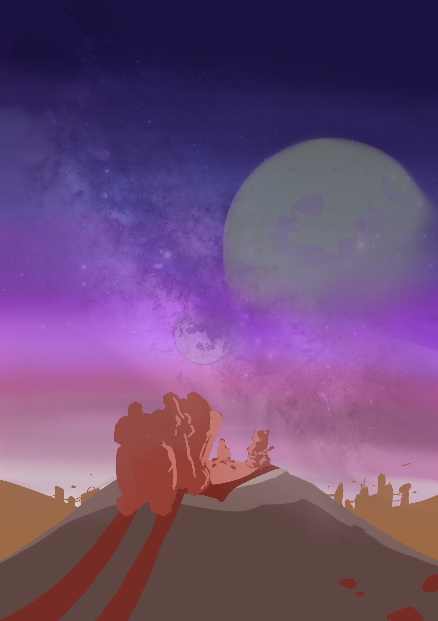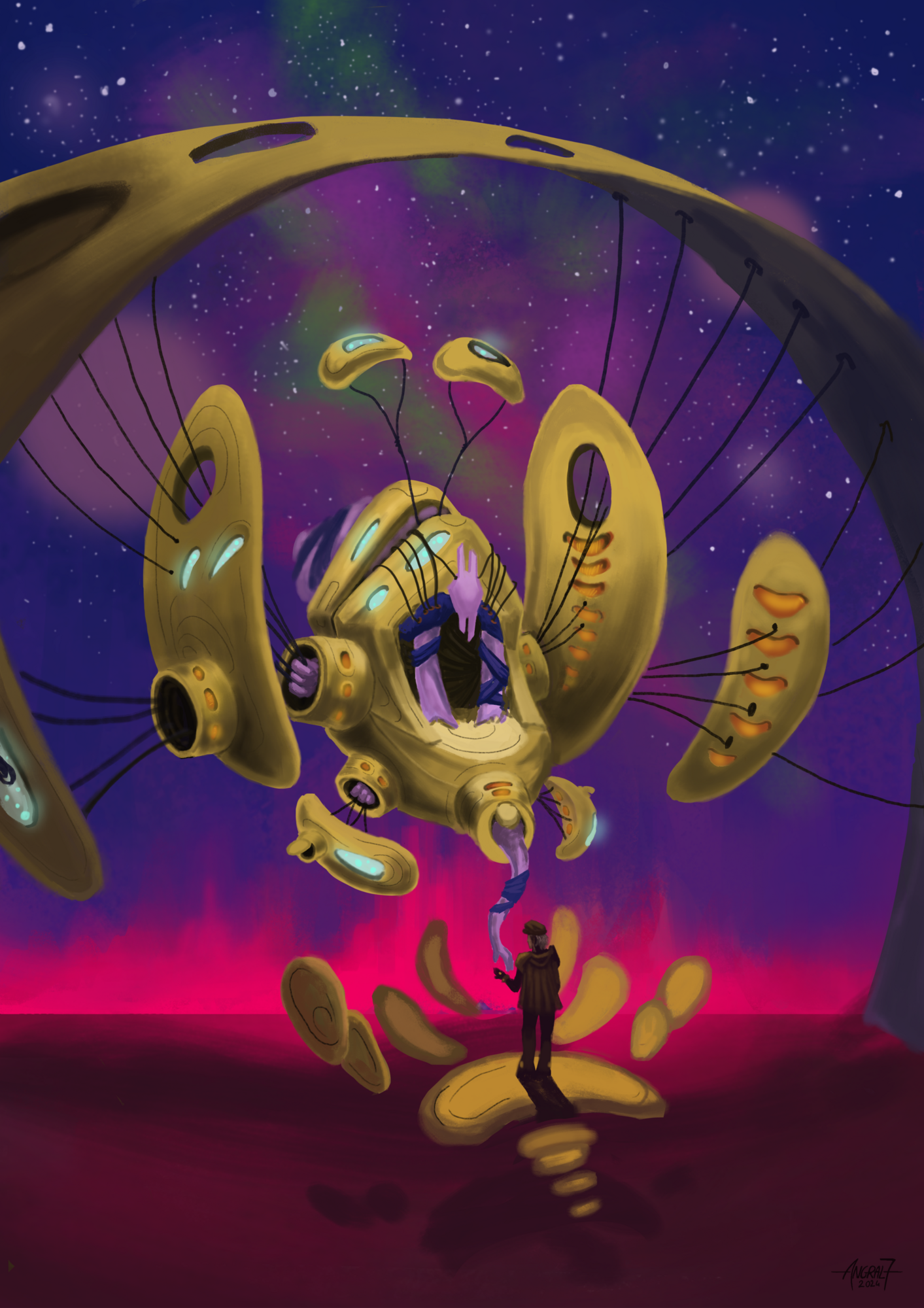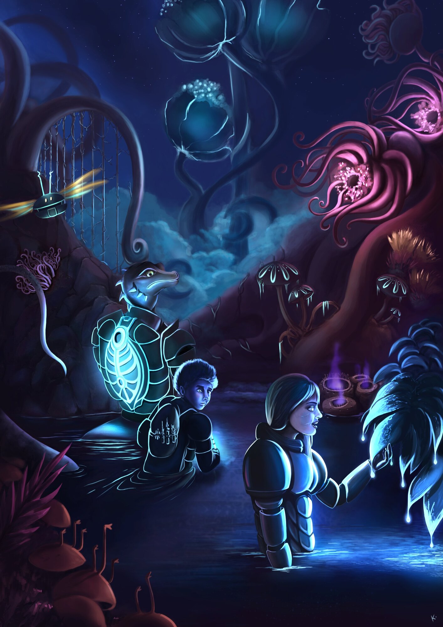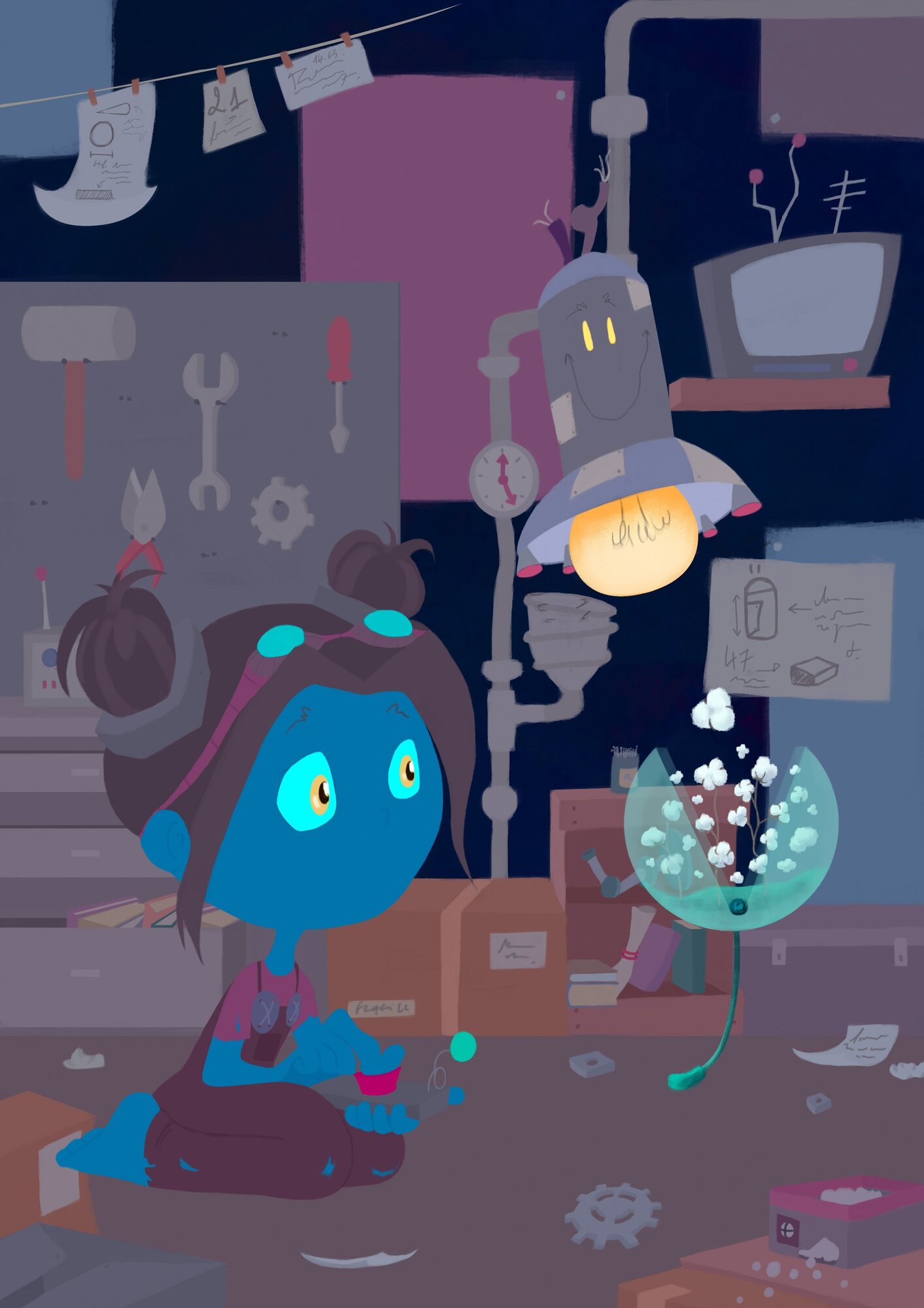 Une fois leur design défini, je me suis penchée sur le concept art de mon illustration. Le format m'a permit de montrer à quel point Tito était imposant, et c'était un vrai challenge car je fais surtout mes illustrations en format horizontal plus que vertical. J'ai cherché à travailler avec des couleurs et des paramètres que j'aimais dessiner, car mon style se base surtout sur les jeux de lumière que j'arrive à créer dans mes travaux. Mon choix s'est donc arrêté sur les lumières néon roses et bleues ! Voici la liste de mes étapes habituelles pour mon process d'illustration: Concept art (d'abord le croquis des personnages/background puis le tout en couleurs pour avoir une idée de l'ambiance que je recherche pour l'illustration finale) Phase greyscale: je peins entièrement les personnages en faisant déjà attention à mes placements d'ombres mais je reste quand même assez synthétique pour que ça ne pose pas de problème lors du rendering Coloring des personnages Création de l'ambiance des couleurs/lumières sur les personnages et début de conception du fond Rendering Derniers effets Pour cette illustration j'ai suivi le même processus, sauf pour Flix, que j'ai ajouté à la fin car je voulais m'assurer d'avoir un beau rendering pour Tito dans la zone où Flix devait être placé, pour que ça ne paraisse pas étrange lors du rendu final. Pour la situation, j'ai imaginé une scène dans une sorte d'entrepôt gigantesque et prétendument abandonné. Tito et Flix sont en mission, ils ont récupéré une relique qui allait servir à alimenter une machine gigantesque conçue en secret dans cet entrepôt à l'abri des regards, par une race alien ennemie souhaitant entrer en guerre contre les humains. C'est un cube d'énergie très ancien abritant une sphère aux pouvoirs d'alimentation plus grands encore. Tito est perché assez haut dans la zone car malgré son corps massif, il garde les traits de son espèce: une agilité et une rapidité à toutes épreuves. Pour rappeler son côté arrogant et "roi du monde", il prend la pose avec son précieux trophée dans sa main, alors que Flix garde son air très sérieux. Je l'ai représenté en plein vol, en train de patrouiller dans la zone en tentant de détecter des formes de vie environnantes grâce aux ondes émises par ses broches, qui le préviennent en cas de présence dans les 400 mètres à la ronde. Car une fois l'objectif de la mission en possession, il faut bien réussir à quitter la zone sans complications ! C'est pour ça que Flix a un rôle important dans toutes leurs entreprises. Non seulement il couvre les arrières de son ami à chaque fois, mais en plus il est très sage et l'aide à prendre de bonnes décisions. En mission diplomatique, c'est d'ailleurs lui qui parle, car Tito est incapable de faire preuve de politesse plus d'une minute, et son attitude lui a déjà valu quelques ennuis.3 points