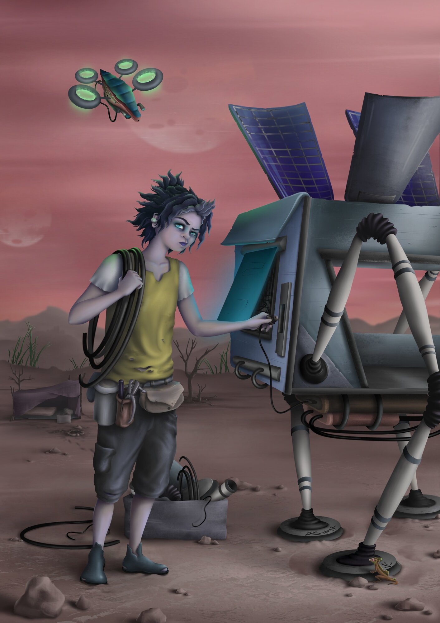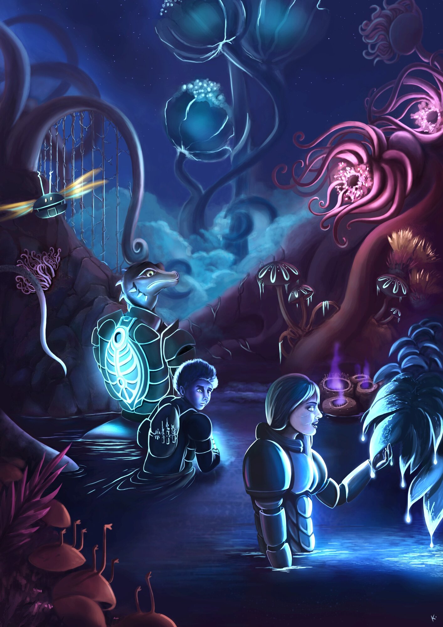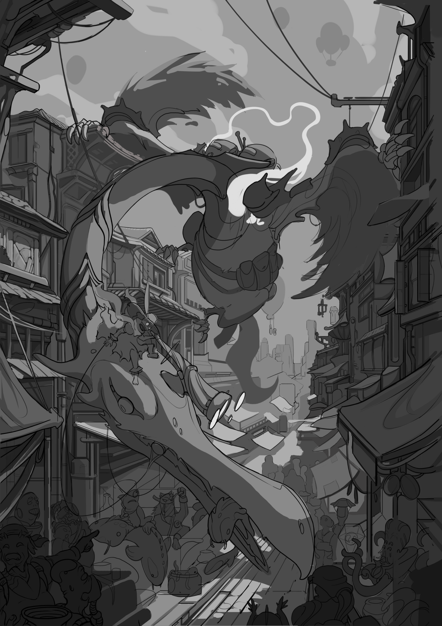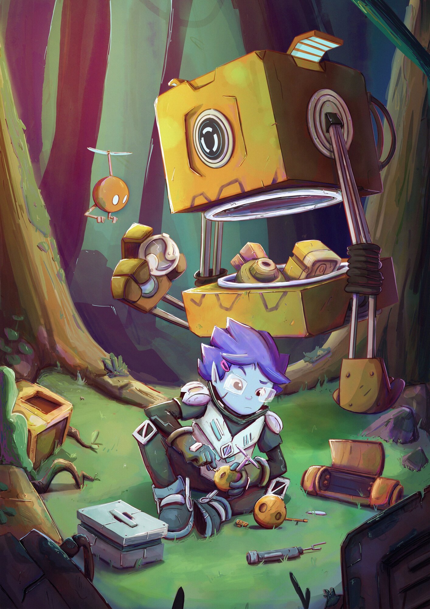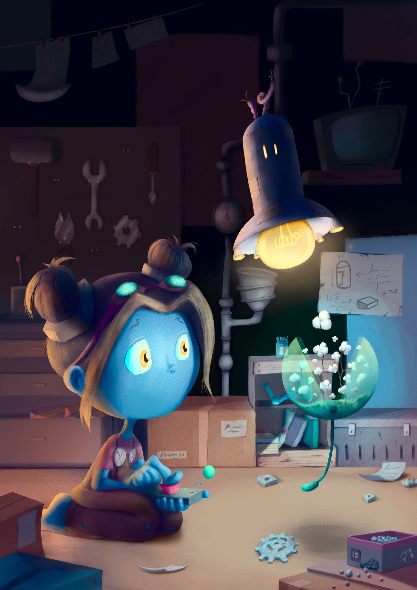 Une fois leur design défini, je me suis penchée sur le concept art de mon illustration. Le format m'a permit de montrer à quel point Tito était imposant, et c'était un vrai challenge car je fais surtout mes illustrations en format horizontal plus que vertical. J'ai cherché à travailler avec des couleurs et des paramètres que j'aimais dessiner, car mon style se base surtout sur les jeux de lumière que j'arrive à créer dans mes travaux. Mon choix s'est donc arrêté sur les lumières néon roses et bleues ! Voici la liste de mes étapes habituelles pour mon process d'illustration: Concept art (d'abord le croquis des personnages/background puis le tout en couleurs pour avoir une idée de l'ambiance que je recherche pour l'illustration finale) Phase greyscale: je peins entièrement les personnages en faisant déjà attention à mes placements d'ombres mais je reste quand même assez synthétique pour que ça ne pose pas de problème lors du rendering Coloring des personnages Création de l'ambiance des couleurs/lumières sur les personnages et début de conception du fond Rendering Derniers effets Pour cette illustration j'ai suivi le même processus, sauf pour Flix, que j'ai ajouté à la fin car je voulais m'assurer d'avoir un beau rendering pour Tito dans la zone où Flix devait être placé, pour que ça ne paraisse pas étrange lors du rendu final. Pour la situation, j'ai imaginé une scène dans une sorte d'entrepôt gigantesque et prétendument abandonné. Tito et Flix sont en mission, ils ont récupéré une relique qui allait servir à alimenter une machine gigantesque conçue en secret dans cet entrepôt à l'abri des regards, par une race alien ennemie souhaitant entrer en guerre contre les humains. C'est un cube d'énergie très ancien abritant une sphère aux pouvoirs d'alimentation plus grands encore. Tito est perché assez haut dans la zone car malgré son corps massif, il garde les traits de son espèce: une agilité et une rapidité à toutes épreuves. Pour rappeler son côté arrogant et "roi du monde", il prend la pose avec son précieux trophée dans sa main, alors que Flix garde son air très sérieux. Je l'ai représenté en plein vol, en train de patrouiller dans la zone en tentant de détecter des formes de vie environnantes grâce aux ondes émises par ses broches, qui le préviennent en cas de présence dans les 400 mètres à la ronde. Car une fois l'objectif de la mission en possession, il faut bien réussir à quitter la zone sans complications ! C'est pour ça que Flix a un rôle important dans toutes leurs entreprises. Non seulement il couvre les arrières de son ami à chaque fois, mais en plus il est très sage et l'aide à prendre de bonnes décisions. En mission diplomatique, c'est d'ailleurs lui qui parle, car Tito est incapable de faire preuve de politesse plus d'une minute, et son attitude lui a déjà valu quelques ennuis.3 points