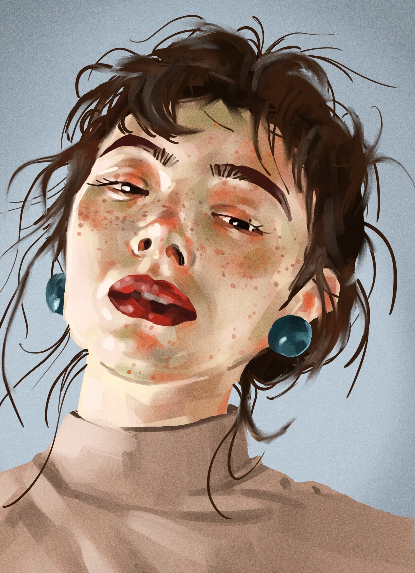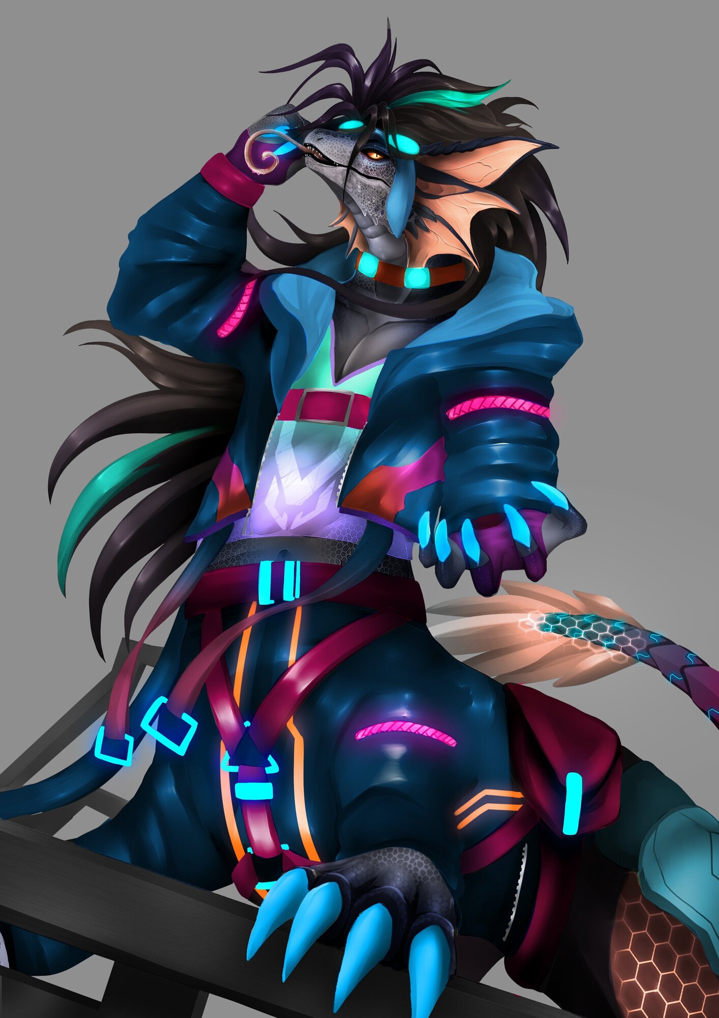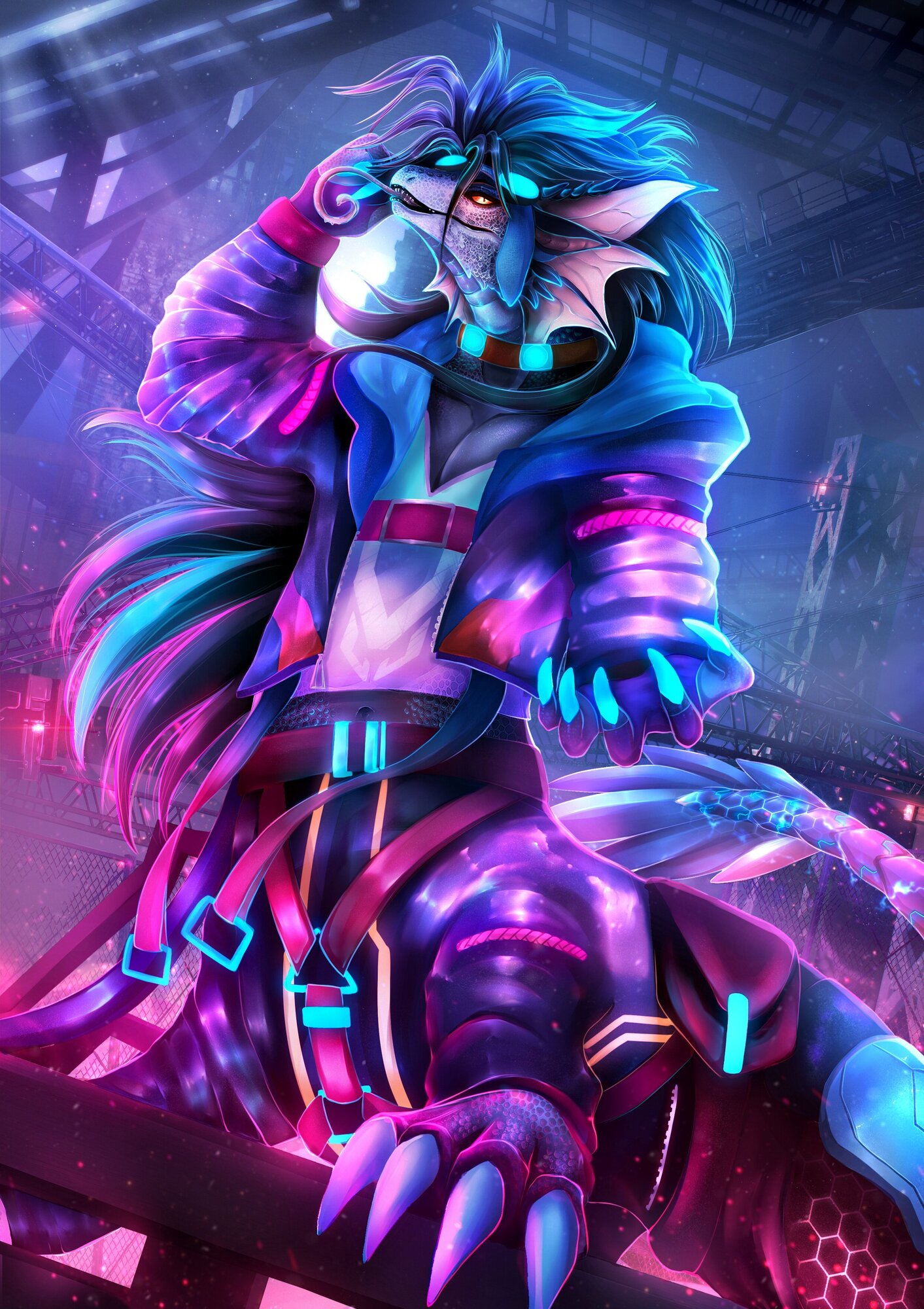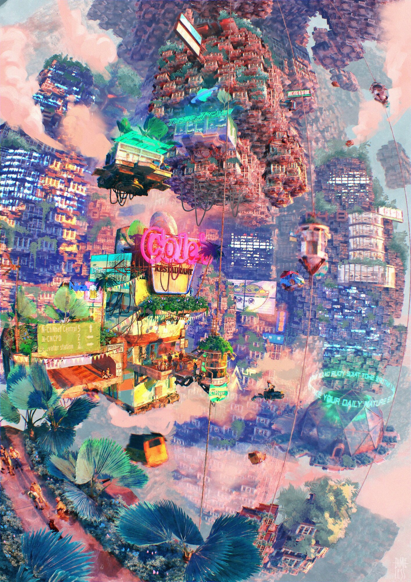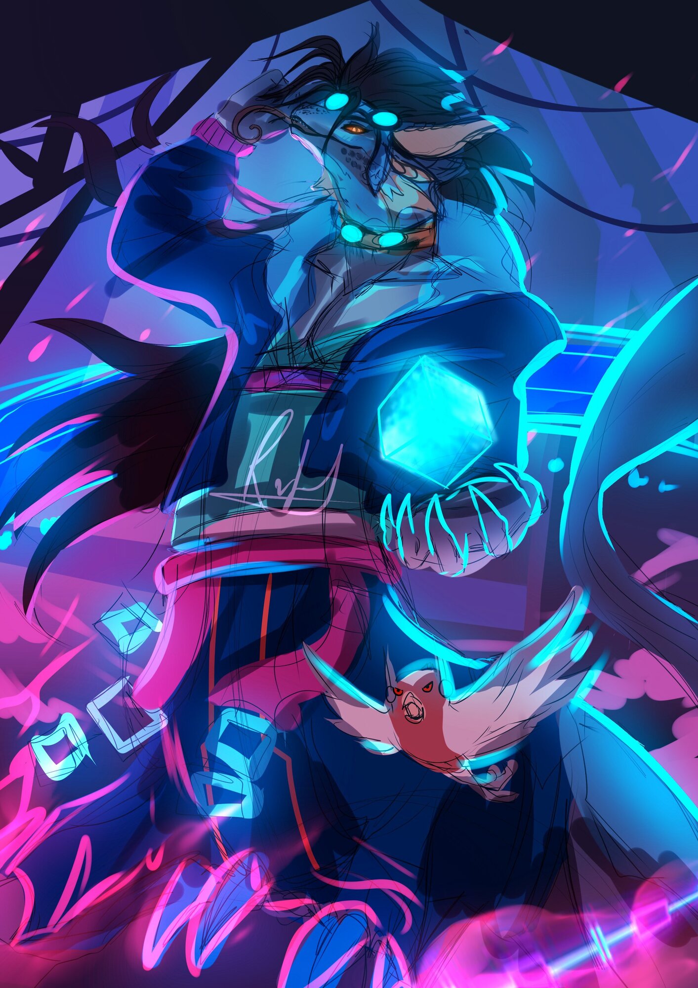 Une fois leur design défini, je me suis penchée sur le concept art de mon illustration. Le format m'a permit de montrer à quel point Tito était imposant, et c'était un vrai challenge car je fais surtout mes illustrations en format horizontal plus que vertical. J'ai cherché à travailler avec des couleurs et des paramètres que j'aimais dessiner, car mon style se base surtout sur les jeux de lumière que j'arrive à créer dans mes travaux. Mon choix s'est donc arrêté sur les lumières néon roses et bleues ! Voici la liste de mes étapes habituelles pour mon process d'illustration: Concept art (d'abord le croquis des personnages/background puis le tout en couleurs pour avoir une idée de l'ambiance que je recherche pour l'illustration finale) Phase greyscale: je peins entièrement les personnages en faisant déjà attention à mes placements d'ombres mais je reste quand même assez synthétique pour que ça ne pose pas de problème lors du rendering Coloring des personnages Création de l'ambiance des couleurs/lumières sur les personnages et début de conception du fond Rendering Derniers effets Pour cette illustration j'ai suivi le même processus, sauf pour Flix, que j'ai ajouté à la fin car je voulais m'assurer d'avoir un beau rendering pour Tito dans la zone où Flix devait être placé, pour que ça ne paraisse pas étrange lors du rendu final. Pour la situation, j'ai imaginé une scène dans une sorte d'entrepôt gigantesque et prétendument abandonné. Tito et Flix sont en mission, ils ont récupéré une relique qui allait servir à alimenter une machine gigantesque conçue en secret dans cet entrepôt à l'abri des regards, par une race alien ennemie souhaitant entrer en guerre contre les humains. C'est un cube d'énergie très ancien abritant une sphère aux pouvoirs d'alimentation plus grands encore. Tito est perché assez haut dans la zone car malgré son corps massif, il garde les traits de son espèce: une agilité et une rapidité à toutes épreuves. Pour rappeler son côté arrogant et "roi du monde", il prend la pose avec son précieux trophée dans sa main, alors que Flix garde son air très sérieux. Je l'ai représenté en plein vol, en train de patrouiller dans la zone en tentant de détecter des formes de vie environnantes grâce aux ondes émises par ses broches, qui le préviennent en cas de présence dans les 400 mètres à la ronde. Car une fois l'objectif de la mission en possession, il faut bien réussir à quitter la zone sans complications ! C'est pour ça que Flix a un rôle important dans toutes leurs entreprises. Non seulement il couvre les arrières de son ami à chaque fois, mais en plus il est très sage et l'aide à prendre de bonnes décisions. En mission diplomatique, c'est d'ailleurs lui qui parle, car Tito est incapable de faire preuve de politesse plus d'une minute, et son attitude lui a déjà valu quelques ennuis.3 points