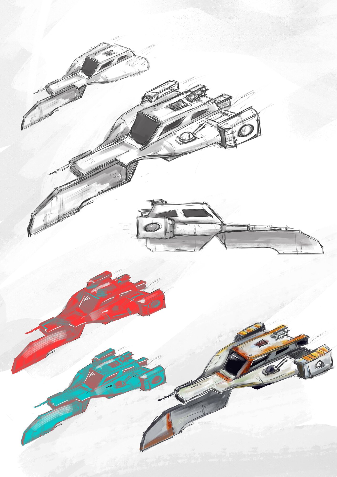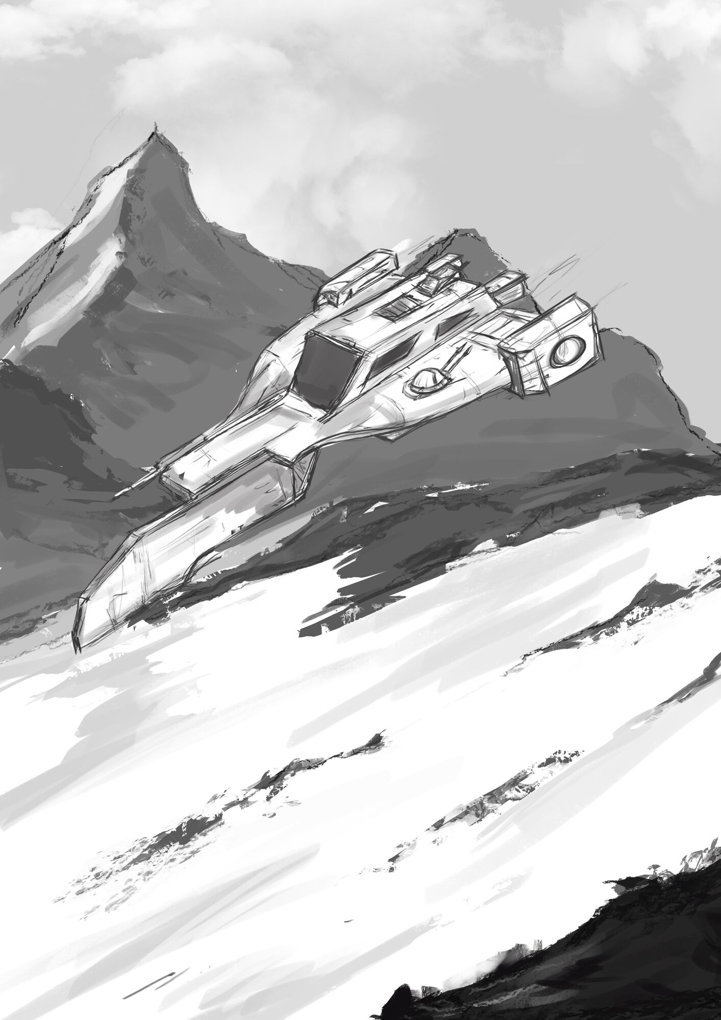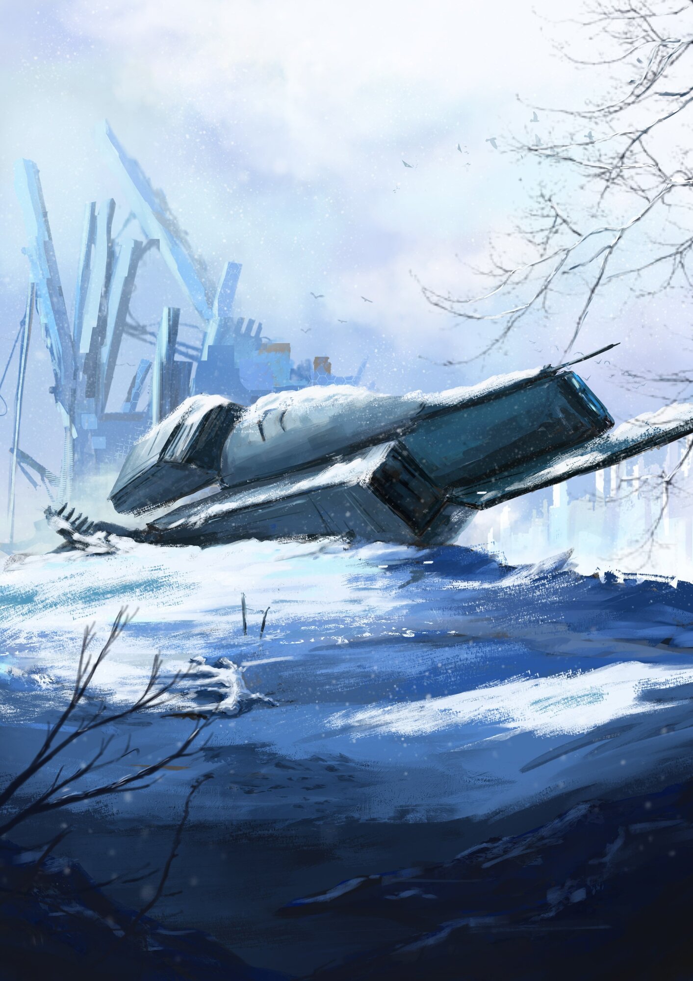 Bonjour, je poste ici tardivement, c'est la première fois que je participe au challenge de digital school painting, je n'avais pas compris qu'il fallait poster au fur et à mesure. Comme je viens de le dire c'est la première fois que je participe officiellement, je suis depuis un moment les différents challenge et autres sorties youtube mais je ne m'étais jamais lancé. Etant un grand fan de Star Wars, Halo et de space opéra je ne pouvais pas ne pas participer cette fois. Je vous présente donc mon travail et mes différentes étapes de recherches. Dans un premier temps je voulais me diriger vers les rues coupes gorge, malheureusement je ne trouvais pas l'inspiration, rien ne ressortais de mes premiers croquis, j'ai donc dévié vers les vaisseaux, et en lisant le brief du vaisseau éclaireur j'ai tout de suite accroché. J'ai réfléchi dans un premier temps au vaisseau en lui même avant de me lancer dans une composition. Pour moi un vaisseau éclaireur doit être à la fois furtif et rapide mais son design doit être aussi être dynamique ou aérodynamique. J'ai donc fait des vaisseaux un peu au hasard, à partir de lettre d'alphabet à la manière de star wars ou de forme aléatoire puis je les travaillais au fur et à mesure pour donner des formes de vaisseaux qui me convenais. L'un d'eux me plaisait tout particulièrement et à mes proche également alors j'ai opté pour celui ci. Je l'avais dessiné comme un vaisseau classique mais une lame d'acier à l'avant qui lui permet de voler au ras de l'eau et sur la neige. Je lui ai rajouté des réacteurs sur les côtés pour les longs trajet et la tourelle comme dis dans le brief. Ensuite est venu le temps de faire des compositions pour l'illustration finale. Pour moi ce qui est important dans une composition c'est le fait d'avoir une lumière qui fonctionne et qu'on distingue bien les différents plan grâce à la perspective atmosphérique. Je fais très souvent les composition directement en masse de noir afin de tout de suite avoir la lumière, je ne savais pas trop sur quoi partir à part que je voulais que ça soit un crash, j'ai donc commencé par une composition en montagne avec le vaisseau qui pique du nez mais cela ne m'a pas convaincu. Je suis donc parti sur une composition désertique et rocheuse avec le vaisseau au centre déjà crashé. Pour être sûr j'en ai fait une version sur une dune de sable mais là je voulais le vaisseau plus au centre de l'attention et donc je lui ai donné plus de place dans la composition et je l'ai bien centré. En faisant mes recherches de couleurs je ne trouvais pas de couleur qui me plaisait et je me suis dit pourquoi pas partir sur de la neige, comme j'aime faire de la roches et des montagnes alors pourquoi pas faire ce que je sais faire. Alors ma dune c'est changé en montagne enneigé. J'ai fait le choix de recouvrir le vaisseau et le corps du héro avec la neige afin de les encrer un peu plus dans la composition, les branches rajouté aux premier plan sont là pour diriger le regard dans un premier temps mais aussi pour habiller et enfermer un peu la composition. Voilà Je suis très content d'avoir participer à ce challenge. Merci et bravo à tous 🙂2 points