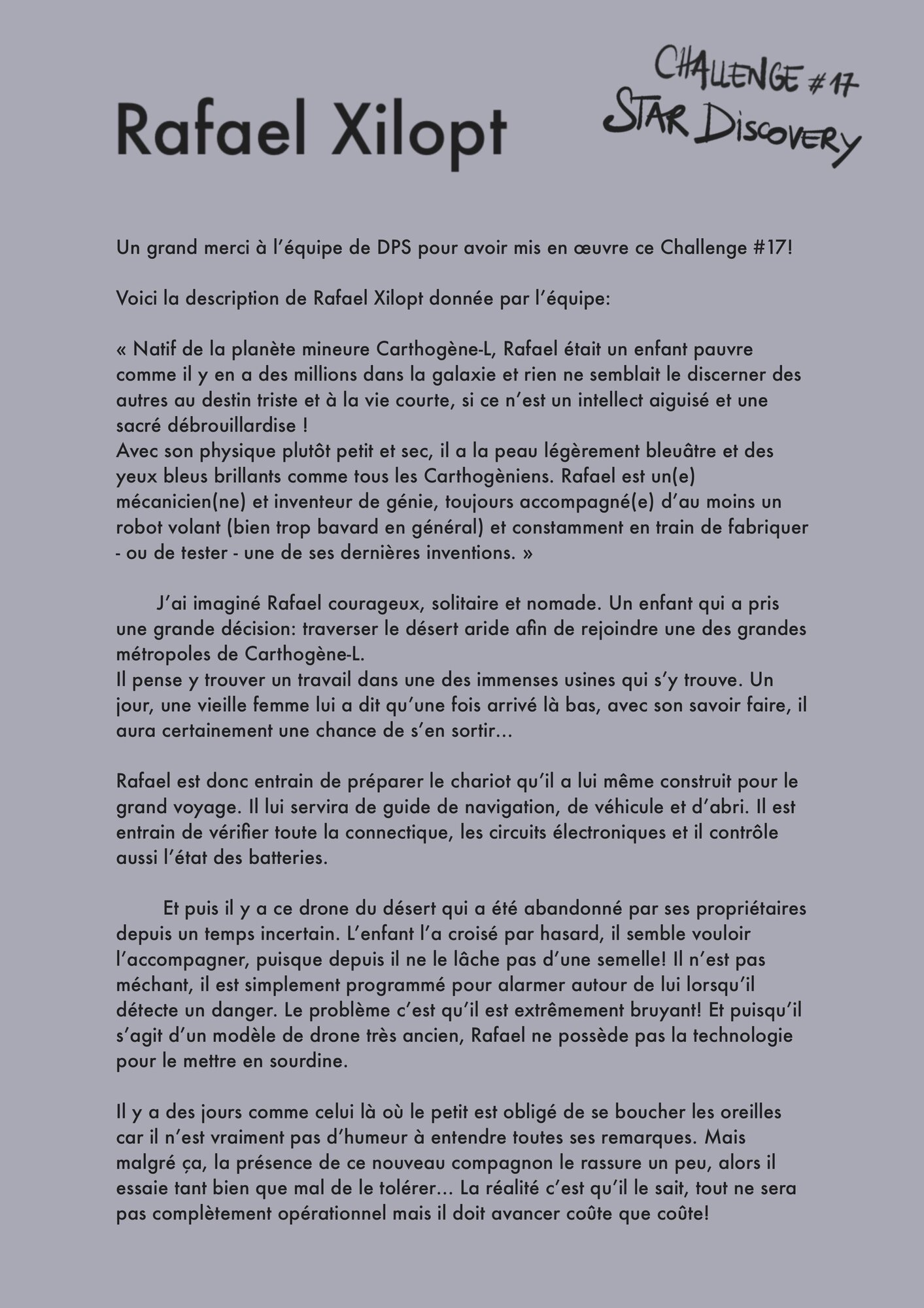 Hello hello, Bon j'ai pas vu passer le challenge au début et après j'ai absolument pas eu le temps. Je me lance donc que maintenant, c'est l'occasion de se bouger un peu pour essayer de sortir quelque chose de sympa quand même^^. Il y avait plusieurs trucs chouette mais j'ai décidé de partir sur Rafael Xilopt dont j'aime bien le descriptif. J'ai dans l'idée de partir sur de la SF type médiéval steampunk. Je vois bien le gamin fabriquer des oiseaux mécaniques, sous la neige, protégé par un parapluie tenu par un gros robot (ça me fait marrer d'imaginer qu’il a construit cette machine juste pour porter son parapluie). J'ai commencé à croquer un peu mais je vais pas m'attarder à faire pleins de planches de recherches étant donné le temps restant je vais attaquer l'illu au plus vite.2 points