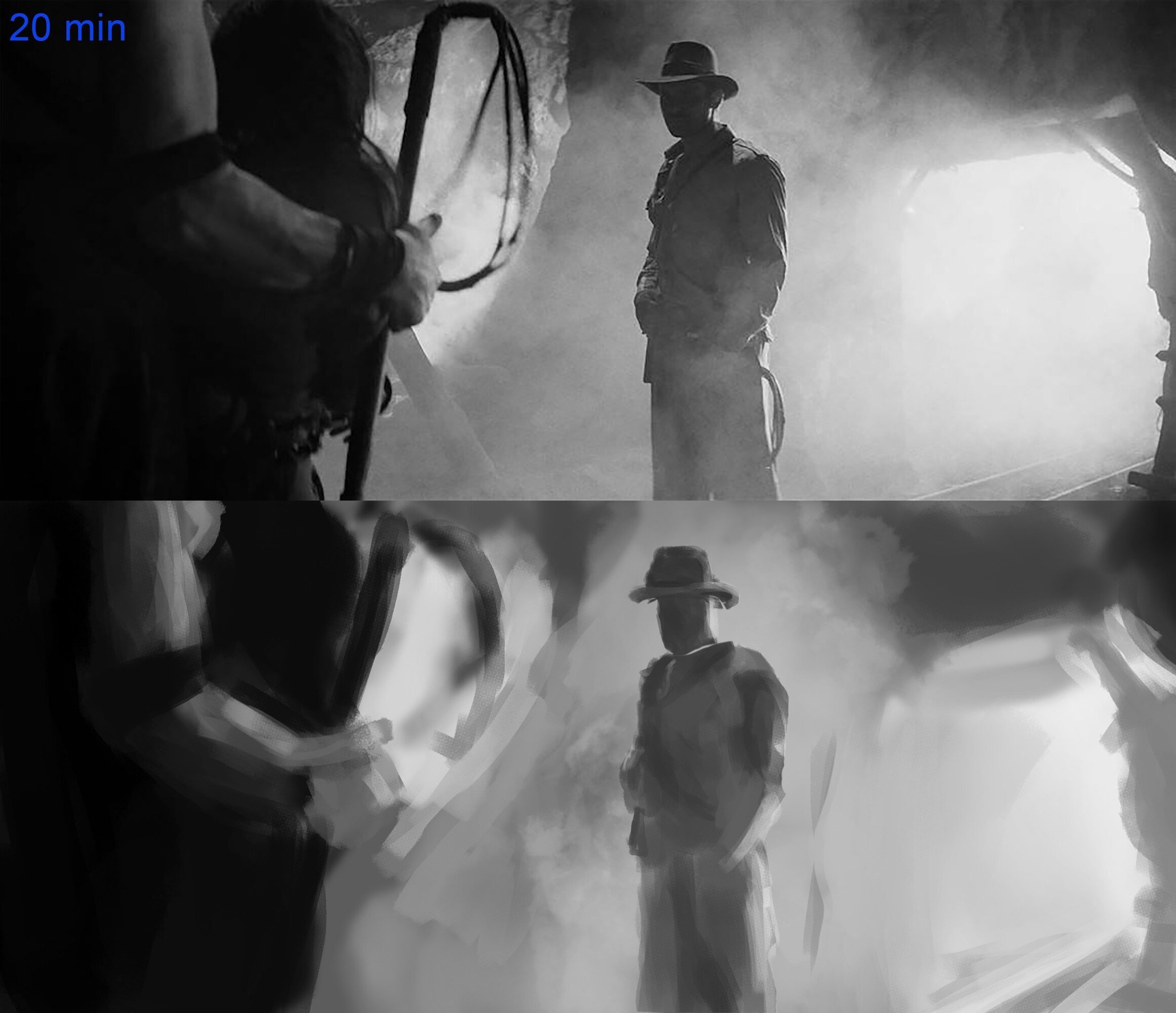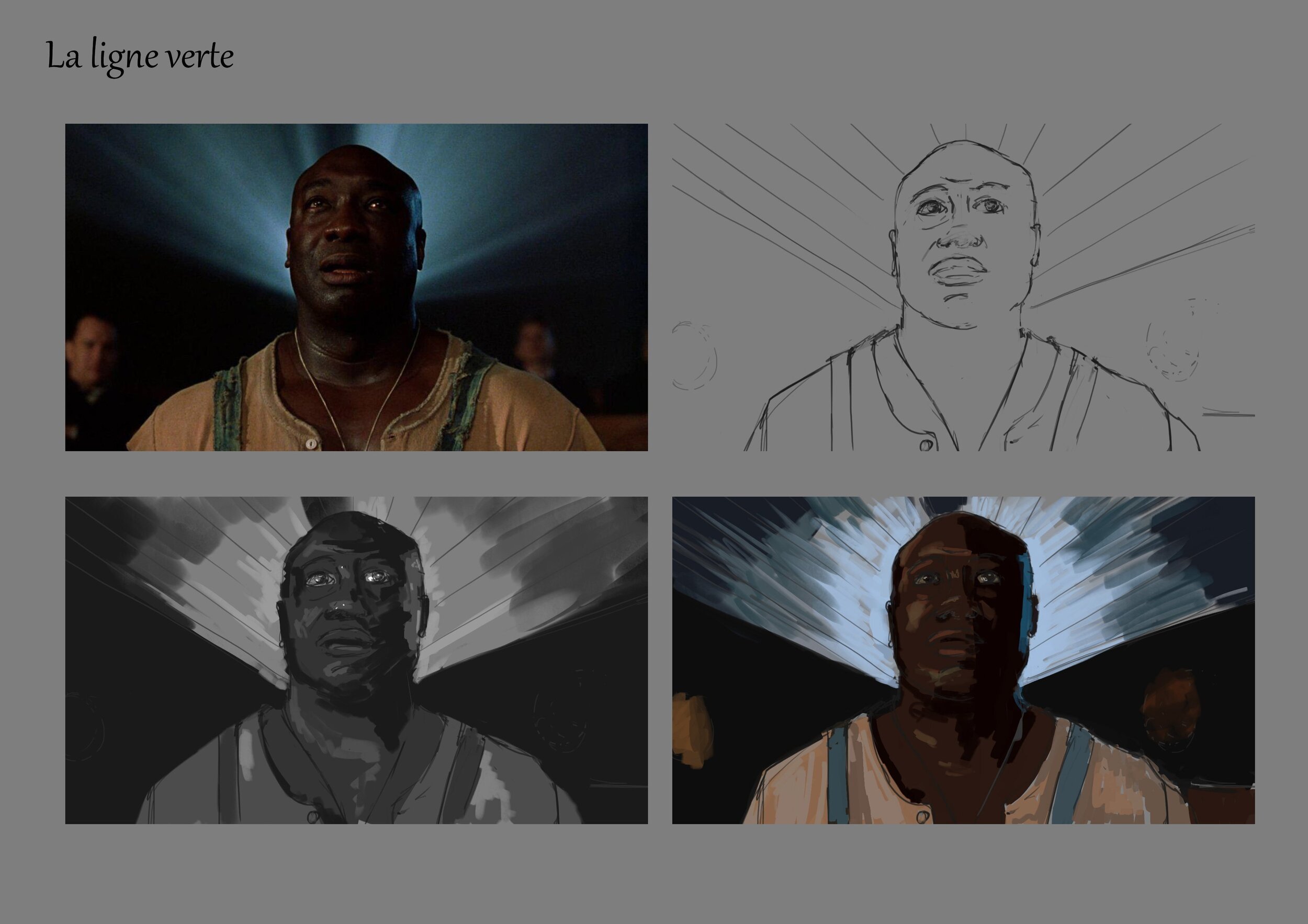 Mon étude, beaucoup de mal, l'image est sombre, la couleur de peau du perso, dans cette obscurité est super difficile à travailler. Voici mon résultat après 30 min et 1h. J'aurai pu stopper à 30 min je pense. Je me suis filmé en travaillant, je joins au message une vidéo en accéléré de mon process. Tout commentaires me permettant de progresser est le bienvenu en espérant que c'est pas gênant de poster une vidéo sur le forum, si pas, je l'enlèverai. -5 points