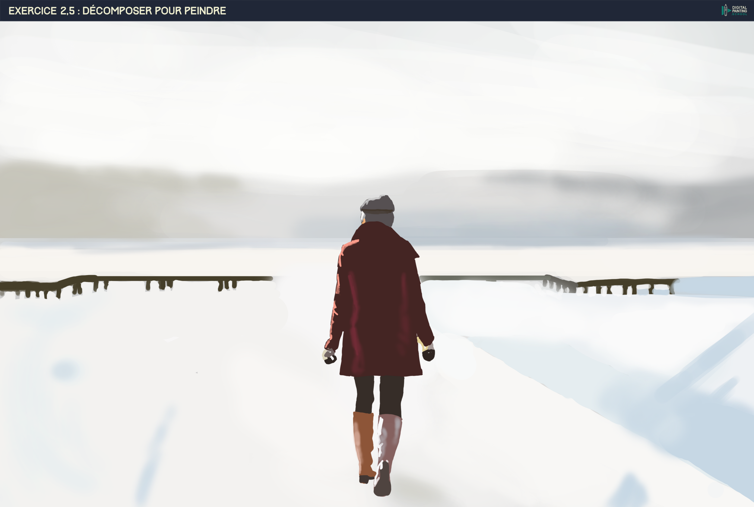 Exo 2.5, j'ai pas fait un super travail, c'est pas encore ça l'identification des grandes zones puis détails... J'ai essayé plusieurs techniques, on voit bien que je n'ai pas traité le paysage et le personnage de la même manière, histoire de me familiariser avec les principaux brushes (4-5 très basiques, pas de custom, je focus sur les basiques). Je referais ce painting plus tard en ayant progressé, pour voir comment je m'en sortirai sans utiliser le croquis d'aide !1 point