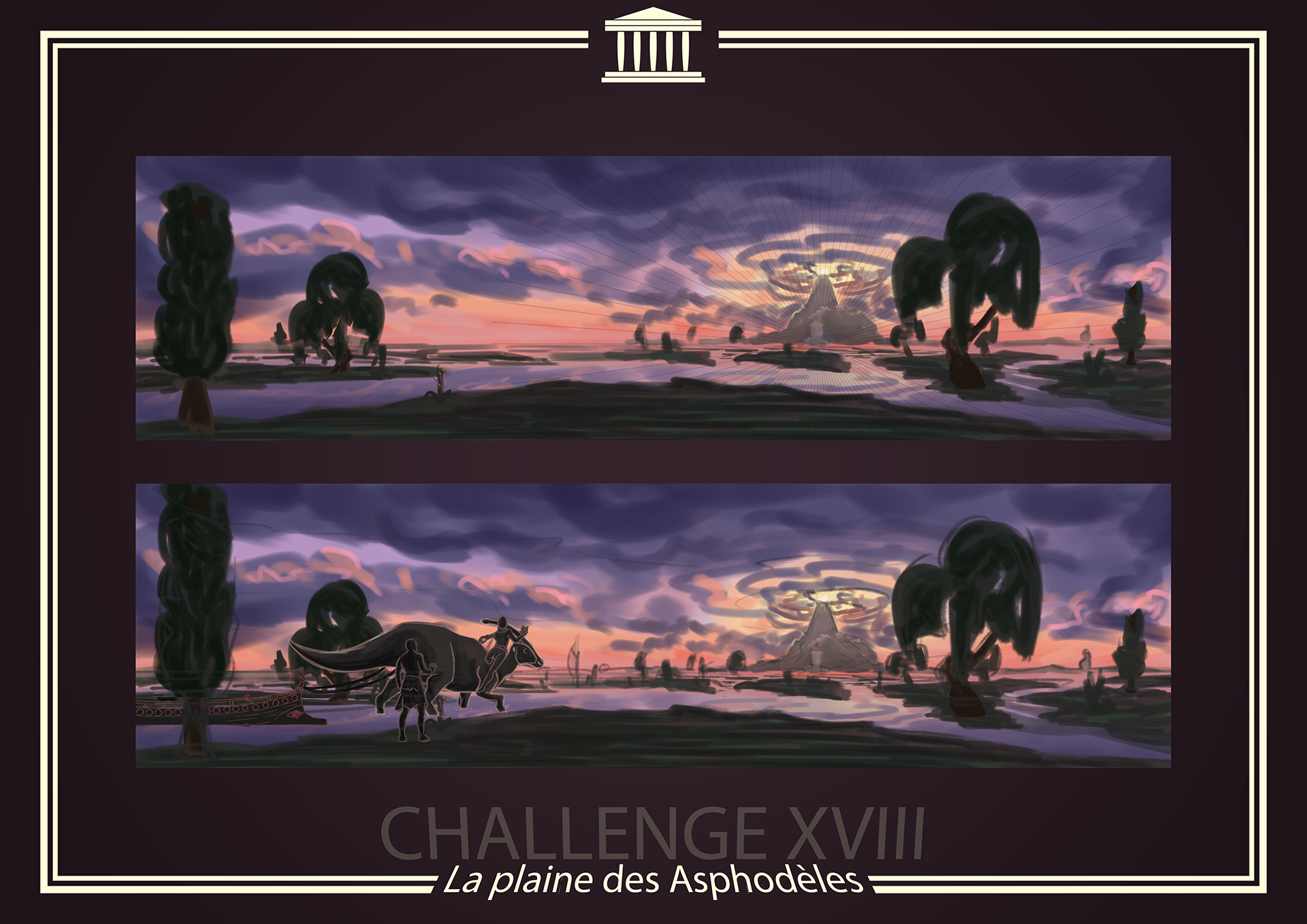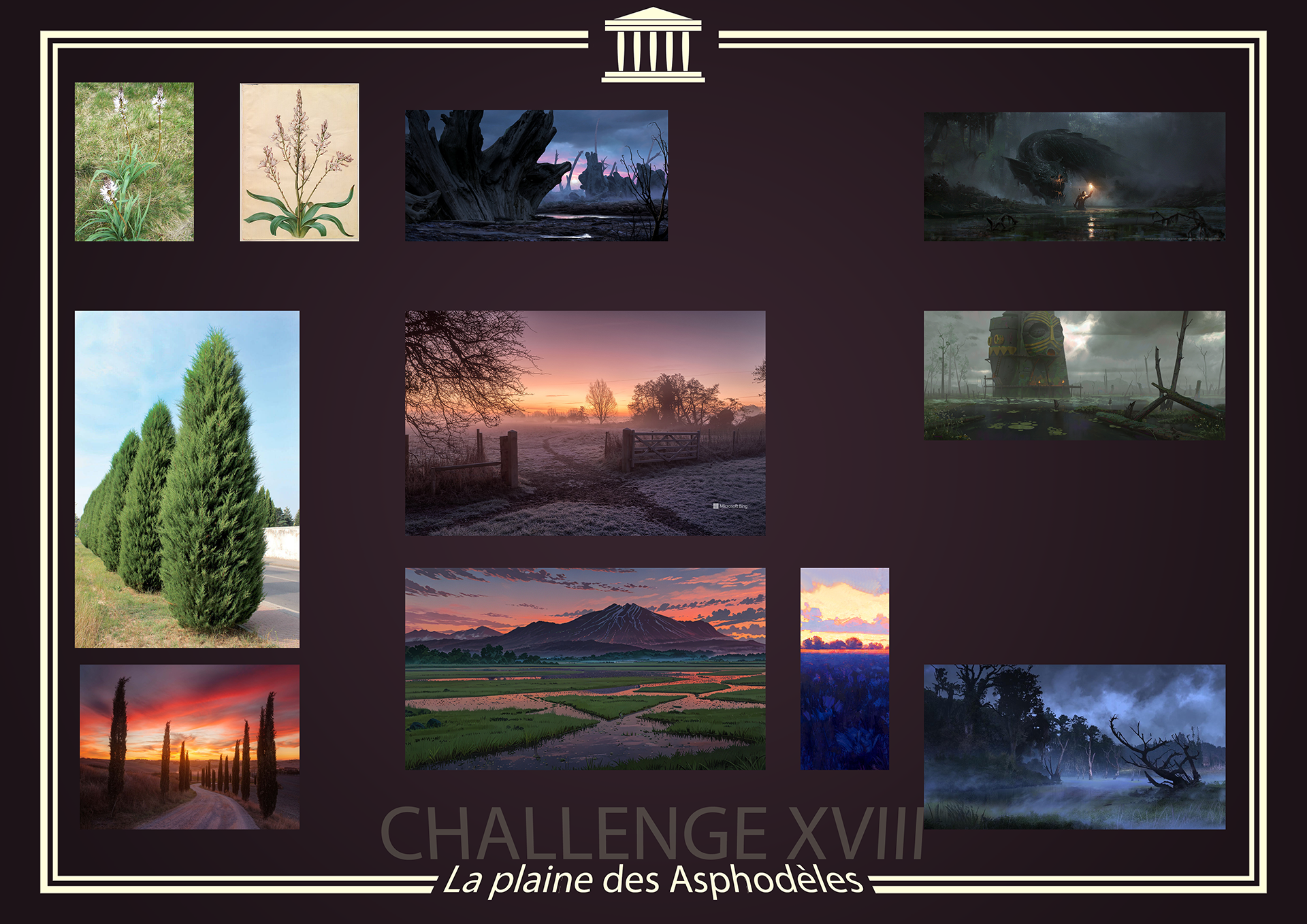 Bonjour à tous, J'ai le plaisir de publier ici mon Work in Progress ou, plus francophone mon travail en cours. Le thème du concours est génial car il entre en résonance avec un vieux projet que j'ai en tête depuis longtemps, je compte bien en profiter pour faire d'une pierre deux coup. Une illustration pour le concours, et celle dont e rêve depuis longtemps mais je vais avoir besoin de votre aide car tout seul et sans artiste dans mon entourage... Compliqué d'avoir l’œil critique pour soi-même ! En une phrase, je compte réaliser une peinture hommage pour cette musique : https://youtu.be/9mKR7JWT_Vg Je comprendrai si vous n'aimez pas, mais il faut rendre à César ce qui lui appartient et reconnaître le superbe de cette sonorité. Bref, le sujet est simple, un héros légendaire byzantin, véritable Hercule médiéval rencontre Charon et annonce venir pour se reposer car il reviendra sauver sa contrée. CHARON ! Je souhaite donc mettre en scène cette confrontation avec la réalisation d'un environnement. La plaine des Asphodèles Qu'est-ce que c'est ? Et bien c'est une partie des enfers de la Mythologie, celle situé entre le Tartare (enfer que l'on connait) et les Champs-Élysées (paradis classique), une sorte de limbe où les âmes errent avant d'être récupéré par Charon pour traverser le marais (j'ai décidé que c'était un marais) du Styx. Je vous présente donc mes références pour illustrer mon environnement, je souhaite avoir cette teinte atmosphérique crépusculaire et l'ambiance boueuse et marécageuse, avec à l'horizon une haute montagne qui semble conduire aux Champs-Élysées. Pour les plantes on retrouve donc les asphodèles, mais aussi des cyprès et des saules pleureurs. Ci-dessous je vous présente les premiers résultats de mes travaux. Bien qu'il s'agisse d'un environnement, je compte glisser les personnages pour rendre la scène plus vivante, la "plaine" doit raconter une histoire par ses propres moyens mais elle ne pourra pas le faire toute seule. Enfin je crois... Pour l'explication, Charon est à cheval sur un Charonosaurus (oui ça existe) le lézard de Charon ! Pour tirer la fameuse barque qu'on devine derrière mais comme c'est pas le sujet on s'en fiche un peu. Actuellement, j'ai besoin d'aide pour les couleurs, est-ce que ce premier jet est bien ou mauvais ? Dans mes références, les cieux sont souvent très saturés et le sol marécageux plus terne, j'aime cette idée mais à mettre en œuvre (surtout avec les reflets de l'eau) c'est pas aussi facile. Mais du coup ça passe ? Merci d'avance pour vos retours !2 points