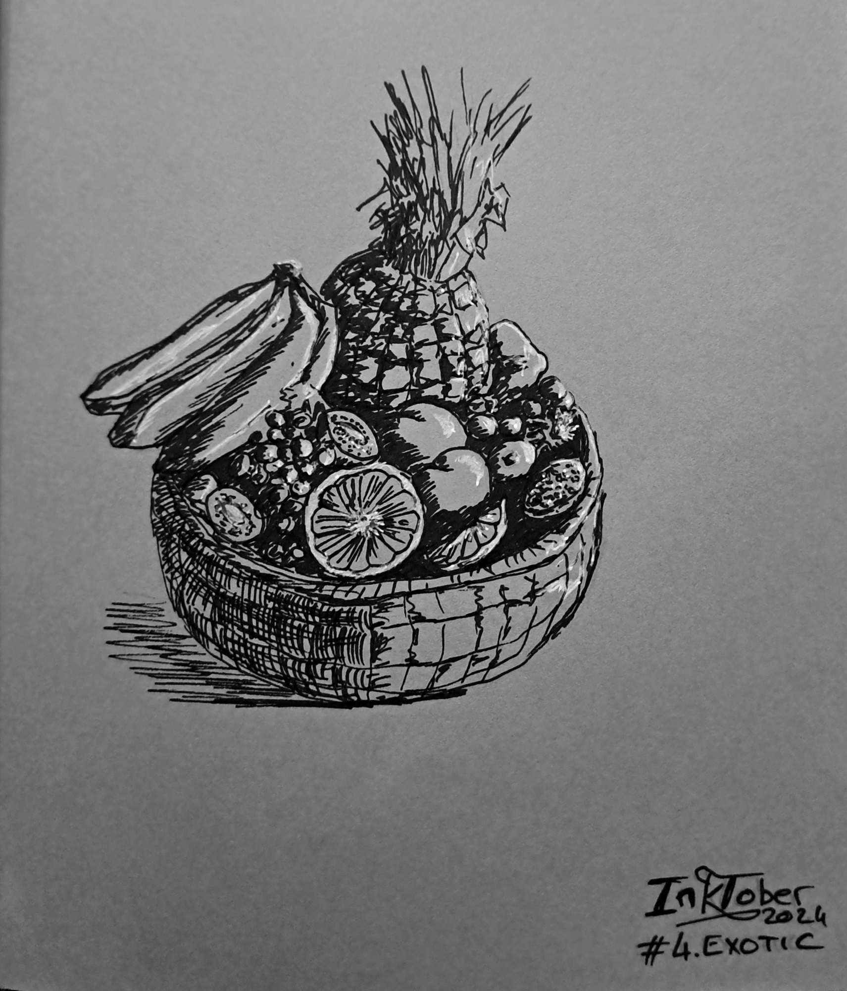 @Archange.St.Michel C'est sur il fait tellement chaud dans les pays exotiques qu'on a moins d'habits ! @Gloubibarjo Beau chaton que voilà !! @Deny Toujours aussi excellent ! L'ambiance est top ! On devine tout ce qui se dit devant ce nouveau fruit ! @ApostroKe On n'a pas lu les mêmes Tintin ! Toujours aussi horrifiant !! @ArnoUn peu de verdure et une vue plus large sur ton illus, vivement la suite ! De mon côté quand j'ai tapé exotic je suis tombé sur un chat, l'exotic shorthair or j'imaginais une corbeille de fruits exotiques donc j'ai mêler les deux et ça donne ceci25 points