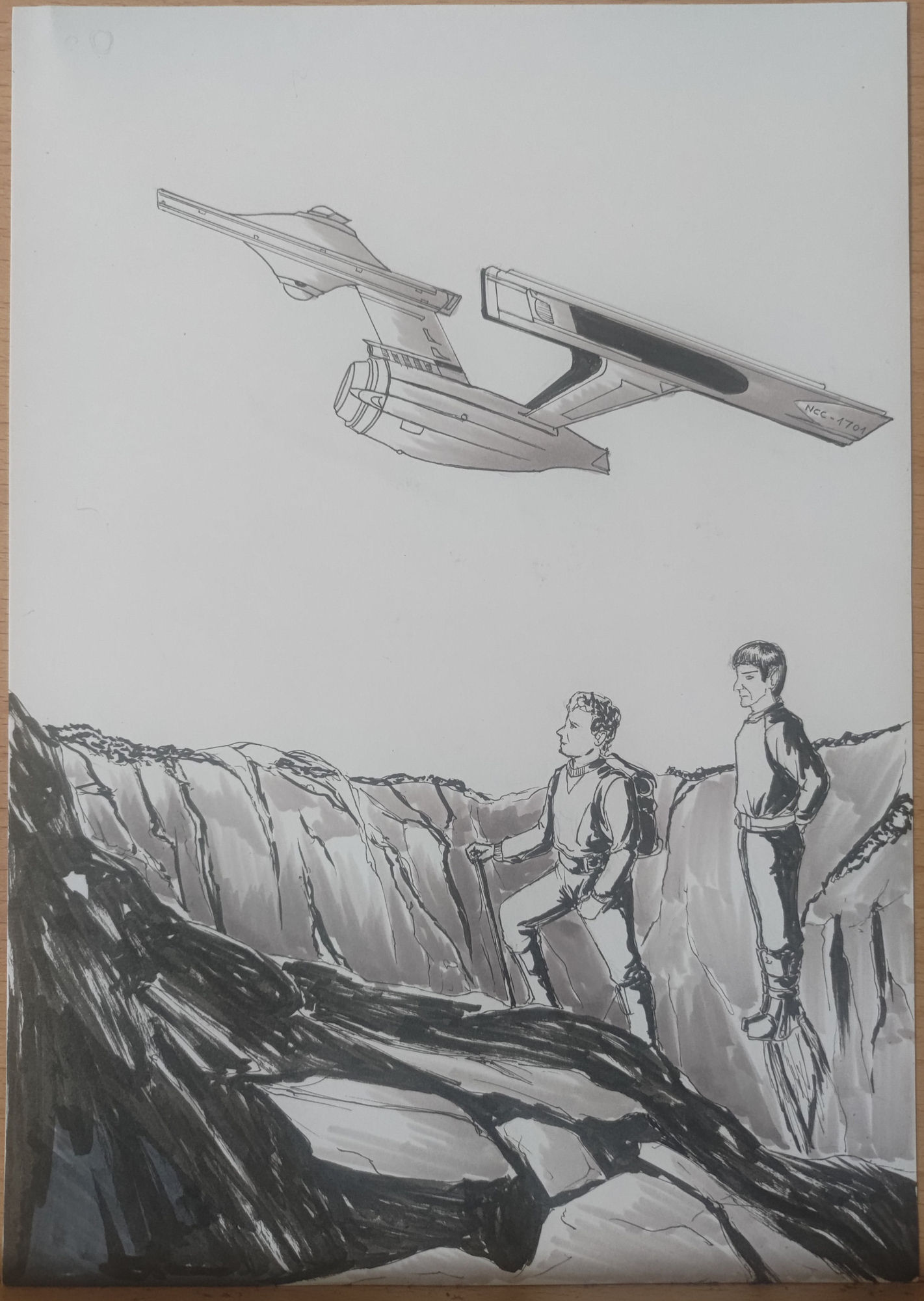 Je vois que le mot du jour rappelle quelques souvenirs de fiction à plusieurs participants comme @Katyusha ou @Haeresis, faut dire que "Trek" est une grosse perche, du coup voici ma participation du jour en mode croquis carnet de voyage : A force de repousser les frontières de l'inconnu, Kirk et son équipage ont échoués au delà des capacités de communication avec Starfleet, du coup ils sont condamnés sans aucun espoir de retour à vivre seuls sur une planète inconnue, l'Enterprise gisant en morceaux au loin, souvenir d'une autre époque qui va rejoindre d'autres reliques sur ce monde de désespoir.6 points