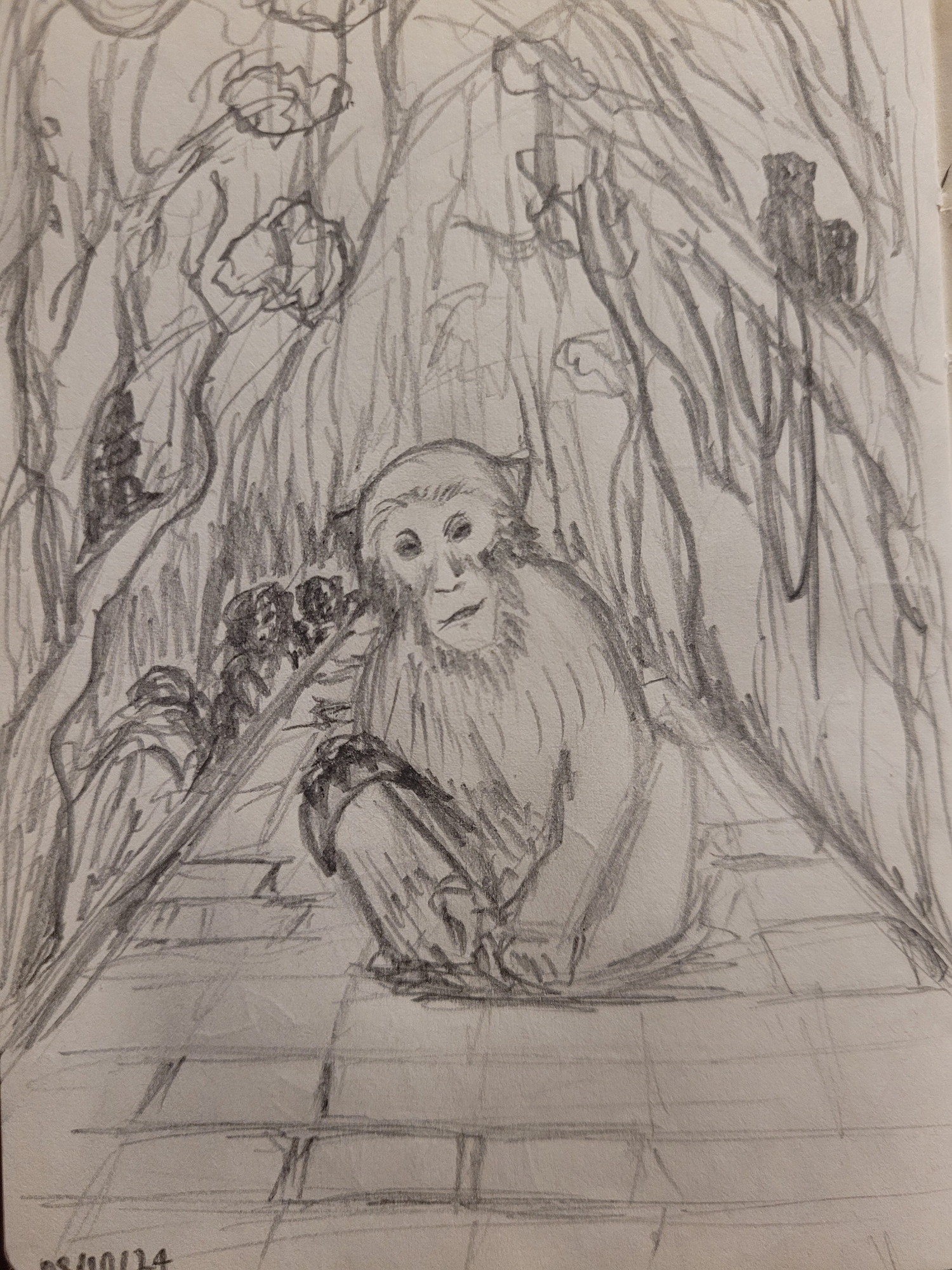 Bonsoir tout le monde ! Je me suis beaucoup cassé la tête sur le mot d'aujourd'hui, j'avais pas envie de redessiner une randonnée comme il y a 2 jours 😅 Finalement, j'ai choisi de représenter un souvenir de randonnée en Chine, où notre groupe s'était retrouvé bloqué par un singe installé au milieu du chemin. On était 15 adultes, et personne n'osait le contourner parce que le singe avait l'air menaçant... Puis, quelqu'un a fini par trouver une banane dans son sac, et ce n'est qu'à ce prix que le singe a bien voulu nous laisser passer 😂 @GUItrès joli ça me rappelle d'autres promenades sur la muraille de Chine, justement ! @Draconia super créatif, le design de ton costume ! Et les 3 chats sont très réussis aussi 😸 @Arno oooh ca continue sur le côté ! Très chouette, le rendu de l'escalier ^^7 points