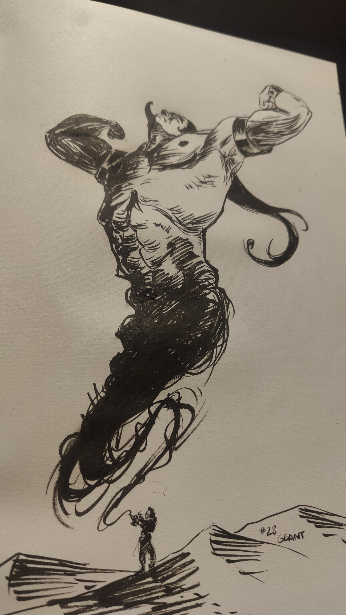Pour ce jour des géants, en voici trois (et oui mais pourquoi j'arrive jamais à faire simple ???), chacun sans son domaine, je vous laisses les retrouver ! Moi c'est pas sur mais au bout de la corde, du coup pas de produit fini mais un WIP, histoire de ne pas pouvoir me défiler demain ! @Katyusha: lol @Haeresis: top, tes efforts ont bien porté leur fruits, bravo @Diamones: 🙂 et Godzilla ne serait-il pas en train de penser "mince, j'ai marcher sur kek'chose en venant, c'était pas un village ? Que vais-je bien pouvoir dire à ce p'tit gars ?" @Arno: ouf, ç'aurait pu être un moustique géant, l'horreur, même si on est bien servit ici en France question suceurs de sang @stefou: tjs aussi superbe, bravo, ton style est génial, trop drôle le gros éléphant dans son p'tit "navion" @ApostroKe: no comment 😛 @Gloubibarjo: j'aurai aussi pu mettre ma p'tite panthère vu qu'elle est dans le même style ! Trop drôle son expression de contentement en si peu de traits @poltu: quand ils sont petits ce sont déjà des vicelards alors un géant...2 points