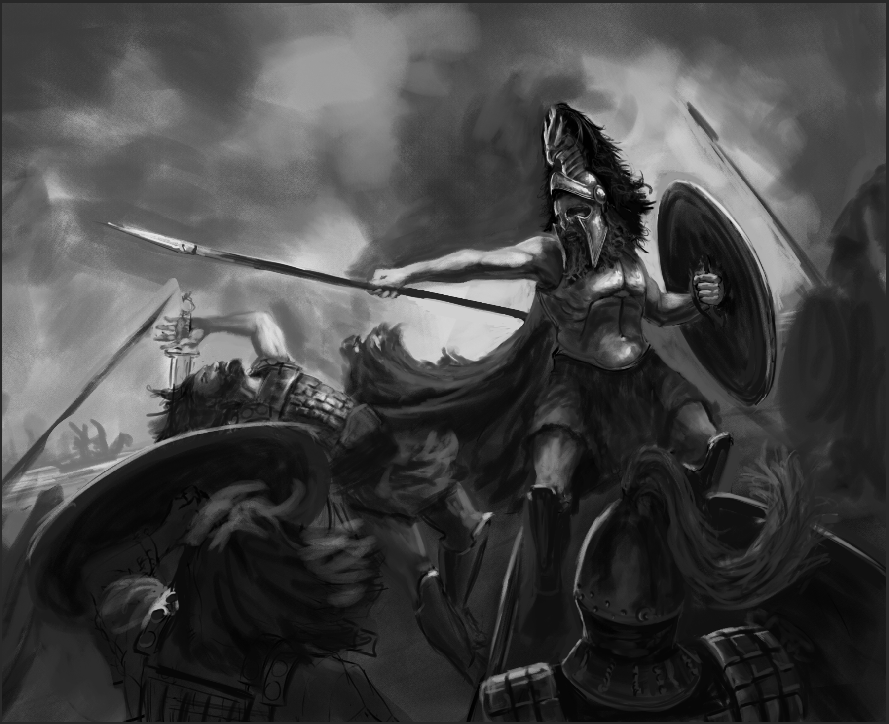 Salut voici un aperçu de l'évoulution de mon image Pour ce challenge, j'ai voulu me lancer un défi en imaginant une scêne où Hercule affronterait ses douze travaux en une seule image. toute premiere recherche rapide seconde avec couleur l'image etait beaucoup trop serrée pas agréable à la lecture et illisible on se prend en photo sous cet angle, ça sera beaucoup mieux que d'imaginer cette position complexe un peu plus aéré beaucoup mieux, il faut maintenant s'occuper de la perspective atmosphérique pour mettre de la distance entre les différents protagoniste de l'image et de pleins de petites choses Le final3 points