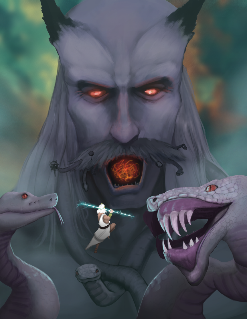 En parallèle du développement de ma première trame en valeurs de gris, je fais pas mal de tests de colorisation pour voir ce qui pourrait m'attirer en terme de couleurs pour ma narration, tout en respectant les valeurs locales choisies pour l'arbre et l'Hydre : Je choisi finalement de privilégier une palette que je maîtrise mieux et qui, je le pense, garde davantage l'aspect "scène oklm" que je voulais qu'une palette plus agressive ou trop sombre. Je reste sur une palette analogue pour l'ensemble du fond, qui couvre du vert d'eau froid dans les ombres à l'orangé très chaud dans les zones de transluminescence du feuillage avec l'éclairage d'un après-midi d'entre-saison, capable de générer l'évaporation de l'eau propice à la brume du marais. Les couleurs originelles de l'Hydre seront également moins affectées. Le résumé de la façon dont j'ai travaillé ici : - Travail en 2D uniquement, pas de base 3D, - première étape en valeurs de gris pour la structure de l'image et le détail du fond, - disposition des personnages et travail sur les valeurs, sans couleurs, - seconde partie du travail à partir d'une colorisation indirecte, travail sur les couleurs locales et les teintes, ajouts de détails, -Travail de finition en colorisation directe, puis ajustements des TSL pour l'ambiance générale. Pour un total avoisinant les 50 heures de travail sous photoshop. -- Voici donc, en gif, l'ensemble du chemin suivi jusqu'à la production finale de l'image (image réduite parce que 40 frames ça passait pas niveau poids xD) : "L'enfance de l'Hydre de Lerne " : Et voilà pour ce qui est des design et du processus ! ce fut très clairement le travail le plus complexe que j'ai eu à gérer jusqu'à aujourd'hui, un cran au dessus de ce que j'avais choisi pour le dernier challenge à cause des multiples têtes dont les angles sont tous différents. Un vrai cauchemar, mais ça en valait la peine ! Je peux faire de jolis cauchemars en couleurs, maintenant ! 🤣2 points